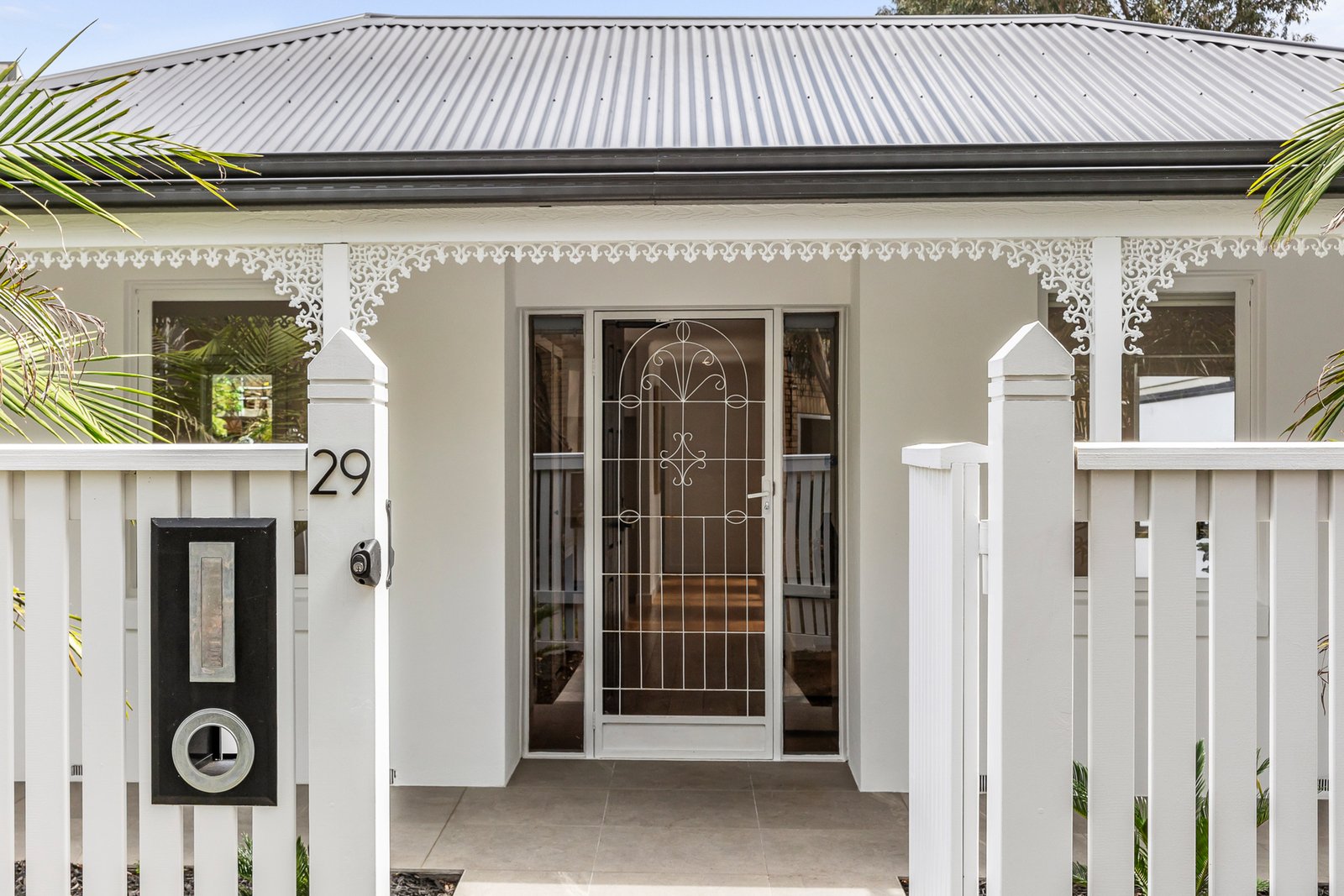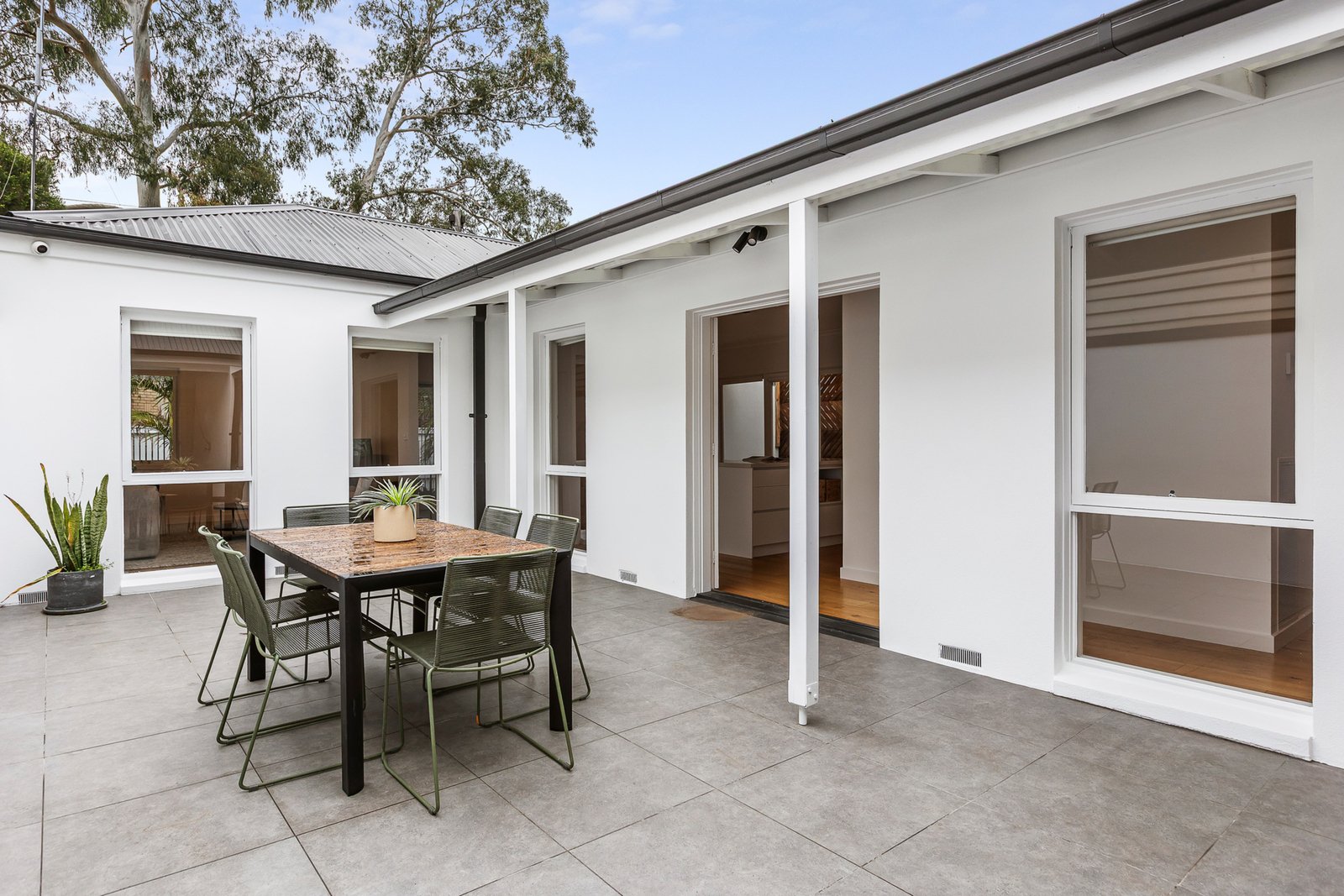 Inside, soaring ceilings, polished timber floors, and a neutral palette showcase a quality renovation, while original, timeless features have been thoughtfully retained to create a warm and sophisticated atmosphere. Well-zoned off a central hallway, the oversized living area and the first of three bedrooms are located at the front of the home, both featuring crisp finishes and enjoying bright morning sunlight. At the heart of the home, the sleek kitchen and dining area impress with stone benchtops, quality Smeg stainless steel appliances, generous storage, and a breakfast bar for casual meals.