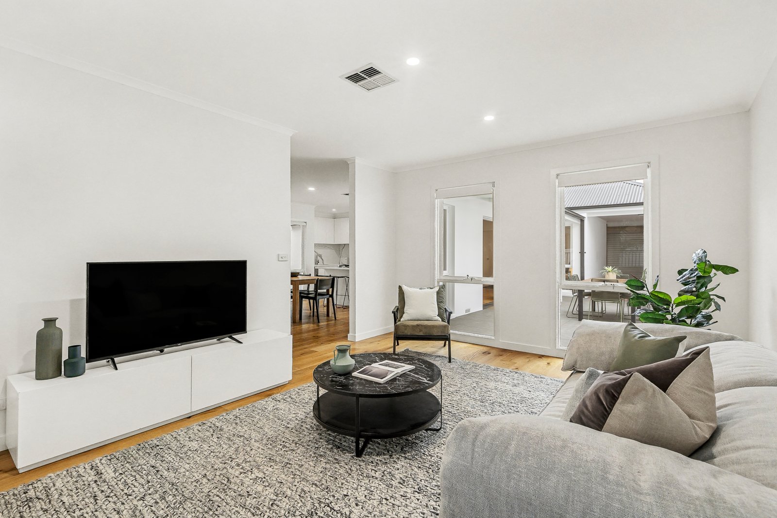 Accommodation is thoughtfully arranged, with two additional bedrooms located at the rear of the home, one fitted with built-in robes. The central bathroom offers everyday luxury with a freestanding bath, walk-in shower, and designer fittings. A separate toilet within the full laundry enhances the home’s practicality. Additional features include central ducted heating/cooling and wired security cameras.