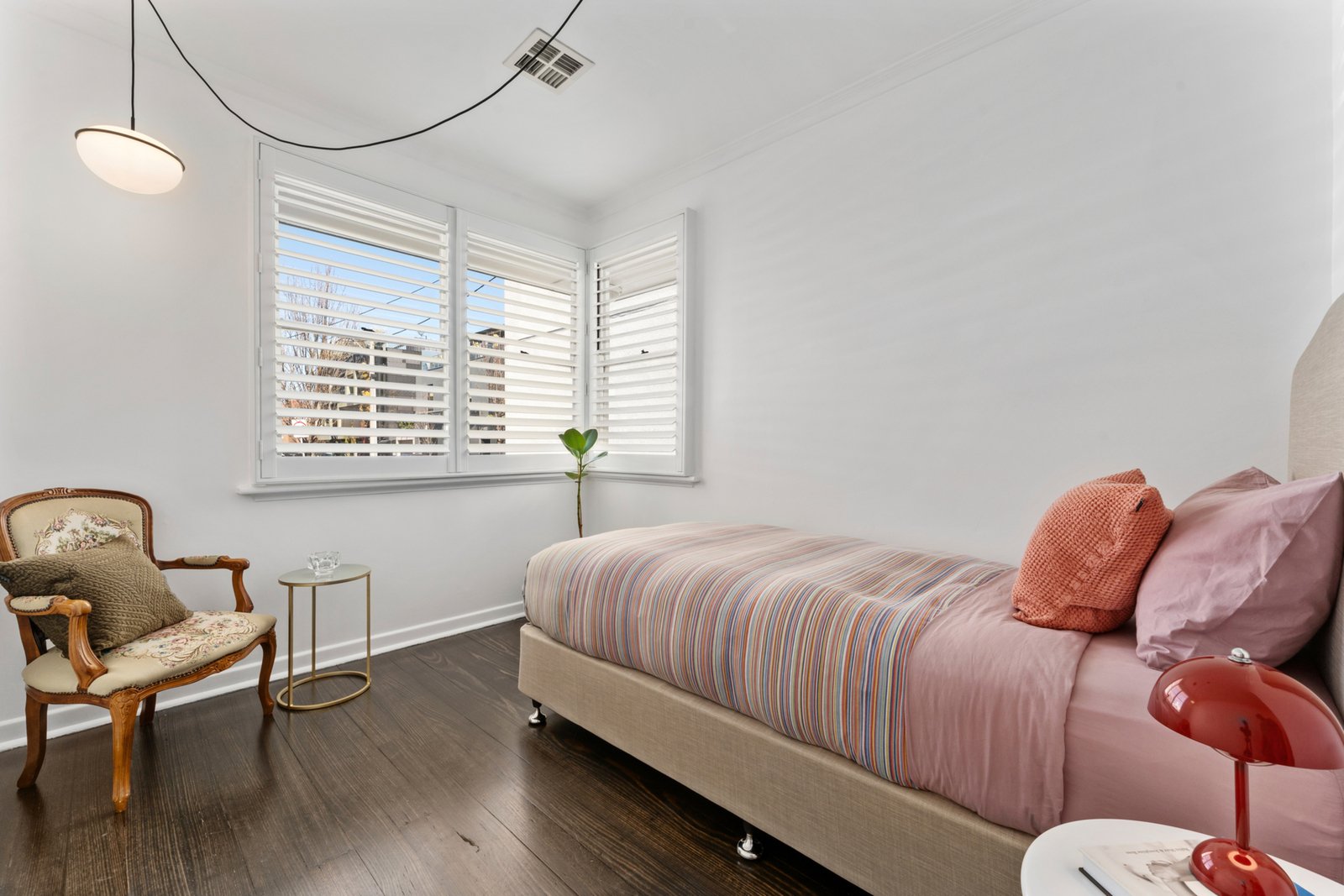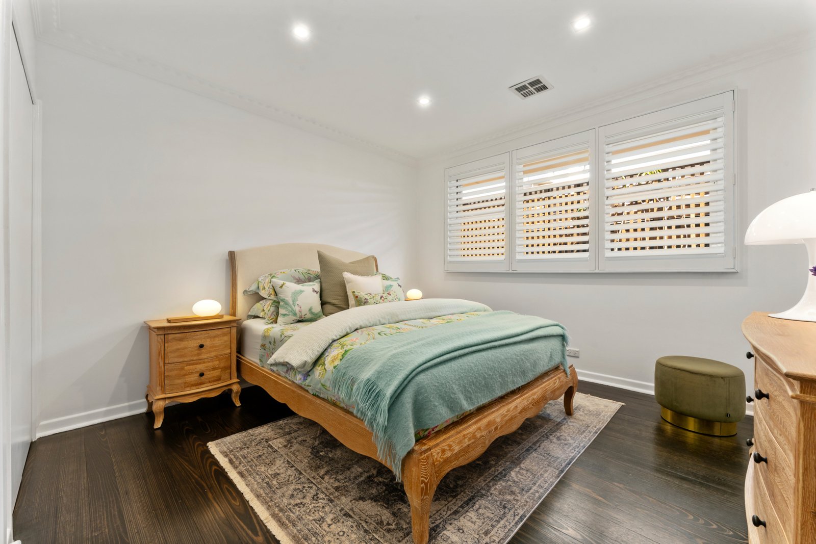 Three generous bedrooms, two with built-in robes, are serviced by a sleek modern bathroom with rainfall shower plus the added convenience of a central powder room/second WC. Comfort is assured with zoned ducted heating and cooling, while dark stained timber floors, clever storage solutions, and superb natural light elevate the home’s interior appeal.