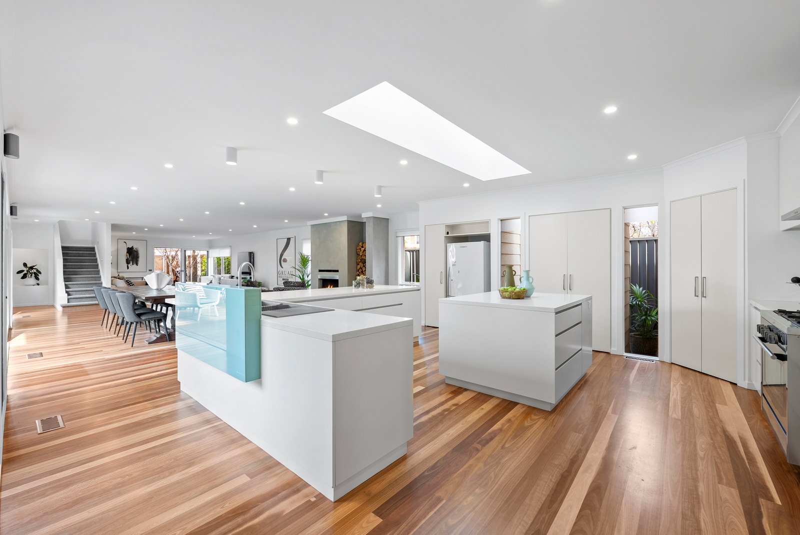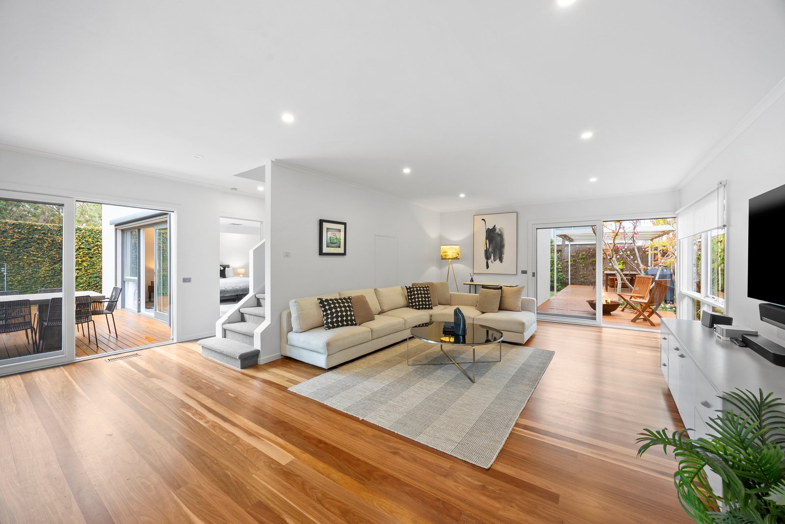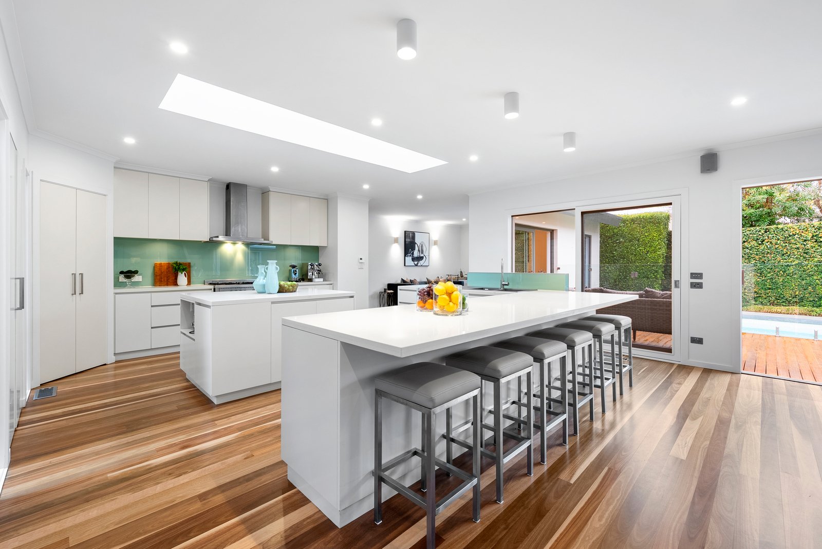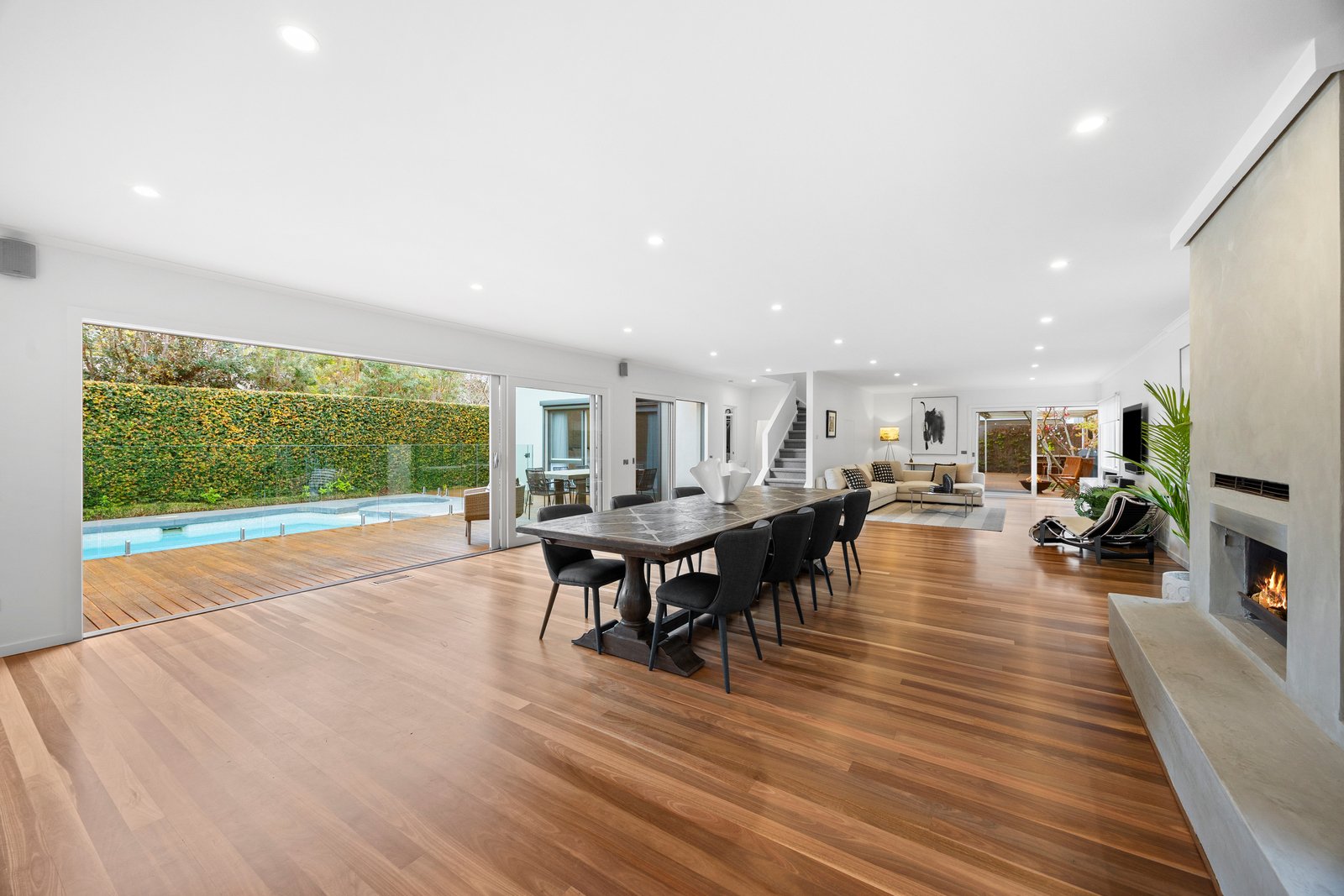Footsteps from the foreshore, this four bedroom, three bathroom sanctuary opens to wide, timber-lined halls where sunlight streams through skylights, light wells, and a northern wall of glass, animating the interiors and framing the sparkling pool as the day unfolds in shifting light.