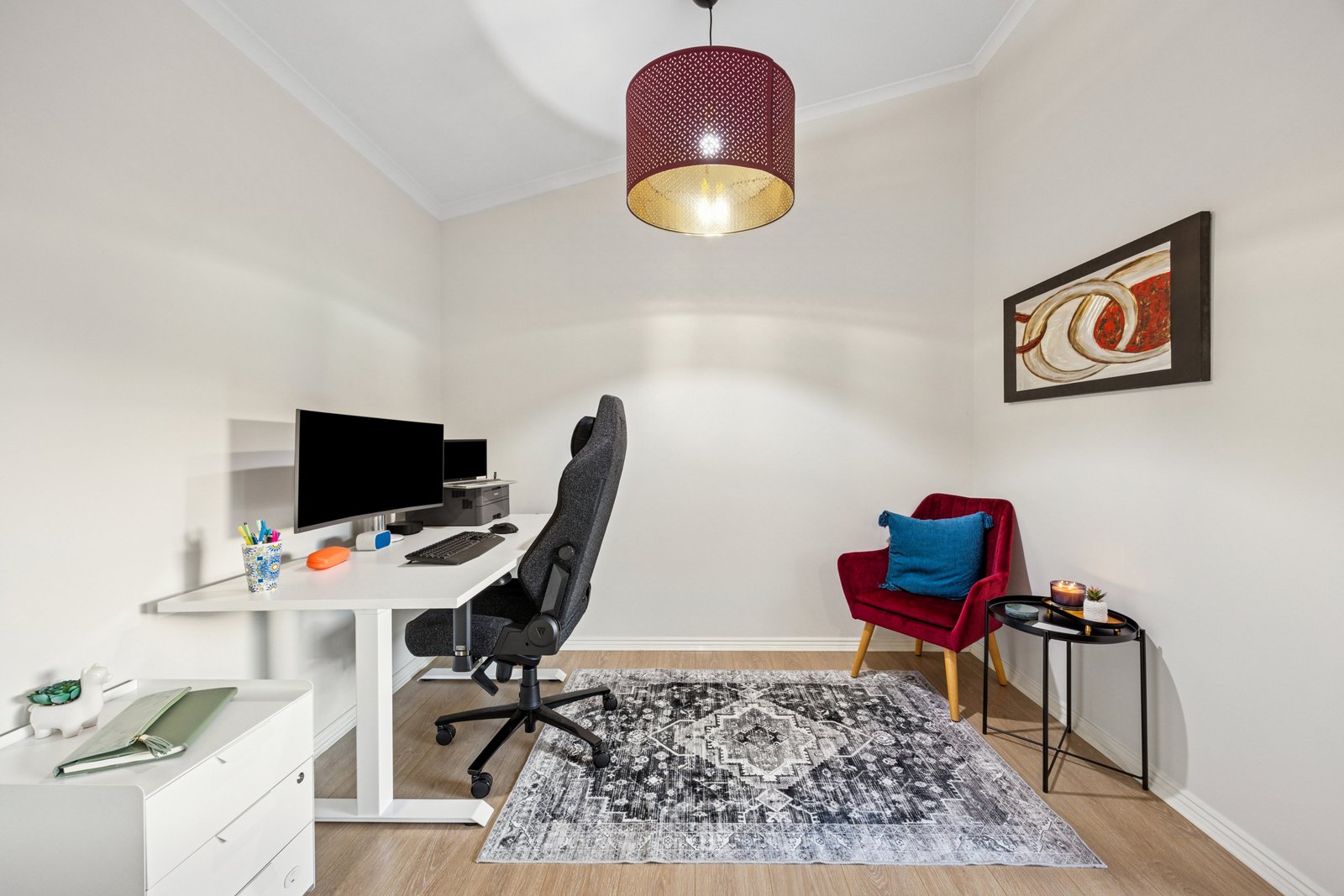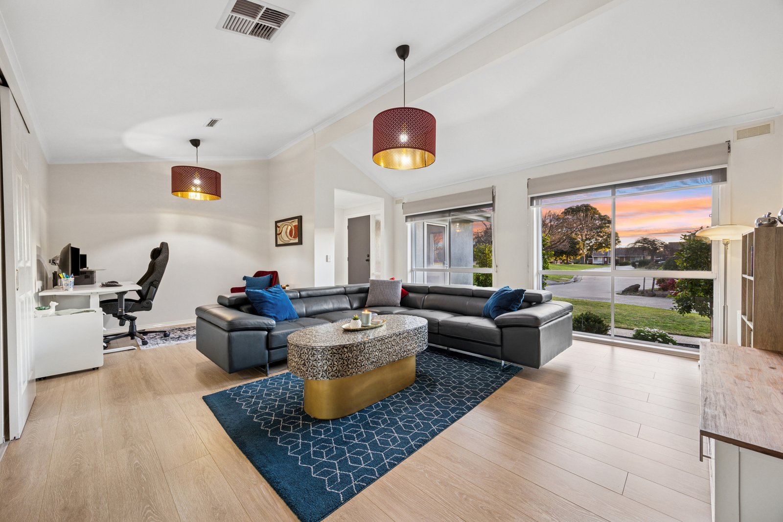 A sheltered porch gives secure entry to the home, which features a large light-filled living room set beneath a lofty pitched ceiling. A study zone here is ideal for those who work from home, while the generous dining zone is ideally placed for entertaining alongside a bright garden-view kitchen.