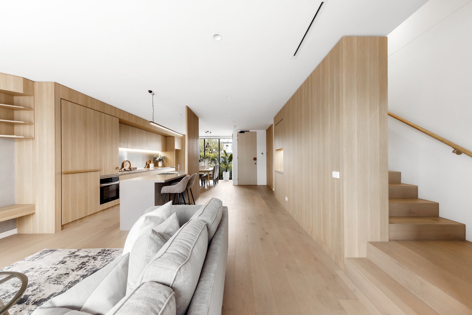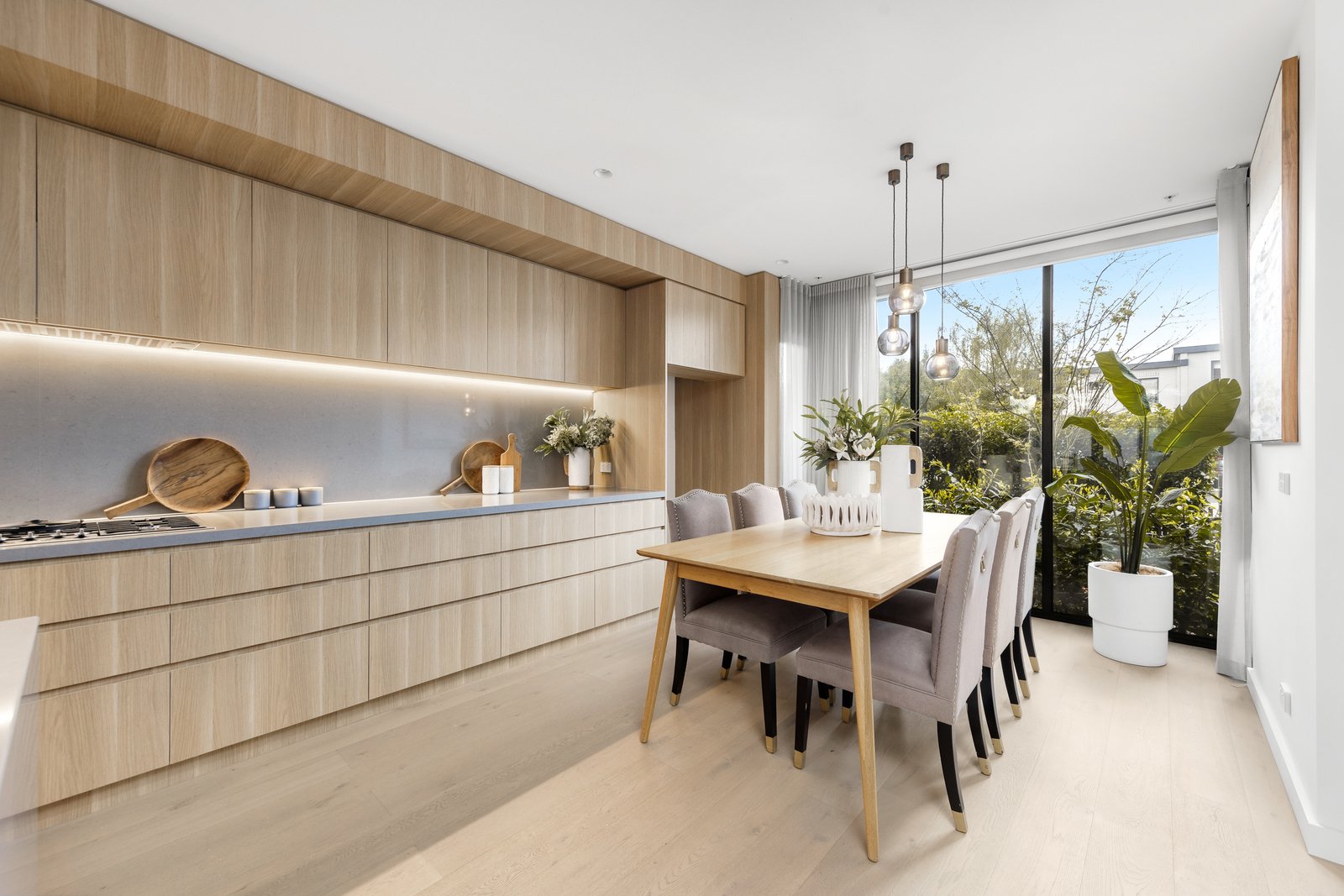 Spread across four thoughtfully designed levels and connected by a private lift, this home showcases architectural sophistication and refined interiors. The ground floor presents an open-plan living and dining domain framed by floor-to-ceiling windows and complemented by a gourmet kitchen featuring a long stone island, premium appliances, and custom cabinetry. Flowing seamlessly outdoors, the private terrace is the perfect place to start your day with a coffee, relax in the afternoon sun, or entertain with ease.