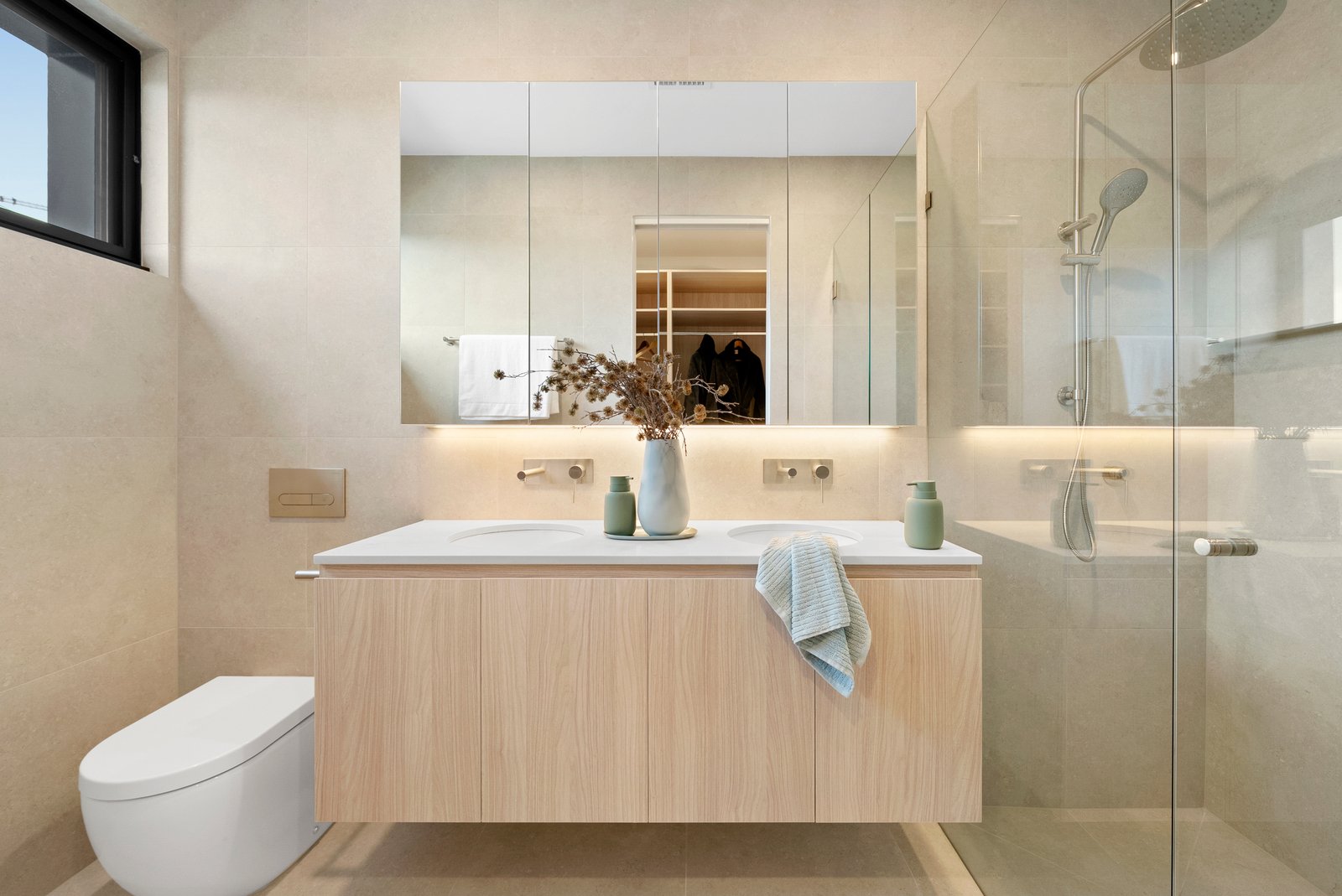 Upstairs, exclusivity continues with a serene retreat or home office and a sumptuous master suite with walk-in robe and luxe ensuite. Two further bedrooms share a designer bathroom highlighted by a soaking tub set against full-height tiling.