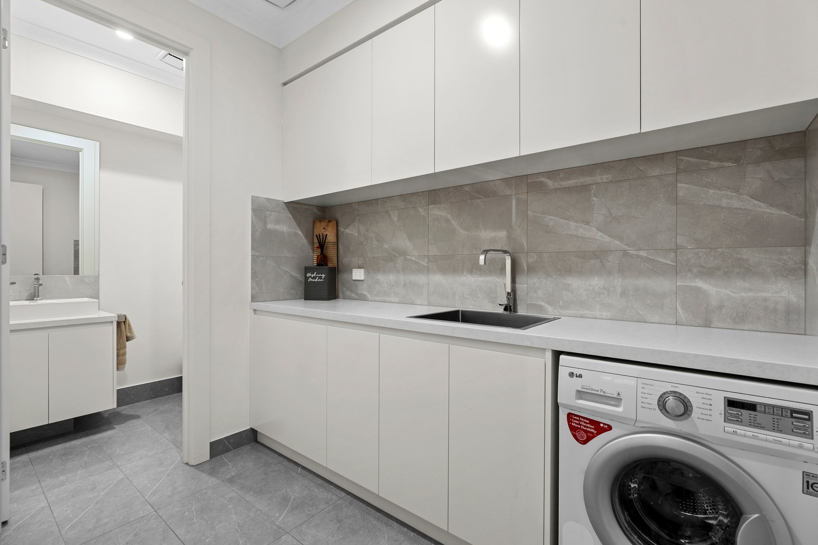 Welcomed by a manicured façade, the home boasts a vast lounge and dining room opening onto wrap around gardens that are zoned for entertaining on the deck and playing on the grass. Overlooked by a kitchen that’s appointed with 900mm gas cooking, dishwasher and the resilience of stone and glass surfaces. Handily flanked by a butler’s pantry (with an additional gas cooktop) to one side and a fitted laundry with powder room to the other.