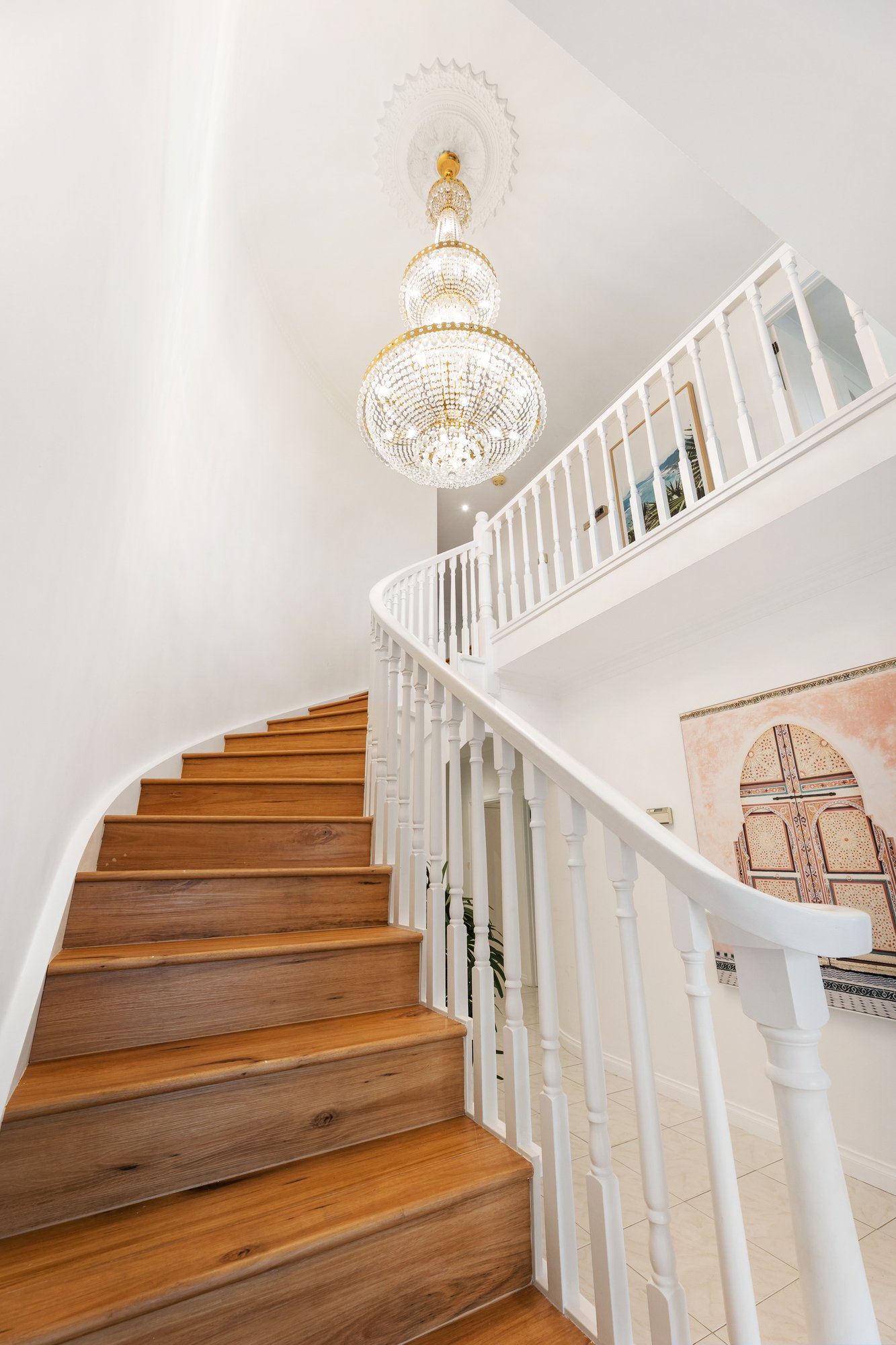A true statement of timeless European elegance, the home has been immaculately maintained and freshly painted throughout, showcasing grand architectural features such as curved glass windows, a striking three-tier chandelier above the central staircase, and four balconies adorned with traditional terracotta tiling. From the moment you arrive, the manicured, landscaped gardens and commanding façade evoke the charm and romance of a Tuscan villa.