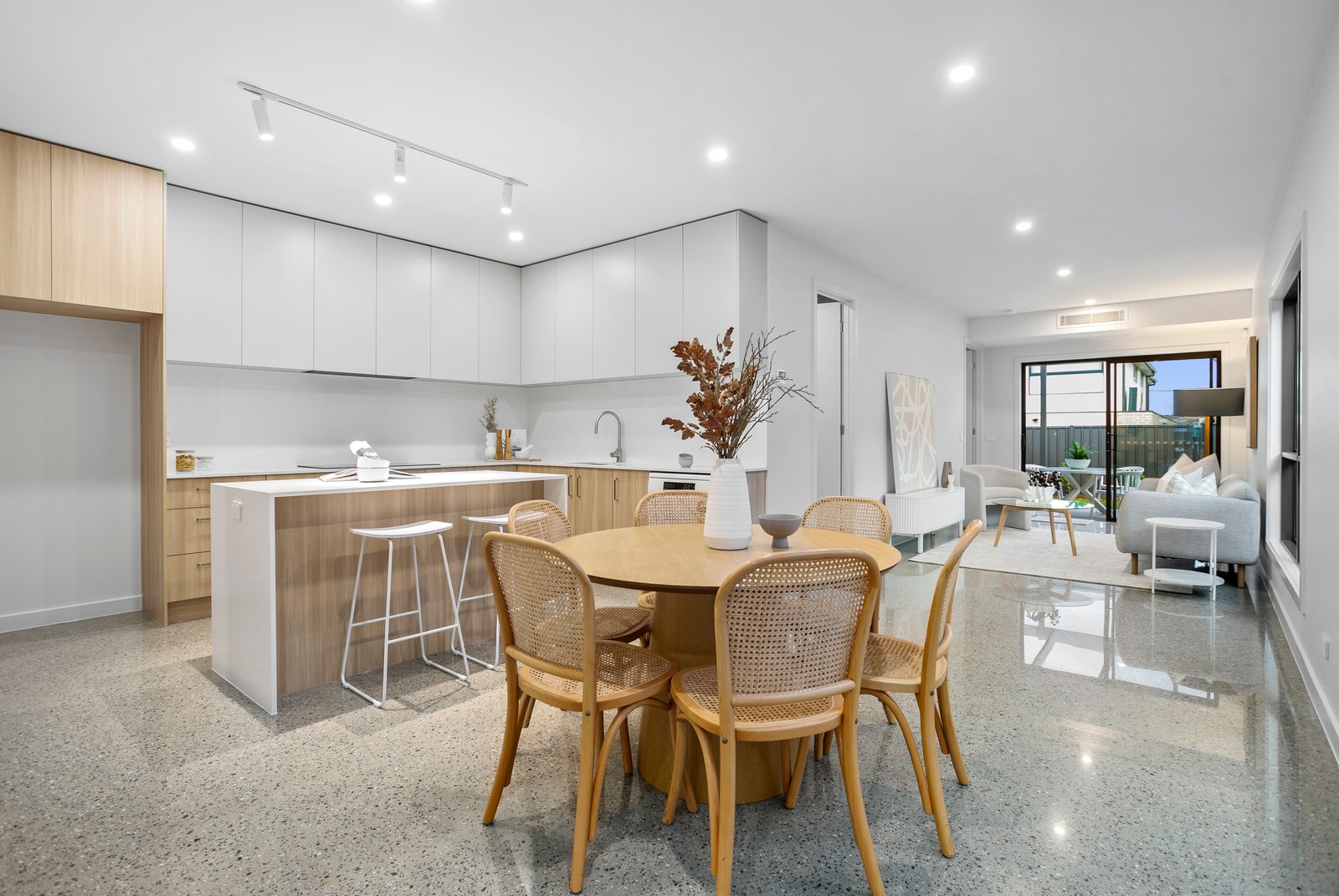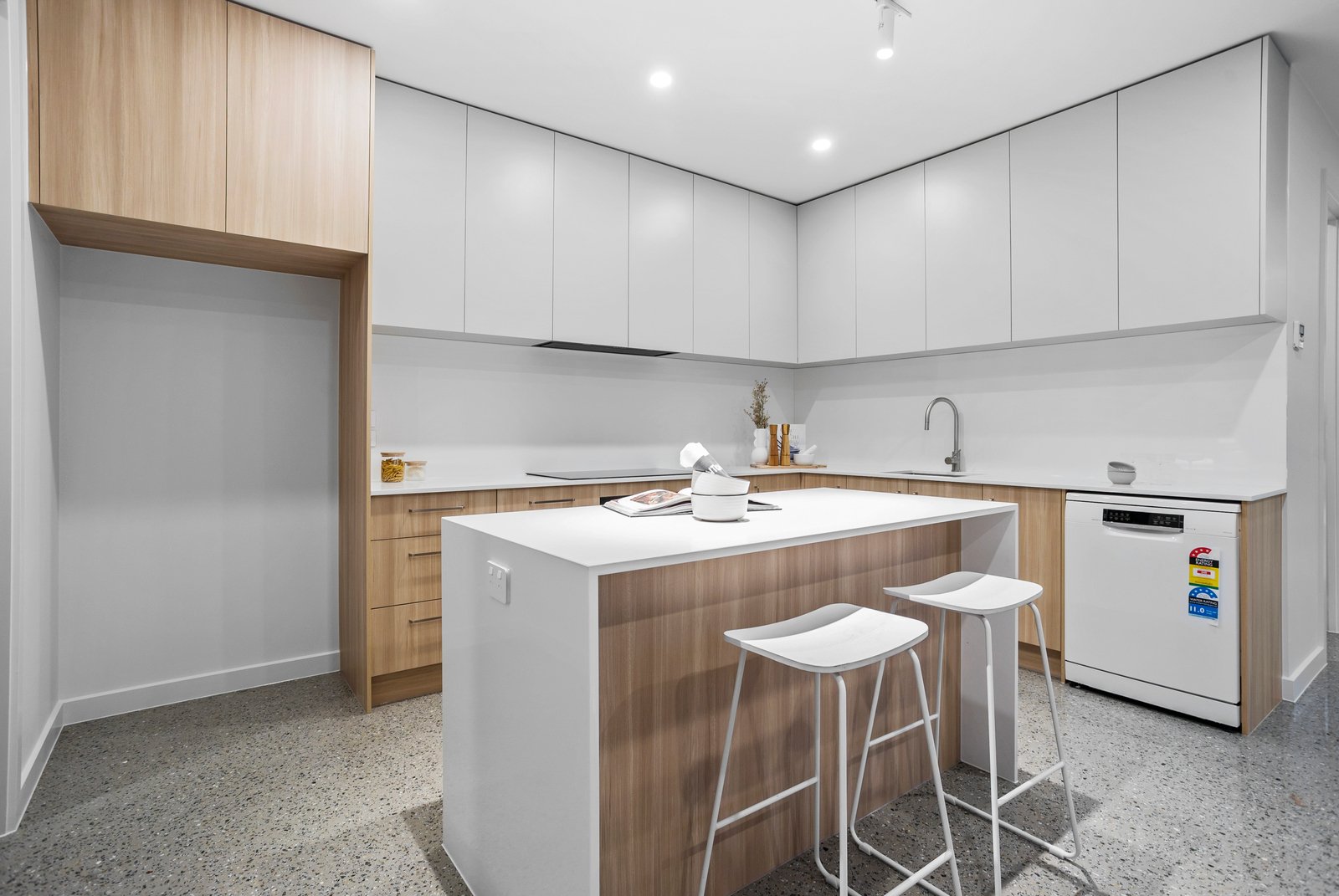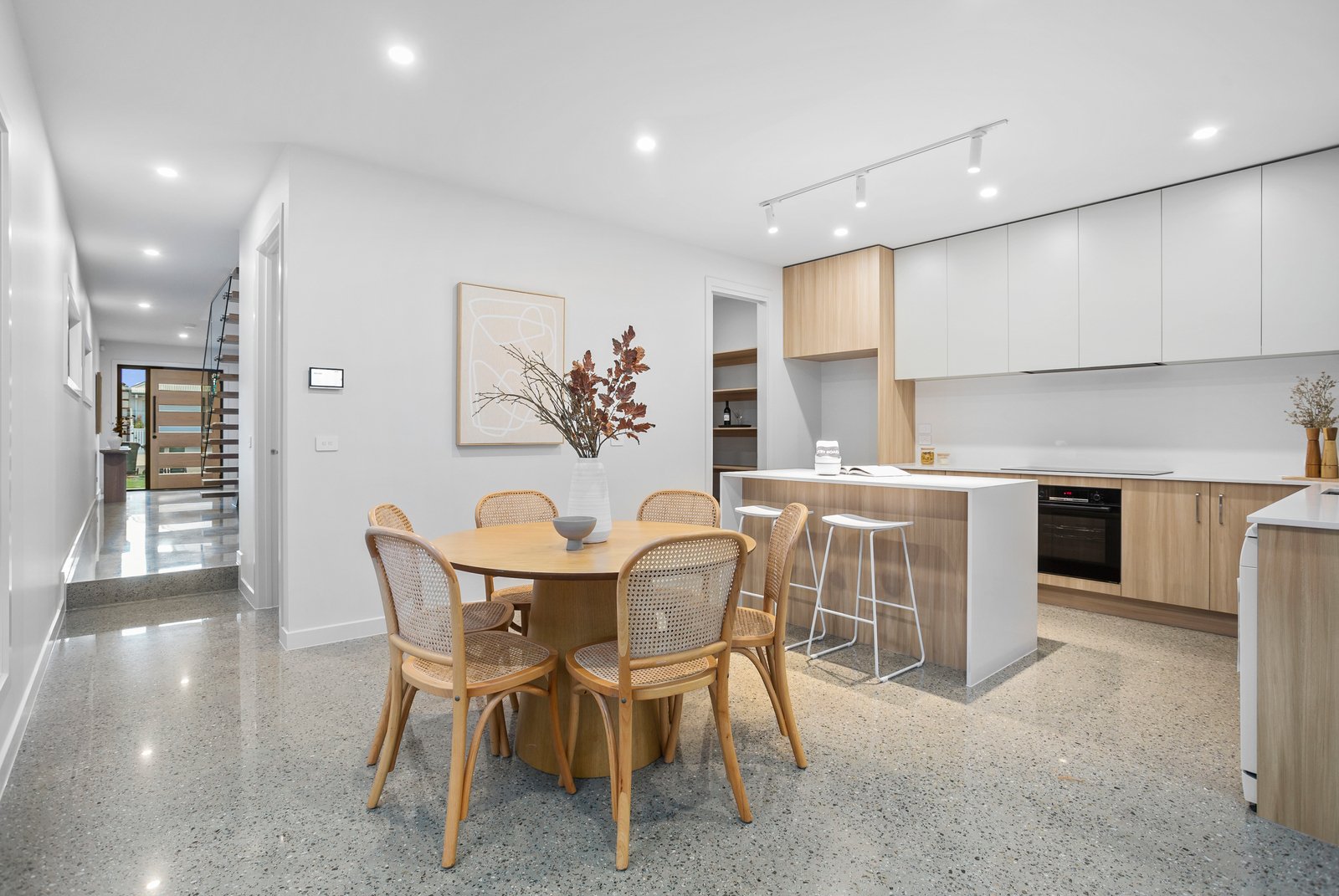Step into the ground floor where stunning polished concrete anchors an expansive open-plan kitchen, living, and dining domain flooded with natural light. The culinary masterpiece showcases luxe oak timber cabinetry, pristine white stone benchtops, sleek overhead storage, and a statement island bench - complete with premium Bosch appliances including induction cooktop, under-bench electric oven, and dishwasher. A generous walk-in pantry ensures effortless organisation, while a versatile bedroom with built-in robe and semi-ensuite provides flexible accommodation. The full-sized laundry adds everyday convenience, and seamless glass sliders open from the living area to your fully landscaped courtyard - perfect for relaxed entertaining with established lawn and garden shed. Single garage with internal access plus extra driveway parking complete the ground level.