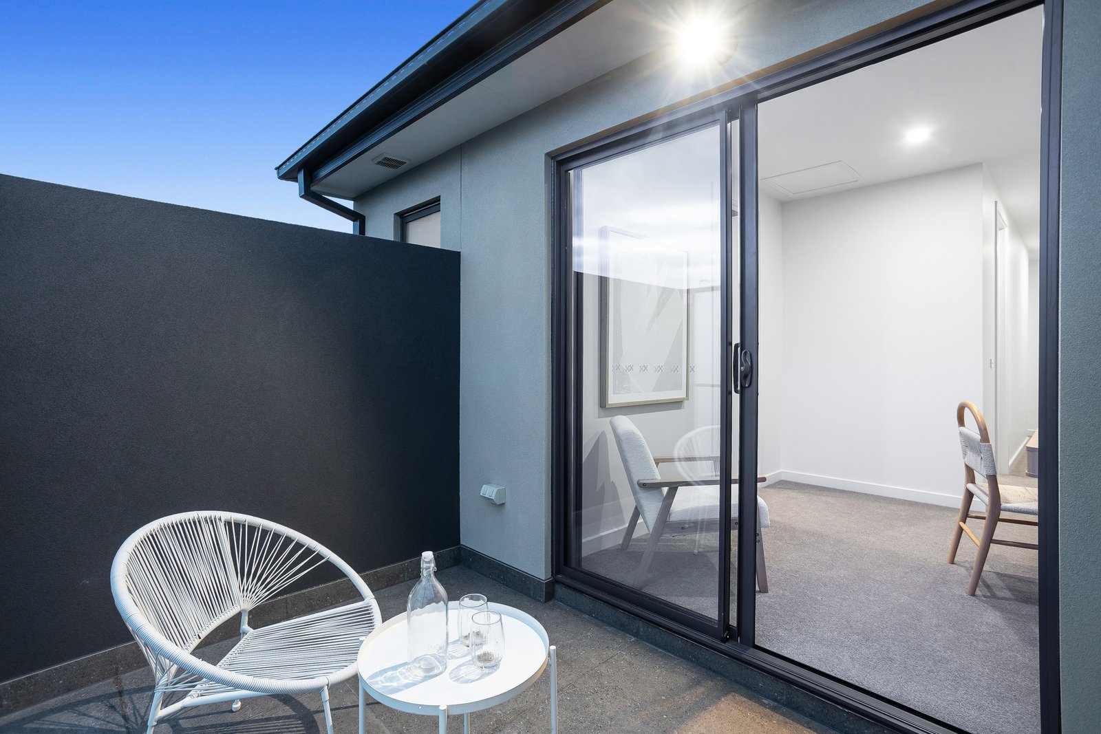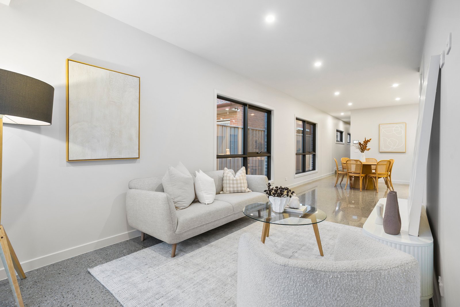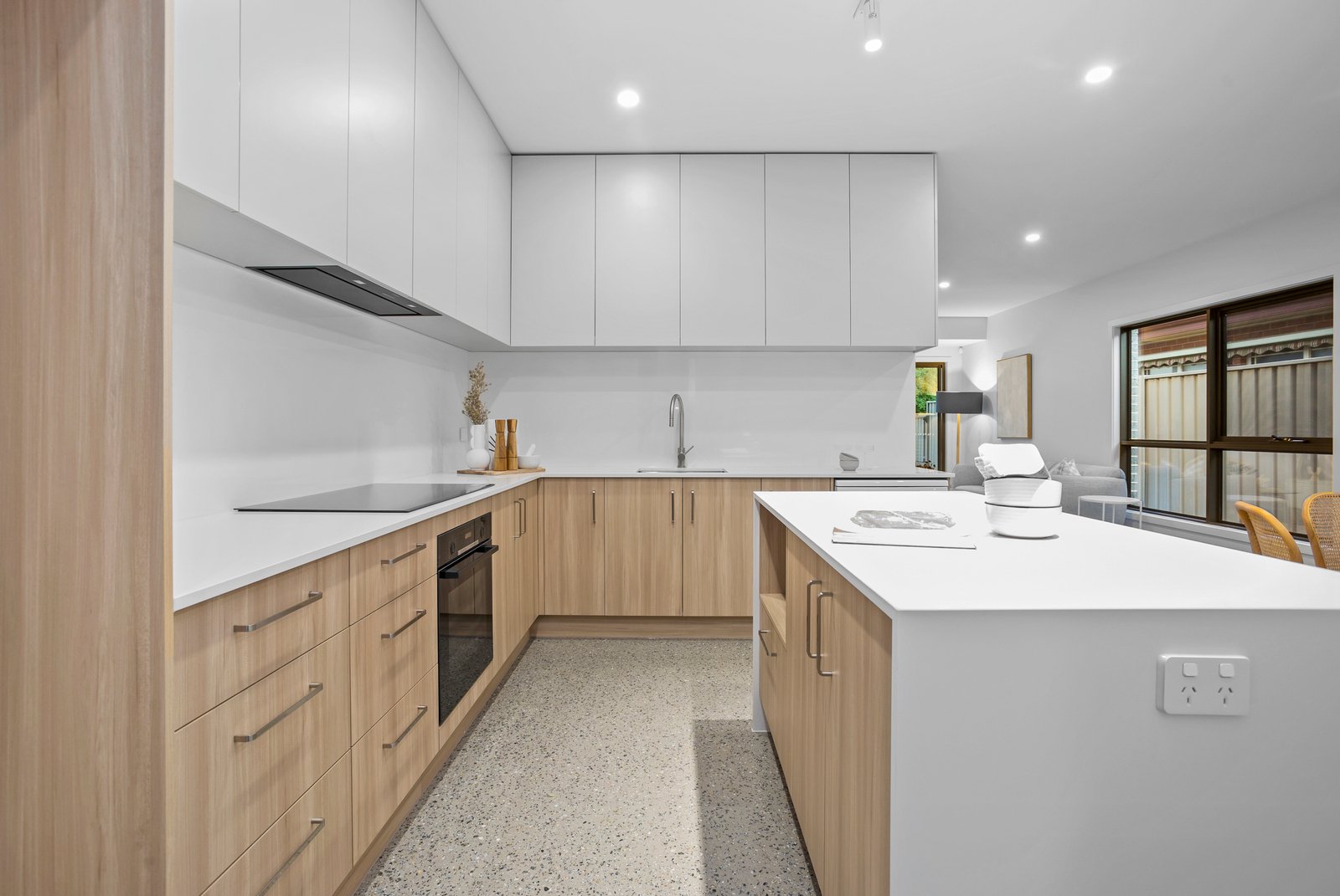 Step into the ground floor where stunning polished concrete anchors an expansive open-plan kitchen, living, and dining domain flooded with natural light. The culinary masterpiece showcases luxe oak timber cabinetry, pristine white stone benchtops, sleek overhead storage, and a statement island bench - complete with premium Bosch appliances including induction cooktop, under-bench electric oven, and dishwasher. A generous walk-in pantry ensures effortless organisation, while a versatile bedroom with built-in robe and semi-ensuite provides flexible accommodation. The full-sized laundry adds everyday convenience, and seamless glass sliders open from the living area to your fully landscaped courtyard - perfect for relaxed entertaining with established lawn and garden shed. Single garage with internal access plus extra driveway parking complete the ground level.