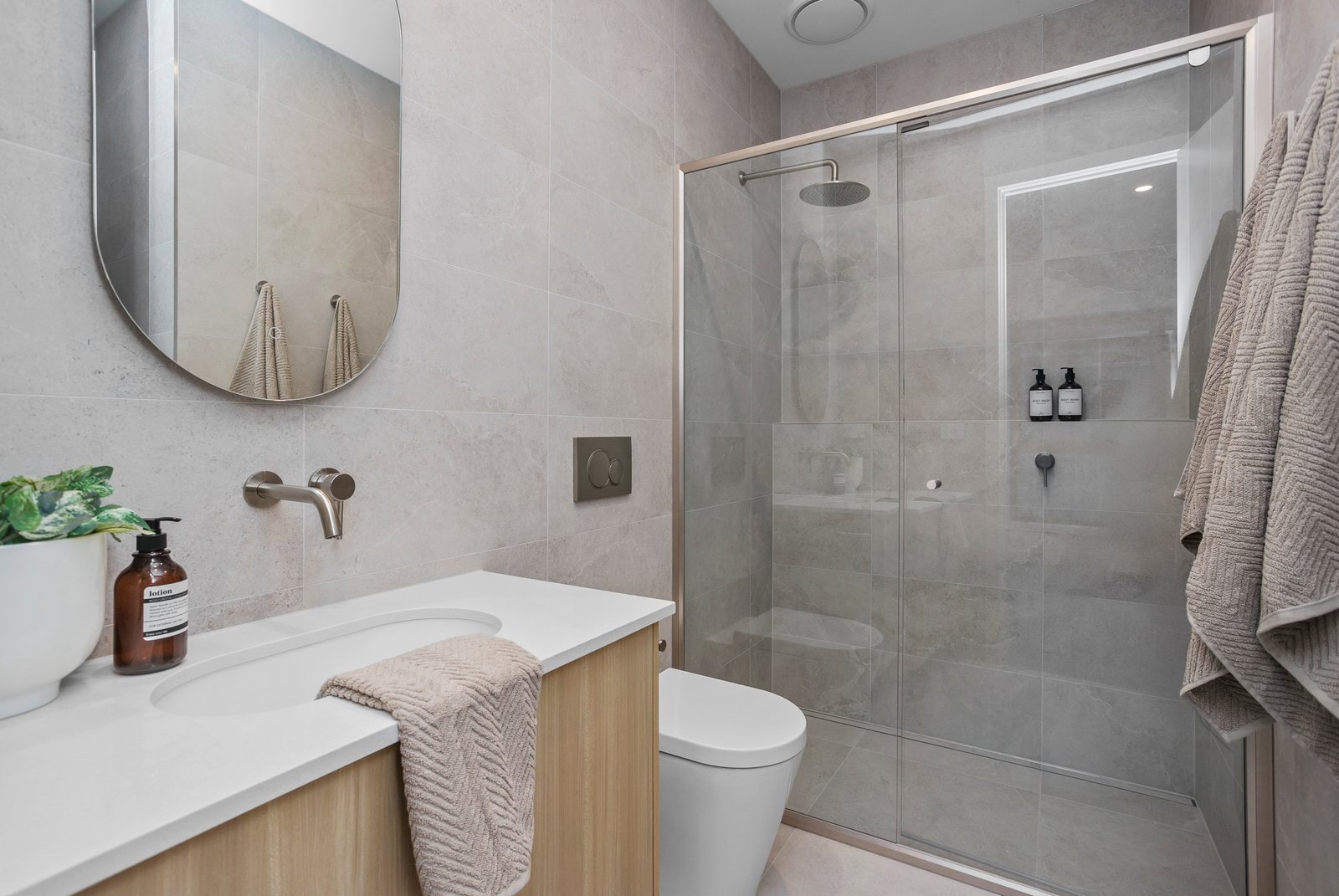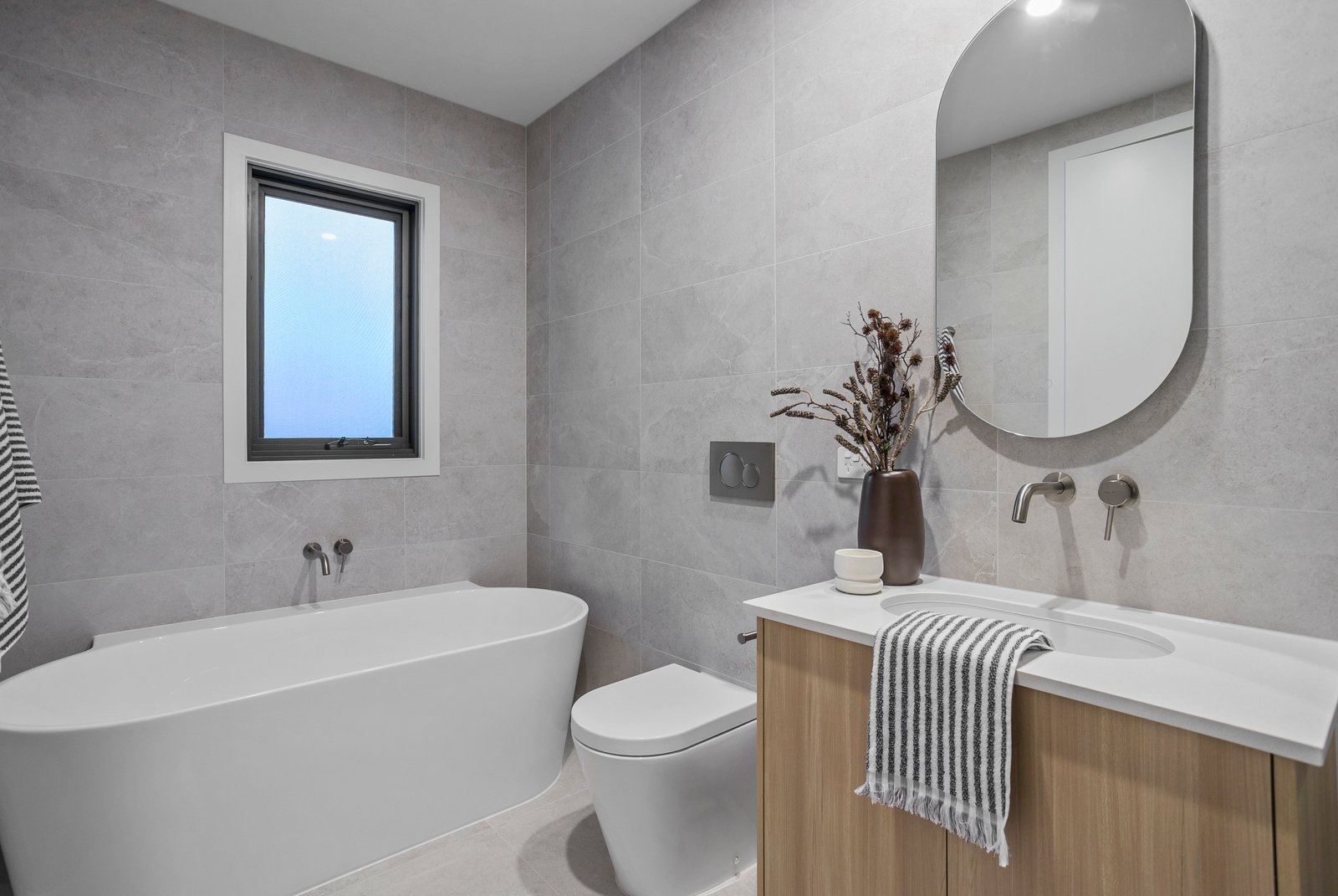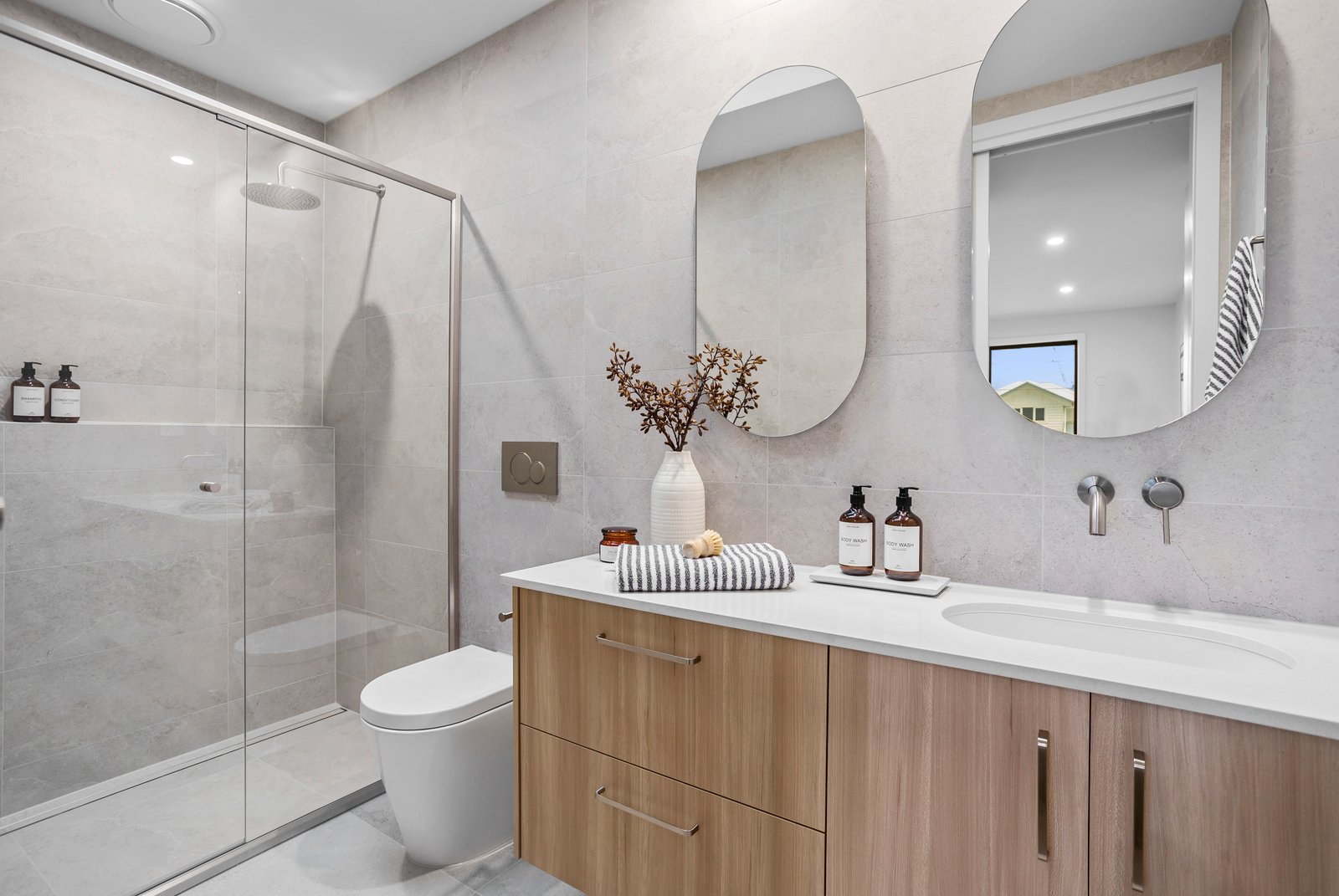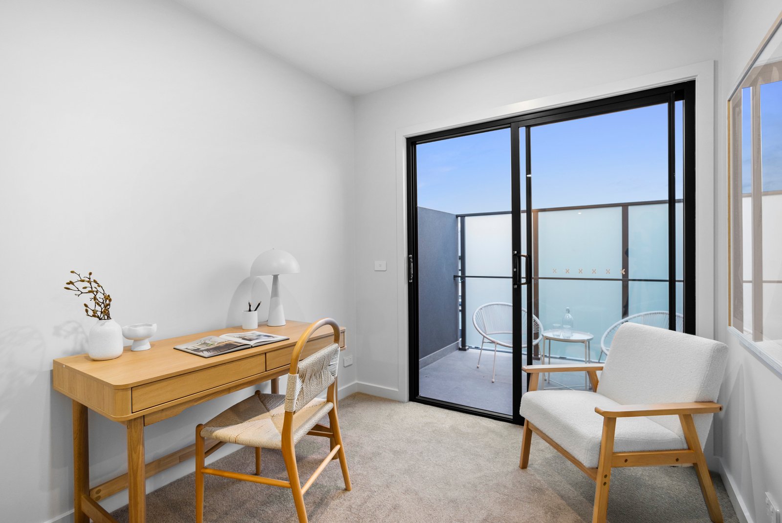 Ascend the elegant timber staircase to discover plush carpeted comfort across the first floor. The luxurious master suite boasts a walk-in robe and sophisticated ensuite, while a second bedroom offers built-in storage. The stylish family bathroom echoes the home's premium aesthetic with oak cabinetry, white stone, and designer grey floor-to-ceiling tiles, complemented by chic oval medicine cabinets. A private study opens onto your own balcony retreat - the perfect work-from-home sanctuary.