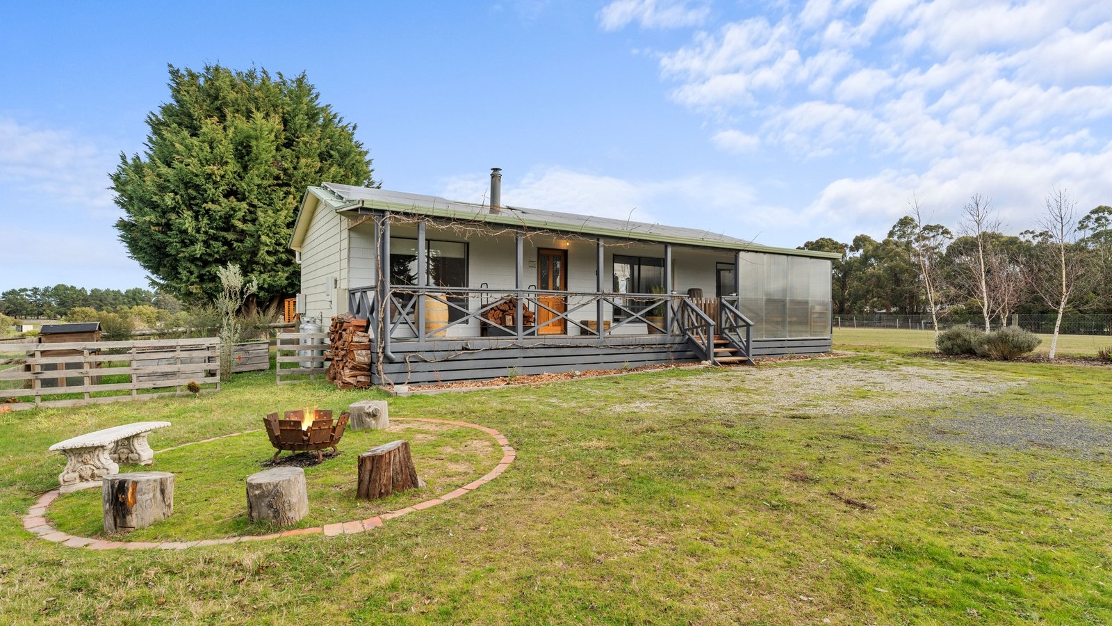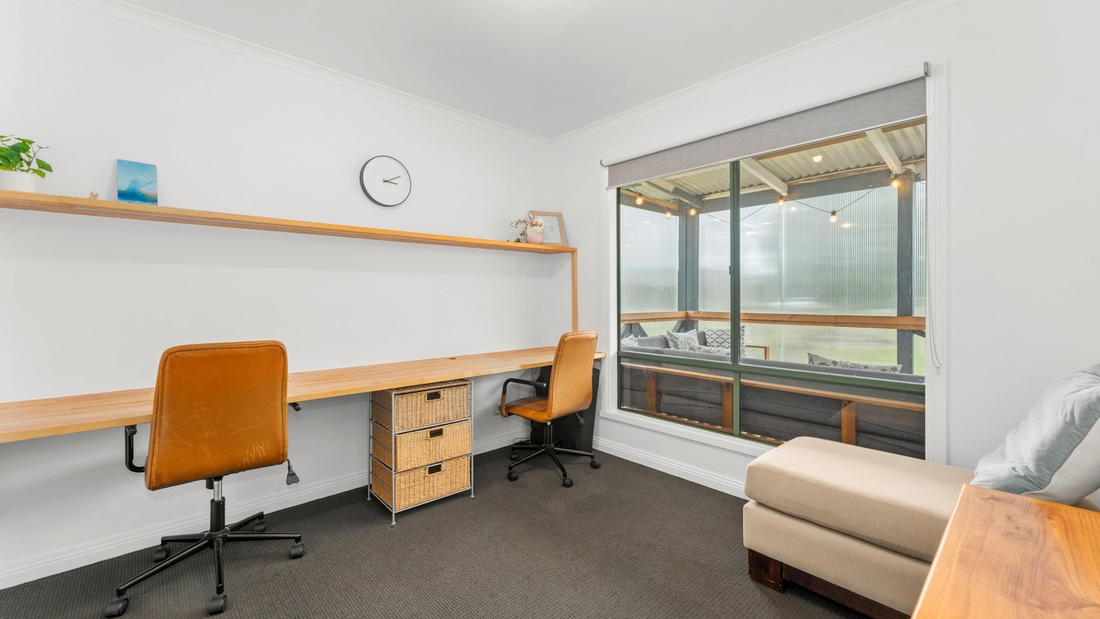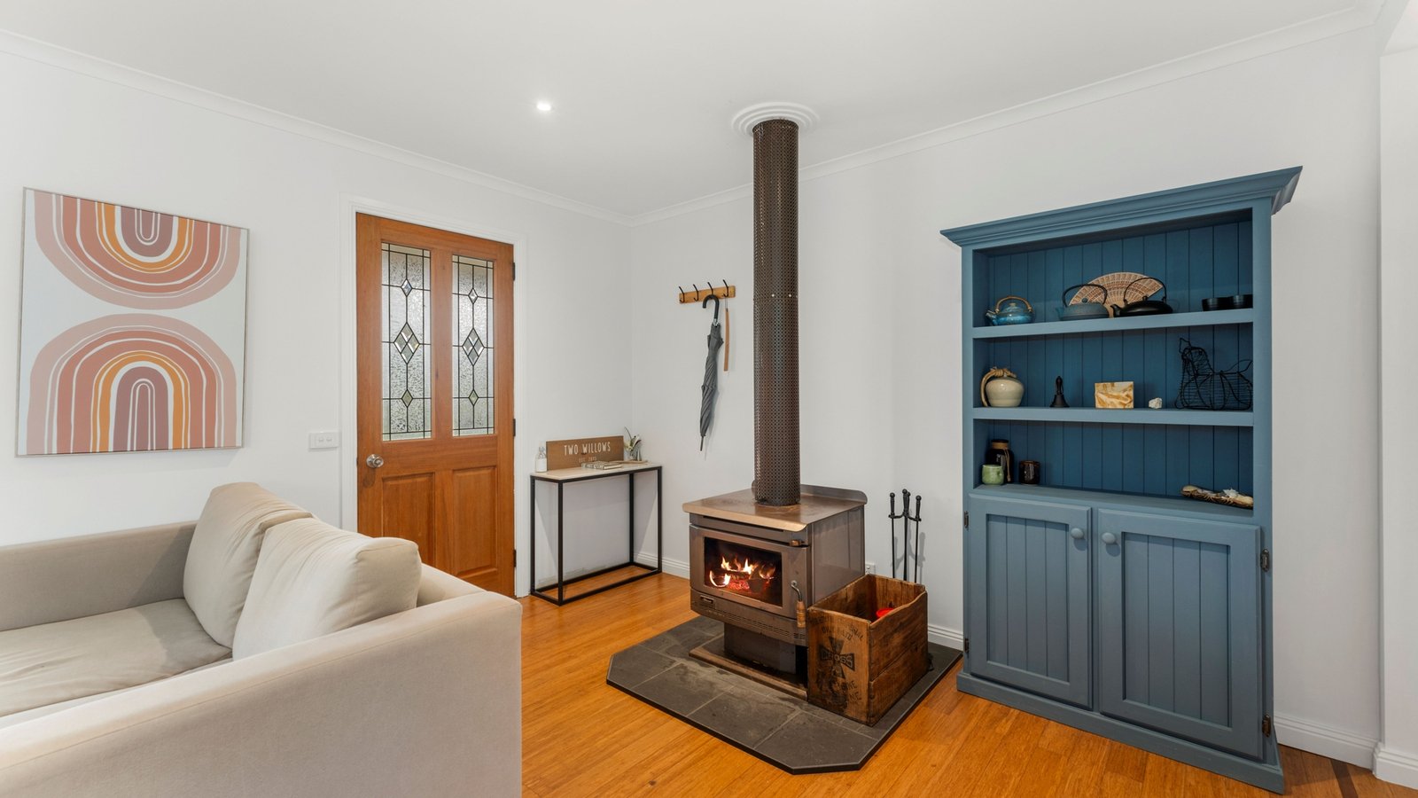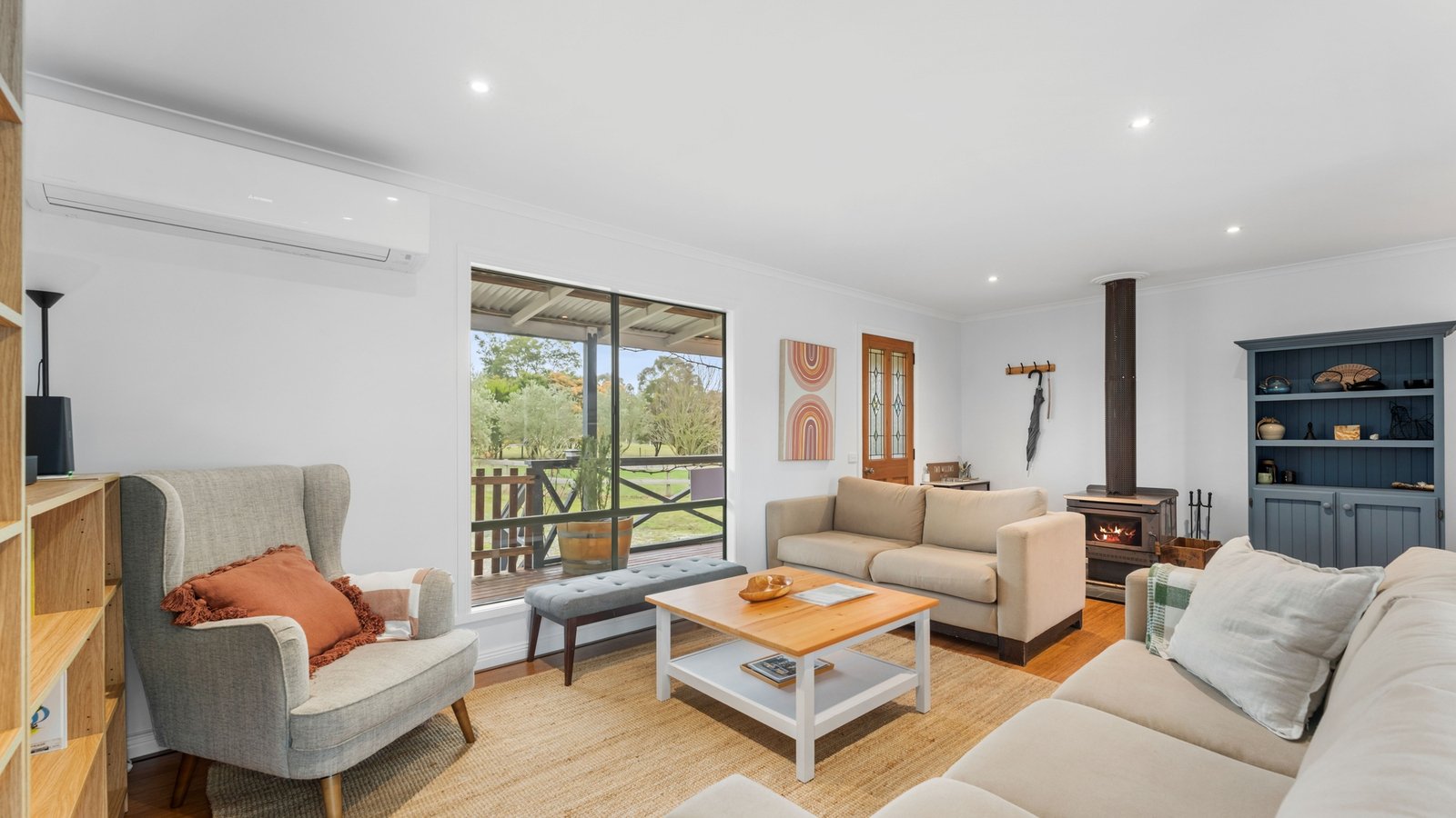 The heart of the home lies in the open plan living area warmed by a wood fire and a split system for year-round comfort. The kitchen features stunning views out to the surrounding paddocks and includes and electric oven stove and built in pantry.