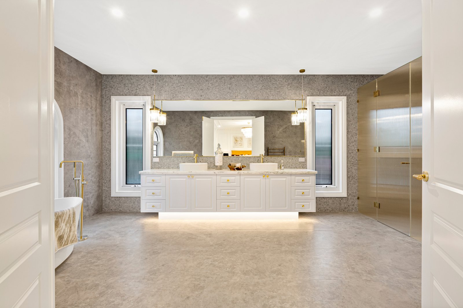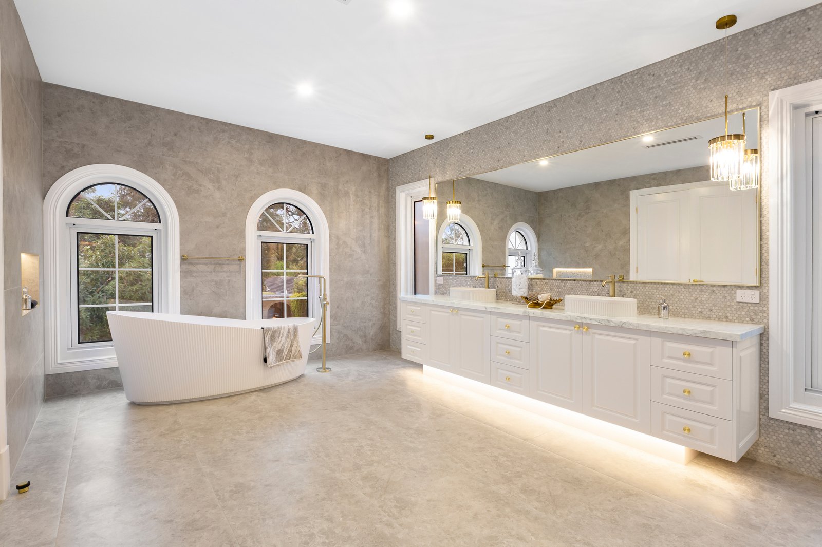 The on-trend selections enhance the modern interpretation of the French Provincial style, including fluted showers, basins and bath, brushed gold tapware, and soft neutral tones for a sense of calm.
