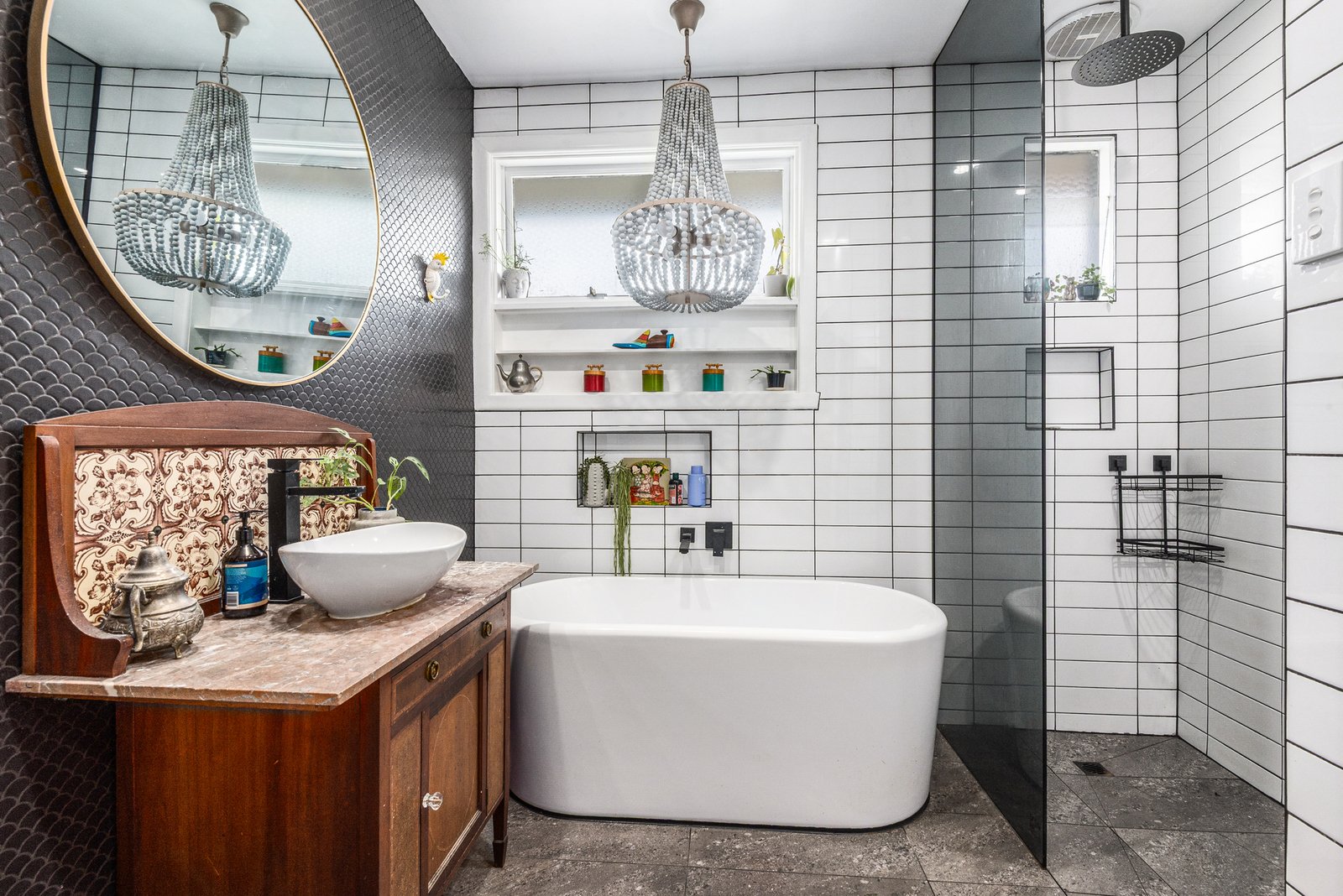 Comprising four bedrooms, all include built-in robes, presented in tranquil colour palettes, the main with a stunning floral feature wall. The updated bathroom is finished in floor to ceiling tiles, with a striking fish scale feature-tile, freestanding bath, walk-in shower, magnificent pendant light, artisan timber vanity and chic black tapware. An additional wc and powder zone, ducted heating / refrigerated cooling and updated laundry with storage add to the thoughtfully designed functionality of the home.
