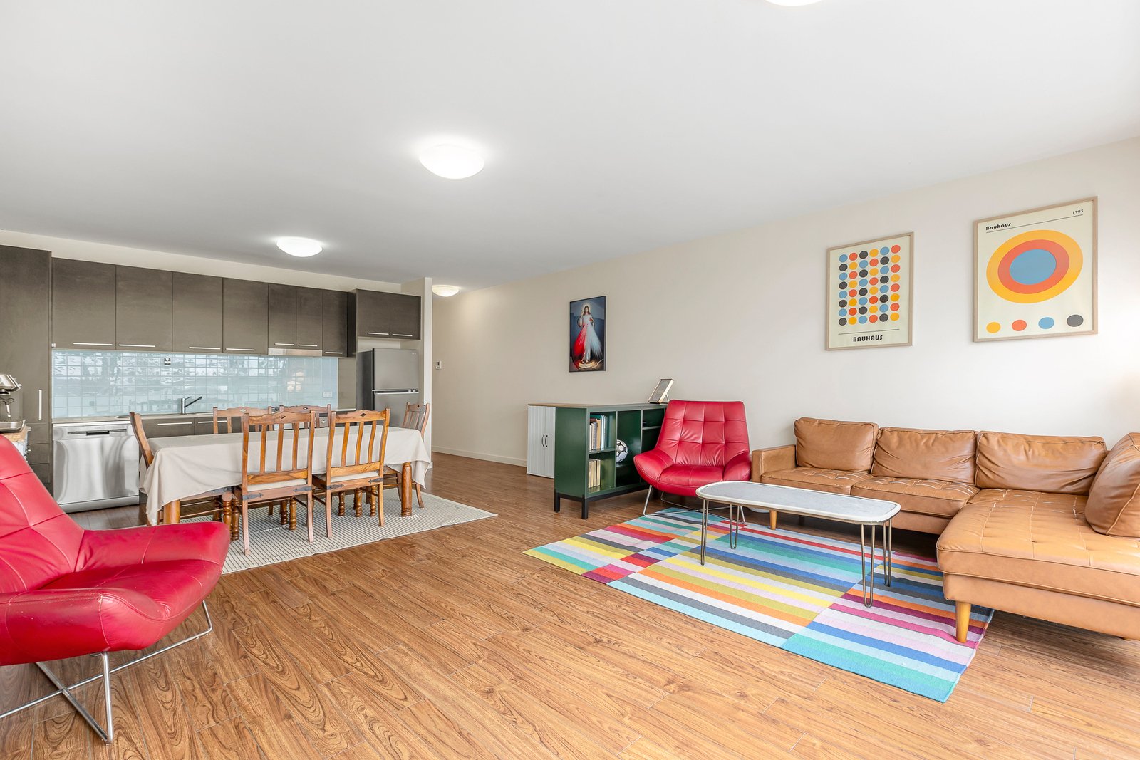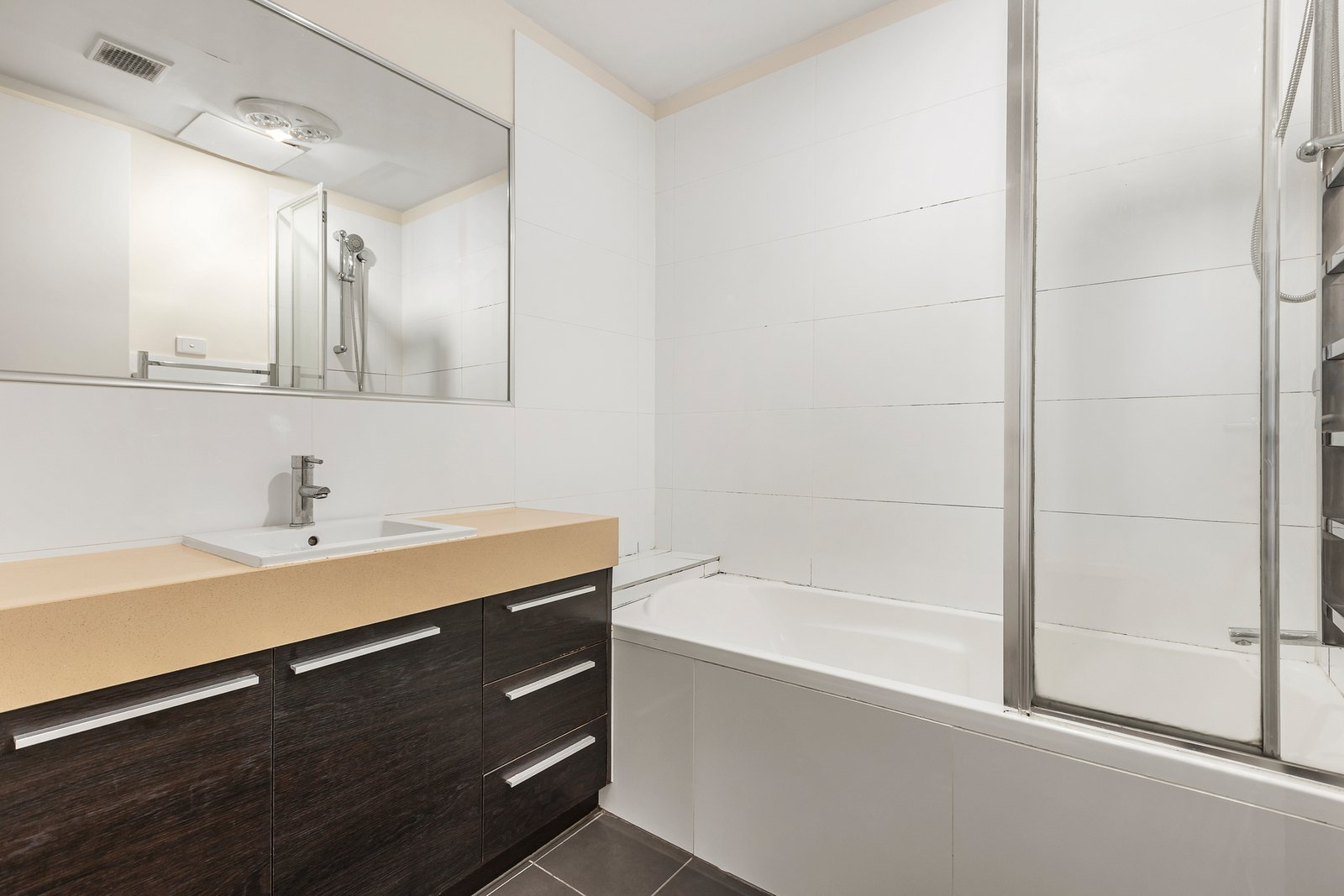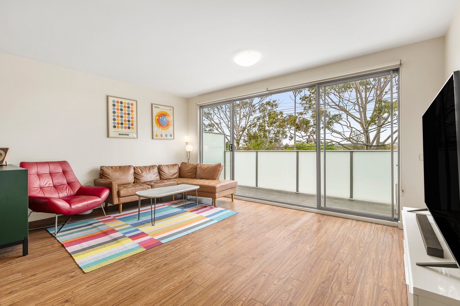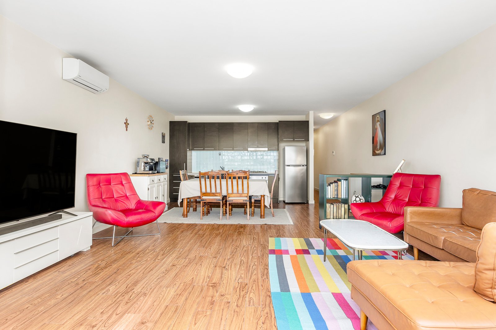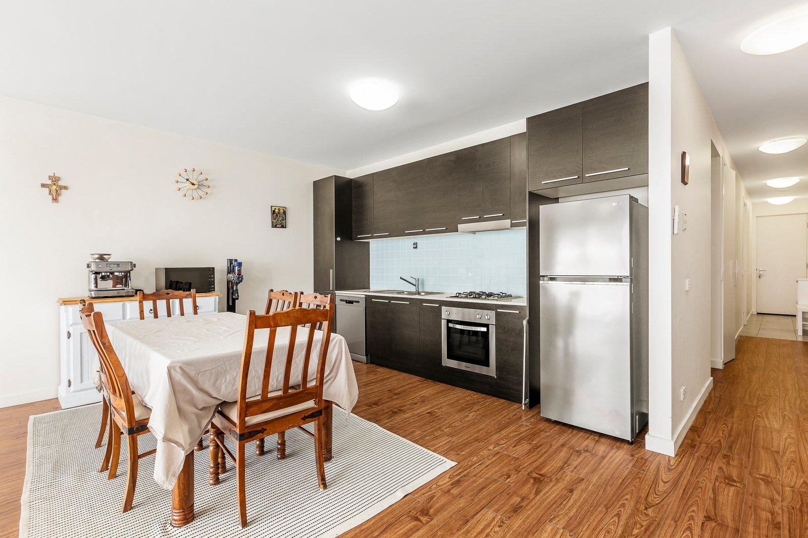 A bright open-plan living and dining area welcomes natural light through full-width glass doors, flowing to an expansive balcony that is perfect for year-round enjoyment. The kitchen impresses with stainless steel appliances, gas cooktop, integrated dishwasher, and ample storage solutions. Both bedrooms are sizeable with mirrored built-in robes, serviced by a central bathroom with separate toilet and European laundry. Additional features include split-system heating/cooling, video intercom entry, storage cage, and secure basement parking.