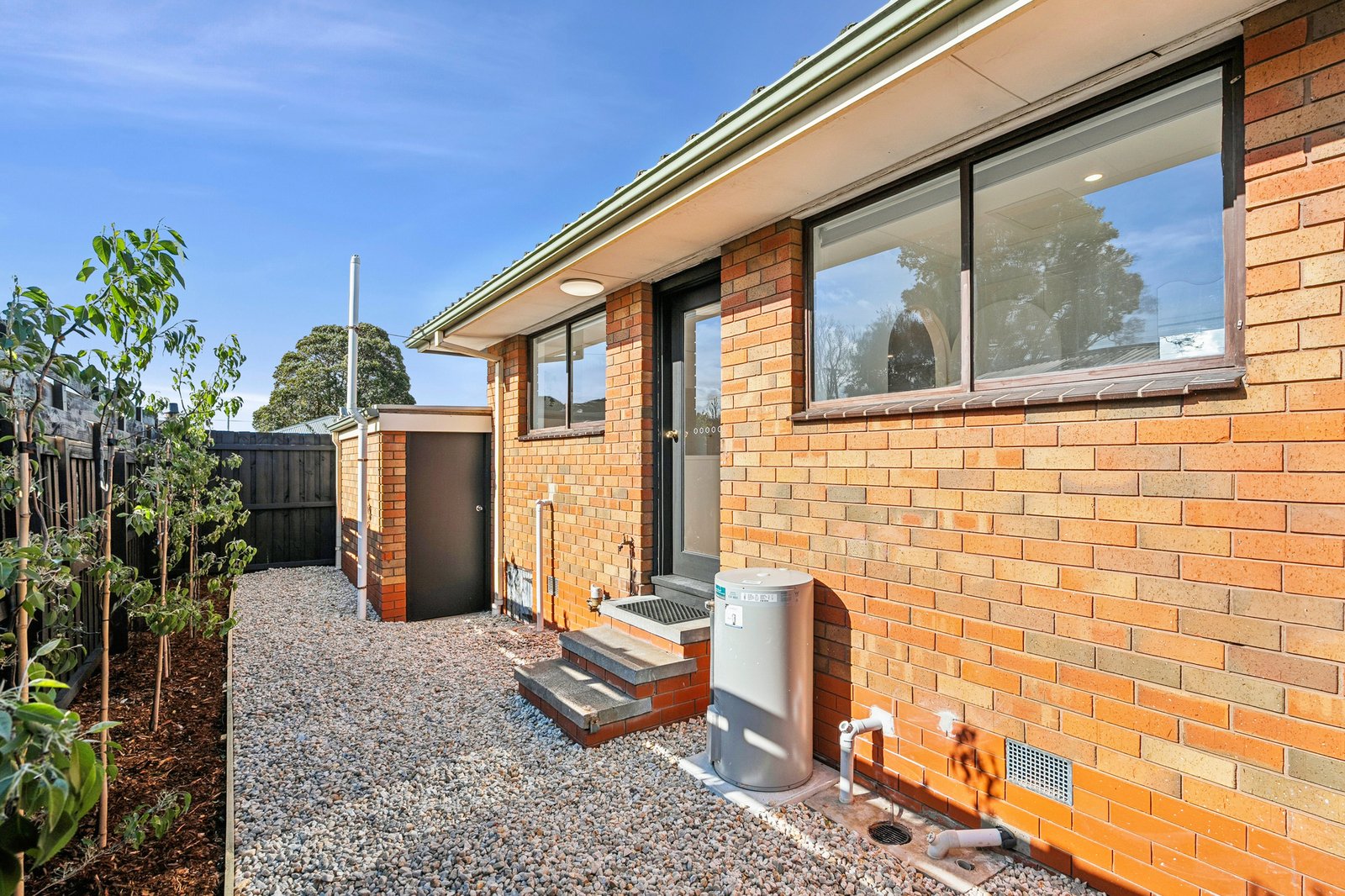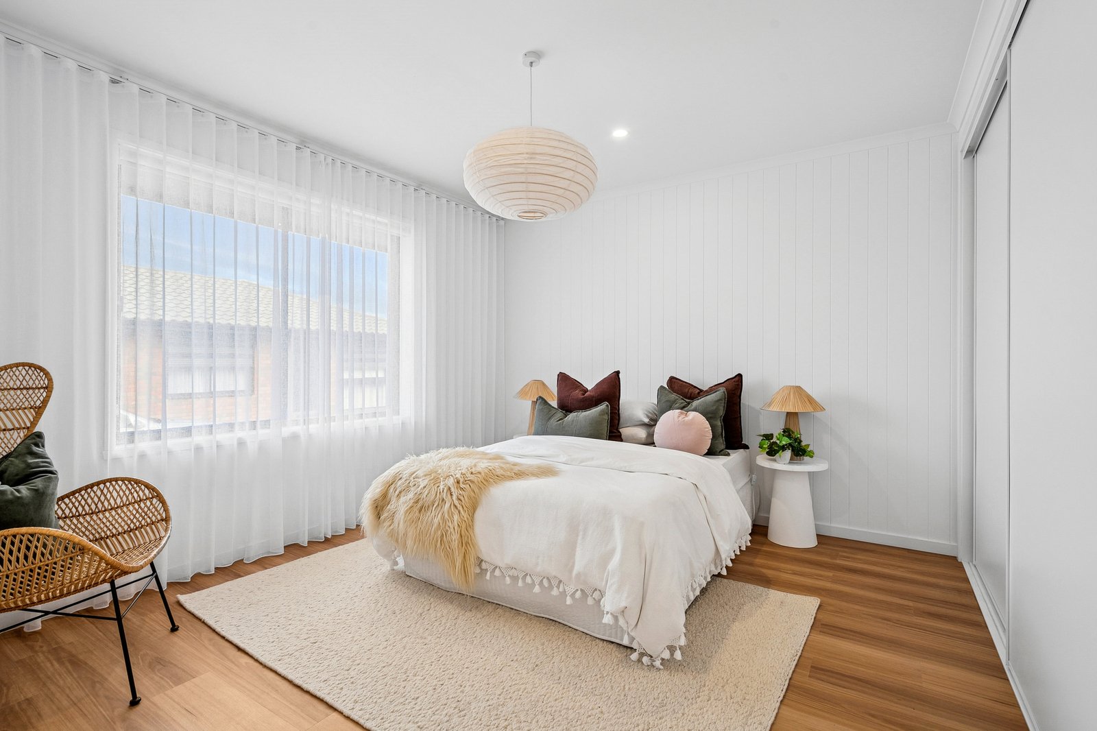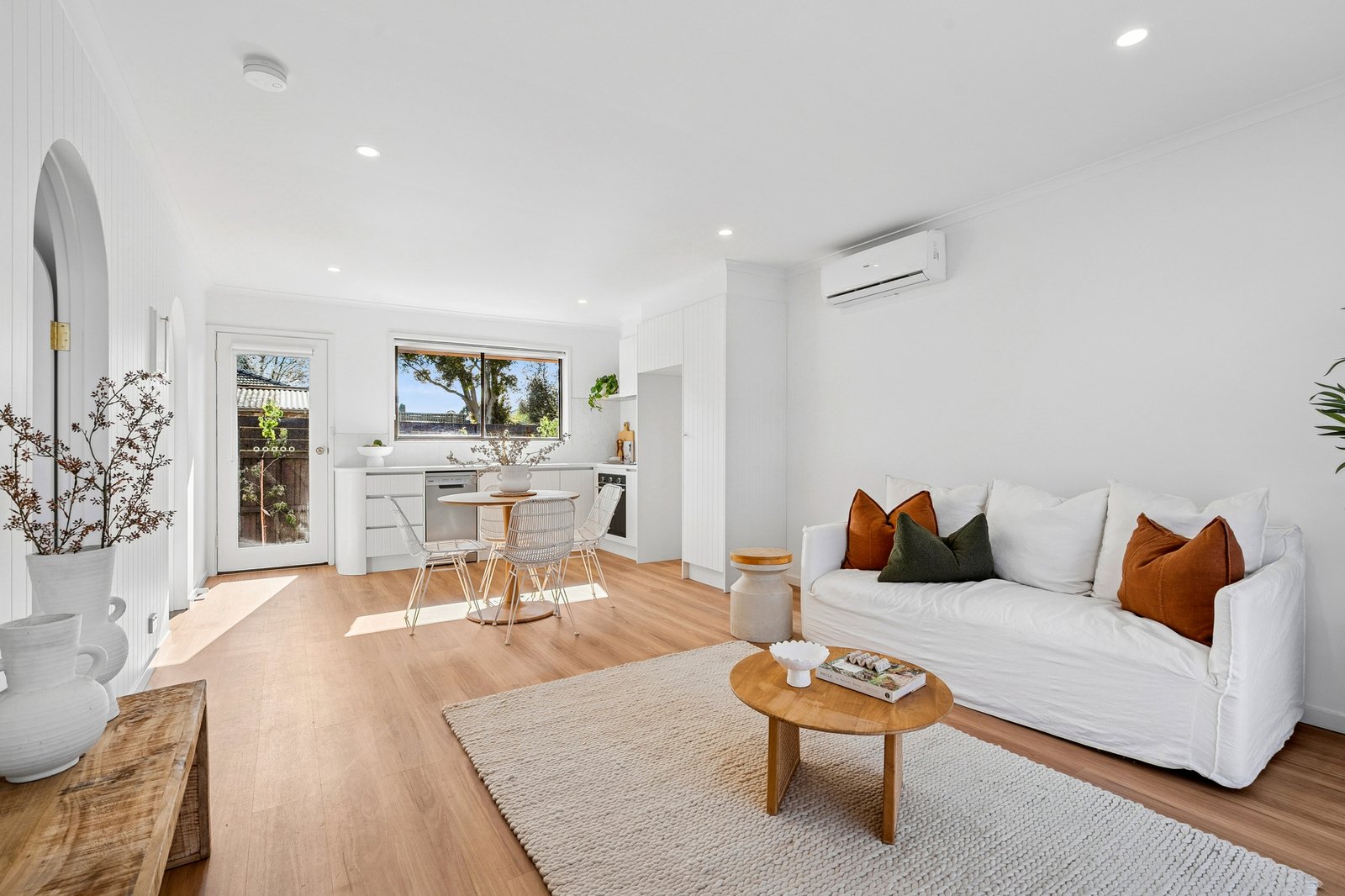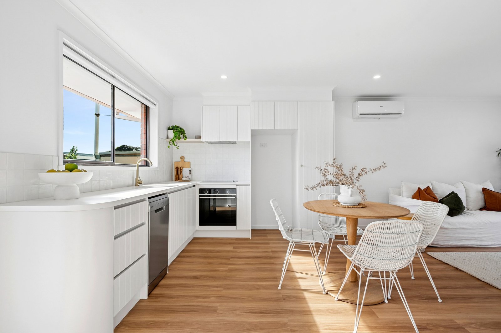 Nestled at the rear of the complex, the home enjoys a private and secluded setting. Stepping inside, the open plan layout is bright and inviting, with classic white interiors, timber flooring, VJ panel wall and sophisticated sheers. The stylish kitchen features a curved benchtop, sleek contemporary cabinetry, and all new appliances including a 600mm oven, electric cooktop, and dishwasher. Split system heating and cooling caters for comfortable living all year round.