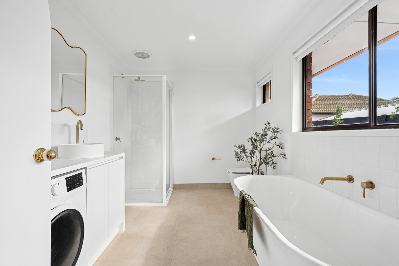 A beautiful arched doorway leads into the spacious bedroom, fitted with generous built-in robes. The rear bathroom continues in high end style, featuring a back-to-wall freestanding bath, separate shower, modern vanity and elegant brass tapware, seamlessly incorporating laundry facilities and linen storage for added functionality.