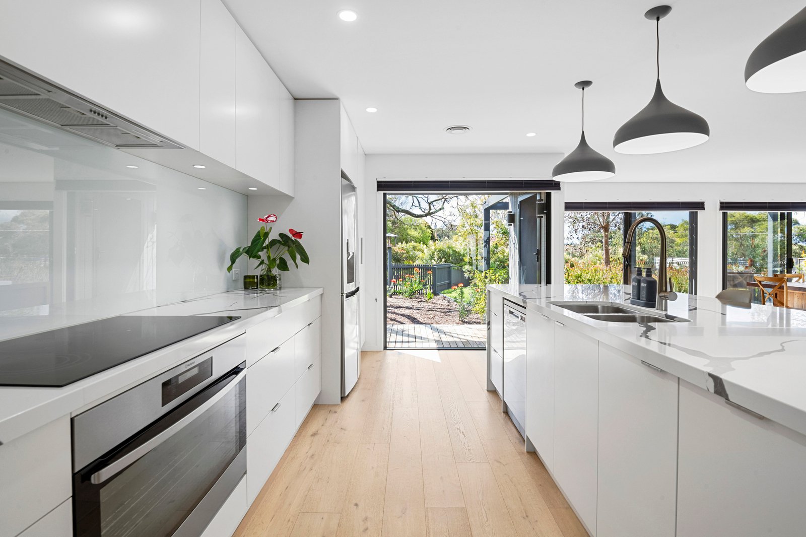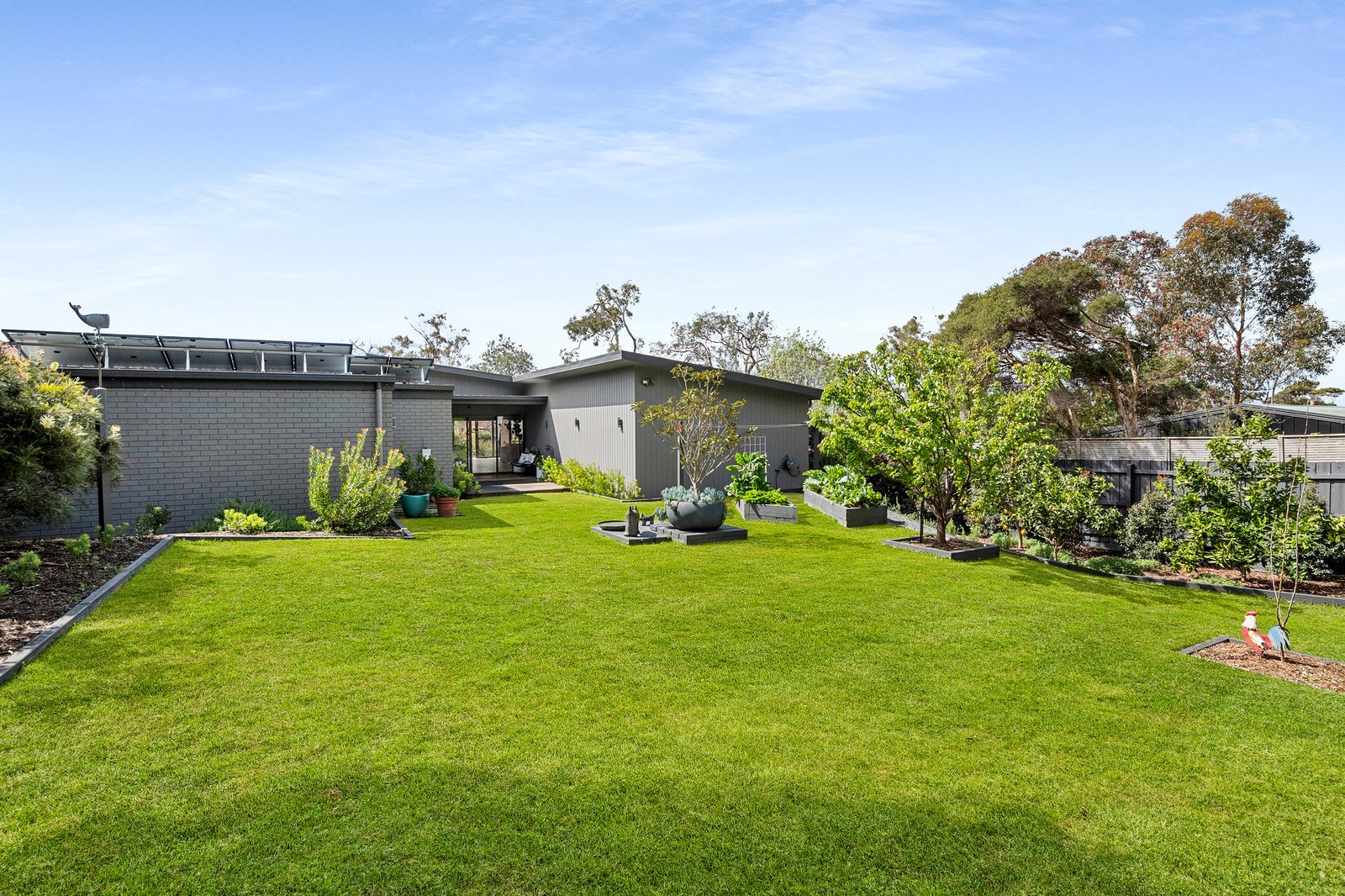 Outdoor living is equally considered, with secure, low-maintenance gardens unfolding past decks on either side of the family domain, providing a choice of private settings depending on the time of day. Vegetable gardens, seasonal colour and an ornamental Australian White Oak and Magnolia tree soften the home’s architectural edges, while a half-height picket fence adds a touch of charm to the entry.