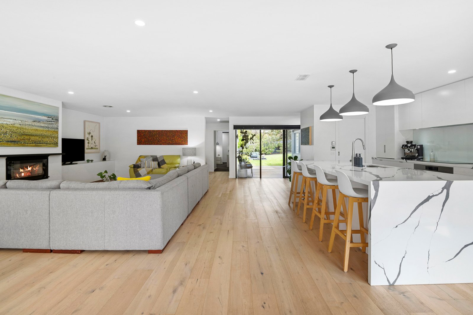 Walls of double-glazing frame the home’s generous proportions, bathing interiors in northern light and garden vistas from multiple angles. Beautifully transformed from the roofline down, the open plan design unfurls across engineered oak floors, culminating in a striking kitchen and family zone where a Calacatta-style stone island and wood fireplace form a captivating centrepiece. Catering for both intimate dinners and large gatherings is effortless with a 900mm Westinghouse oven, electric cooktop, plus a walk-in pantry with wine storage.