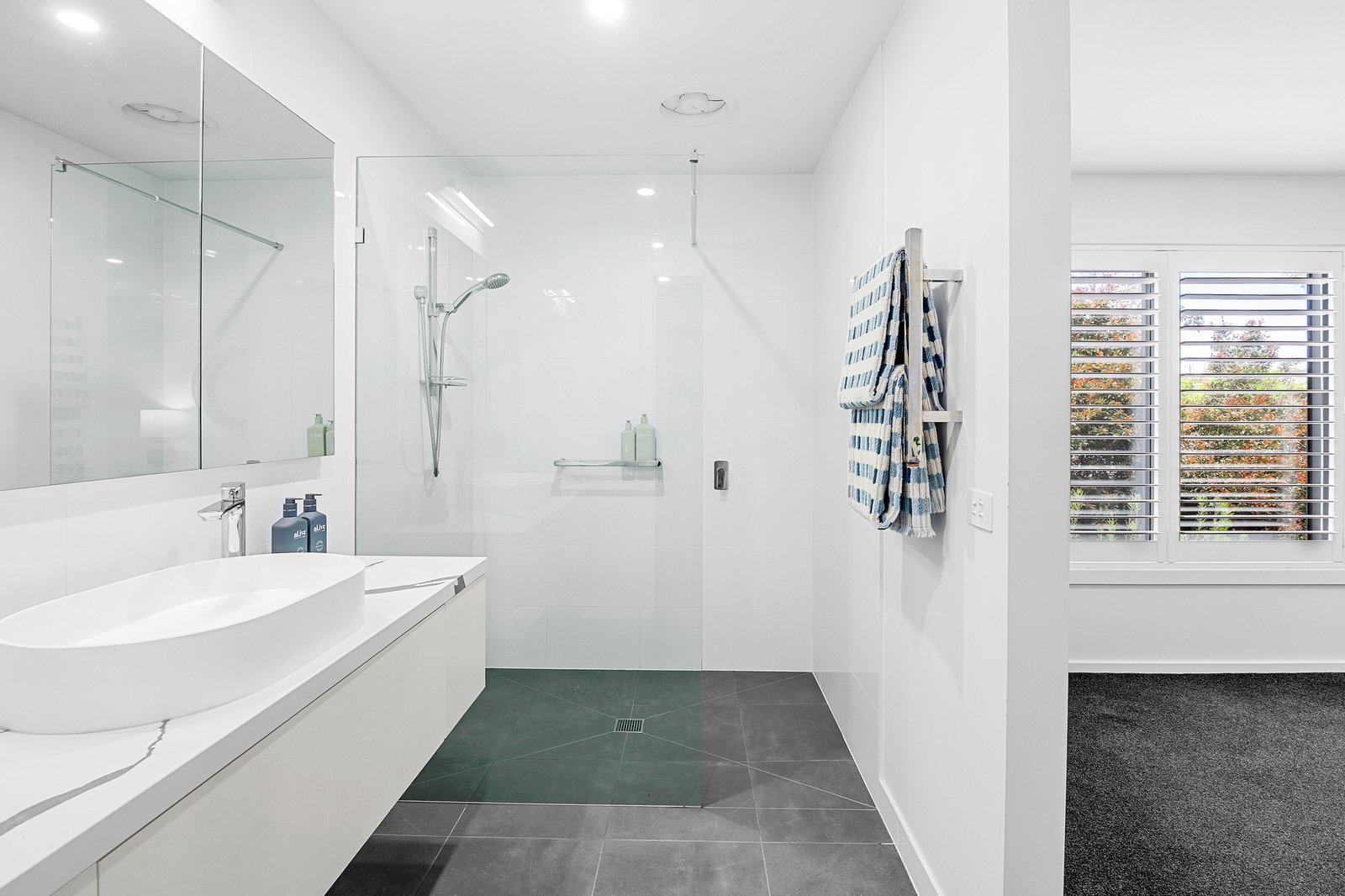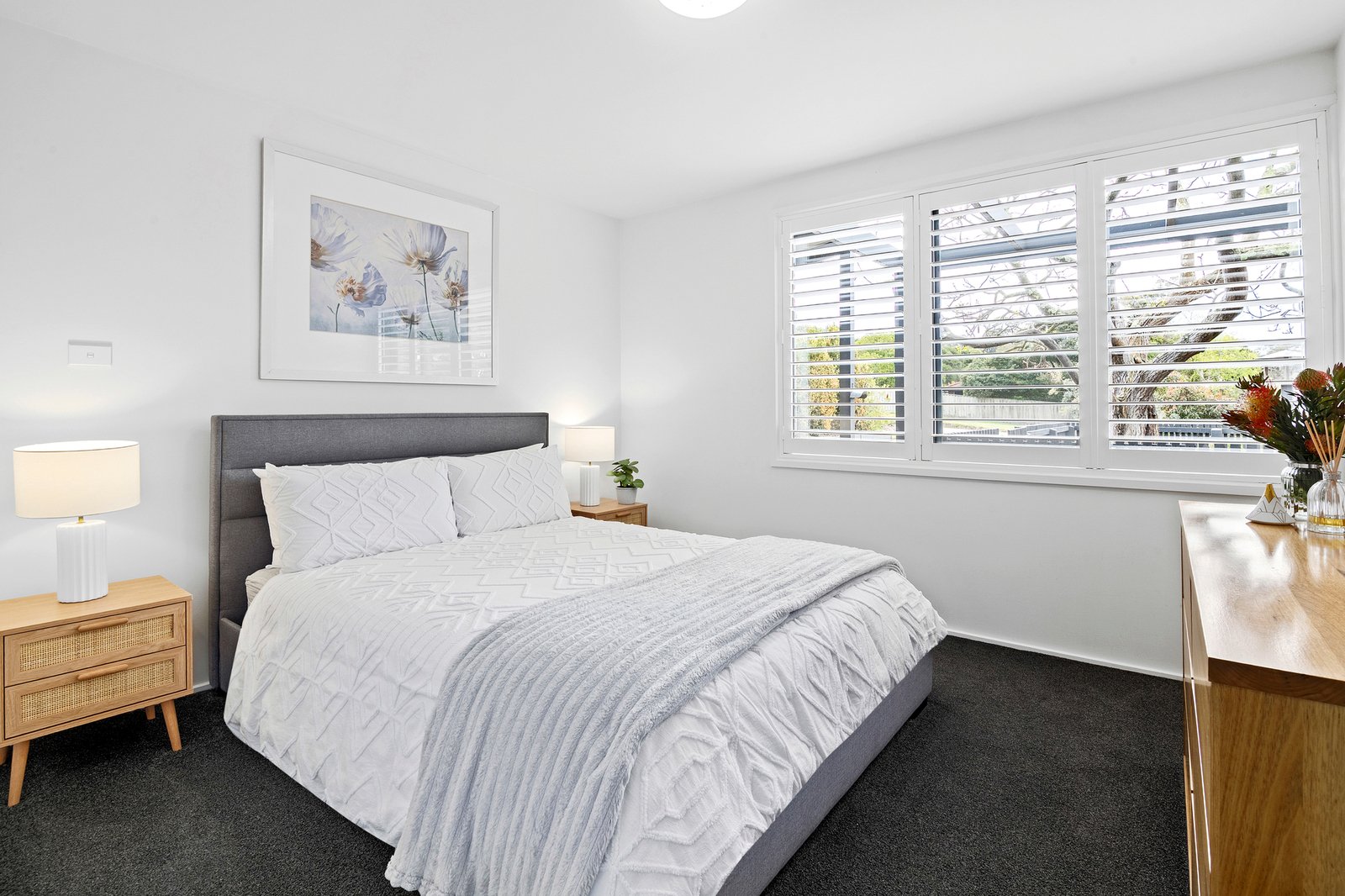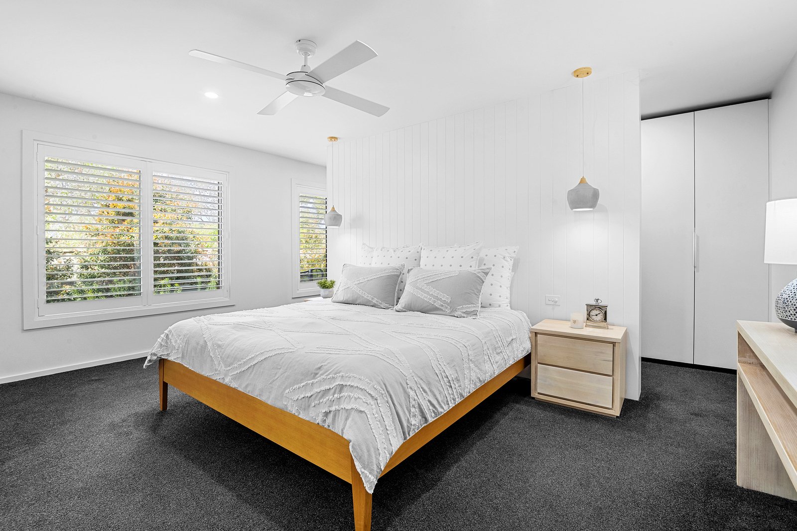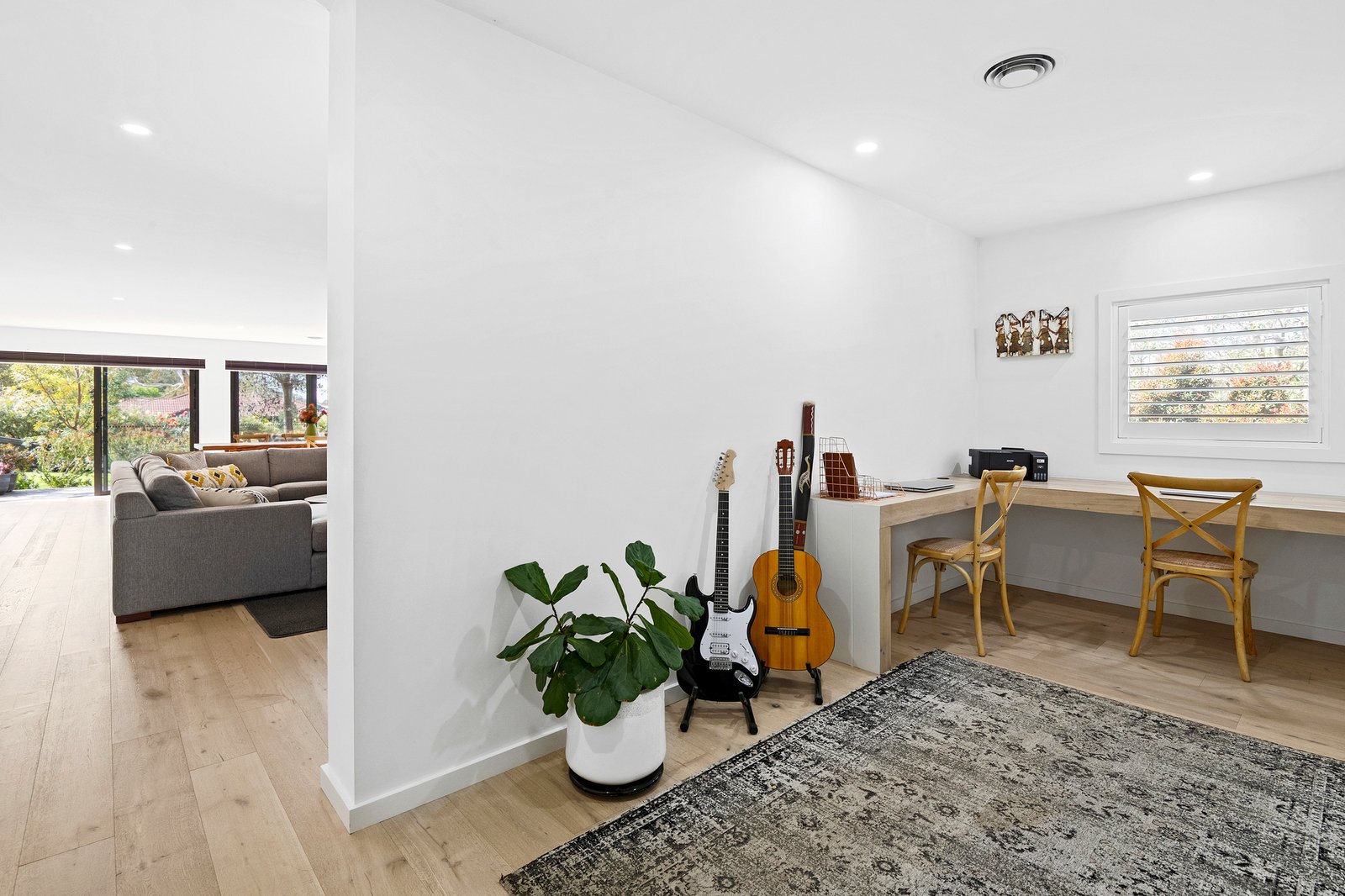 Accommodation includes a private main retreat, with a dual-sided walk-in robe, ensuite with a frameless shower and mirrored storage, plantation shutters and the practicality of an adjoining study nook that ensures work remains separate to rest. Two additional robed bedrooms sit within a separate wing, complemented by a family bathroom and powder room.