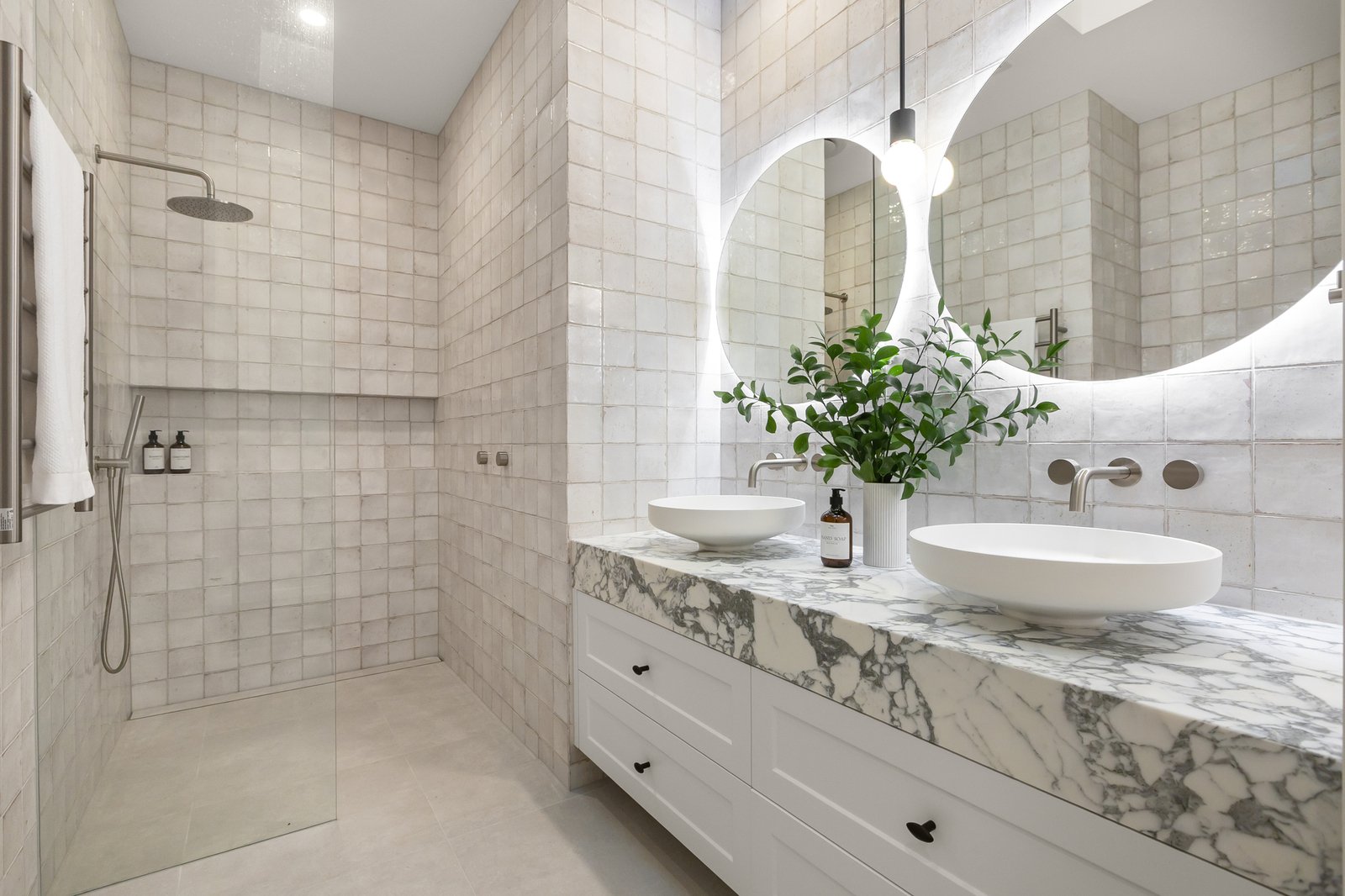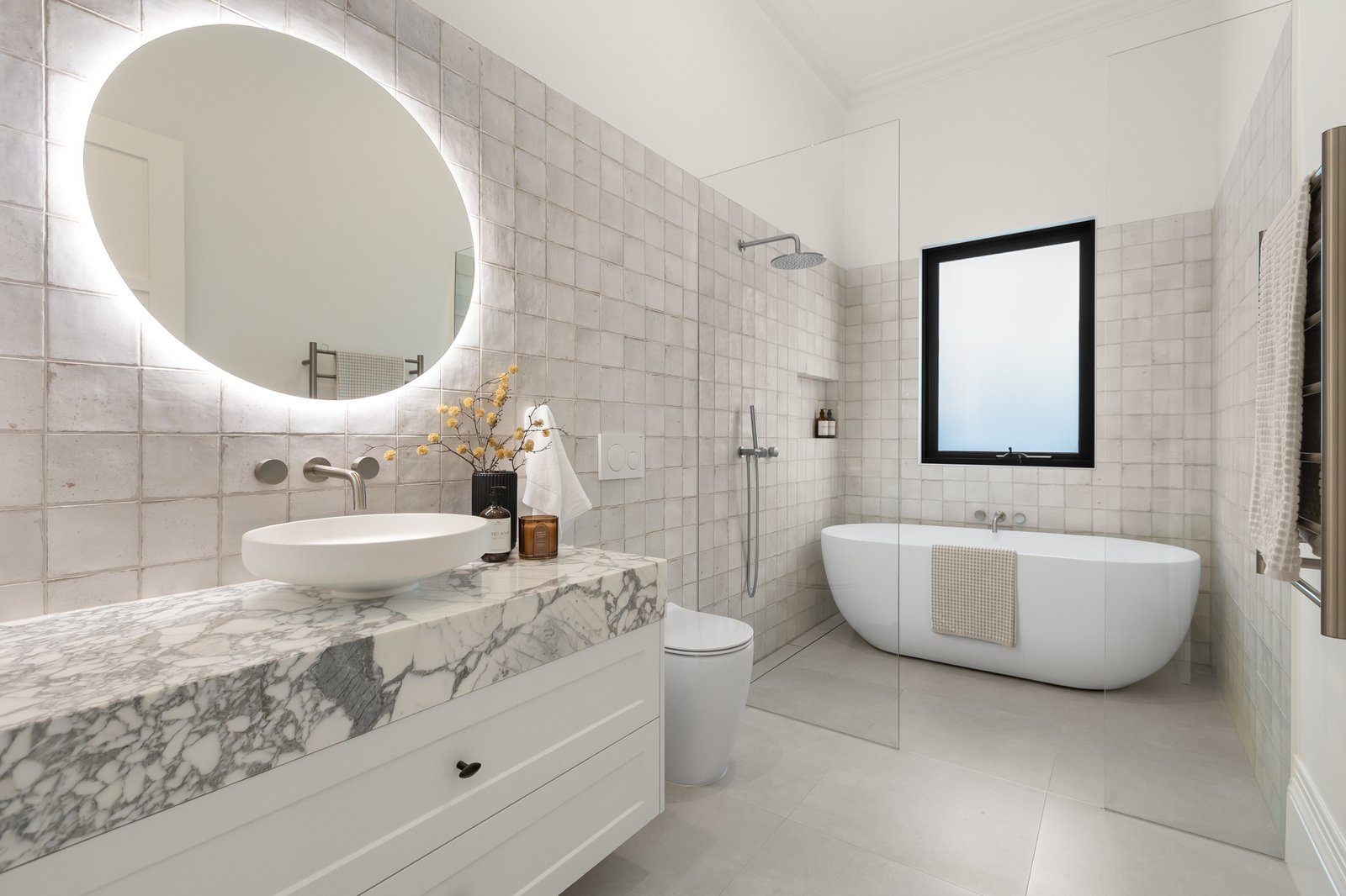Contemporary bathroom appointments feature brushed nickel tapware, heated towel rails, artisan handmade tiles, and elegant Arabescato stone vanity tops. The home's impressive credentials continue with comprehensive security systems, zoned ducted refrigerated heating and cooling, hydronic heating throughout, premium 2-pac joinery, professionally landscaped and irrigated gardens, an oversized laundry, secure carport, additional driveway parking, and an exceptional 6-star energy rating.