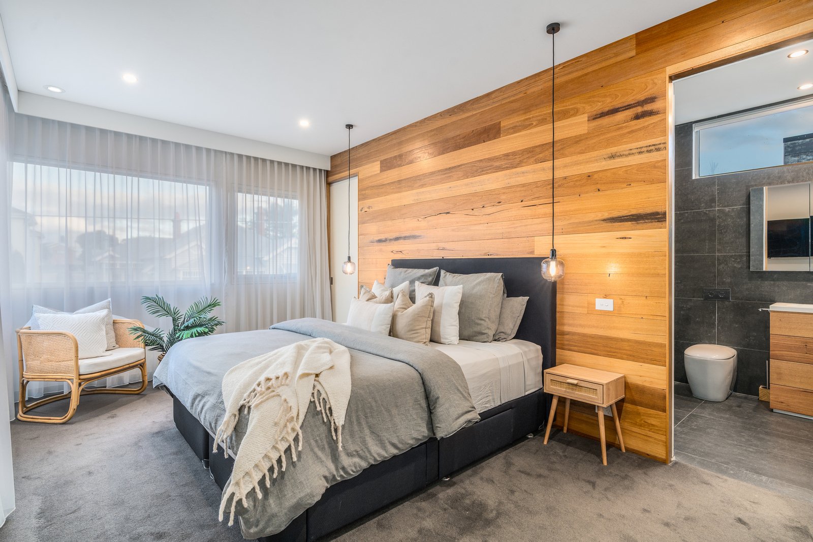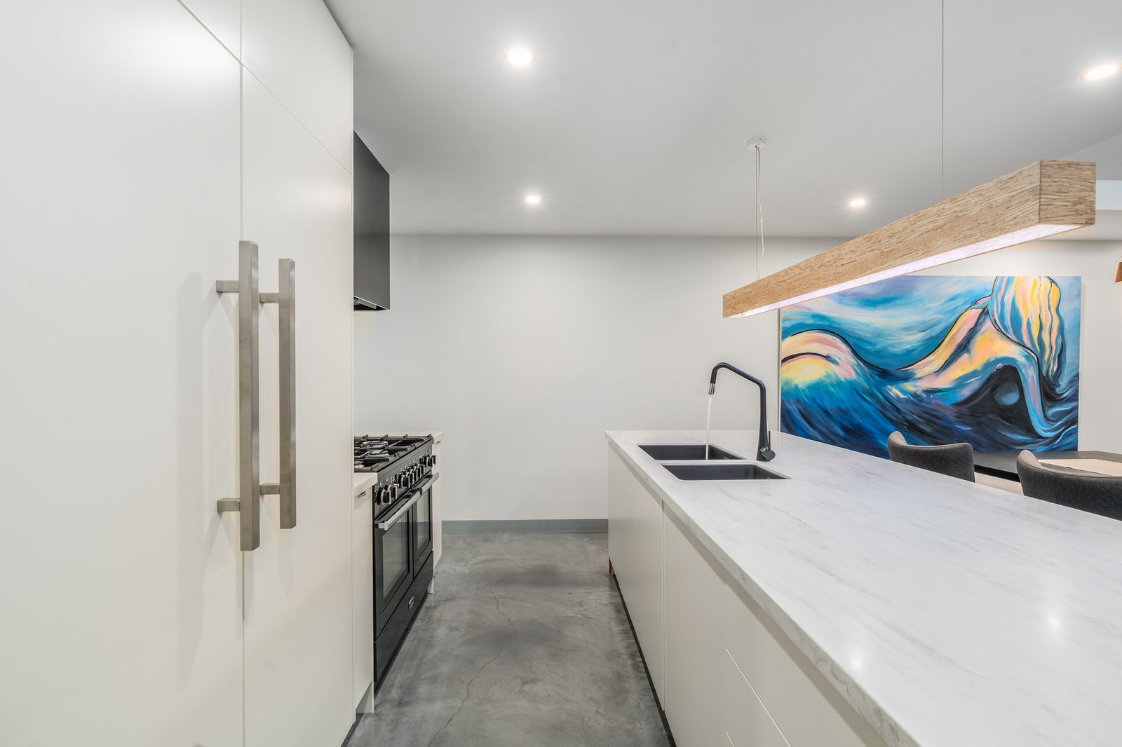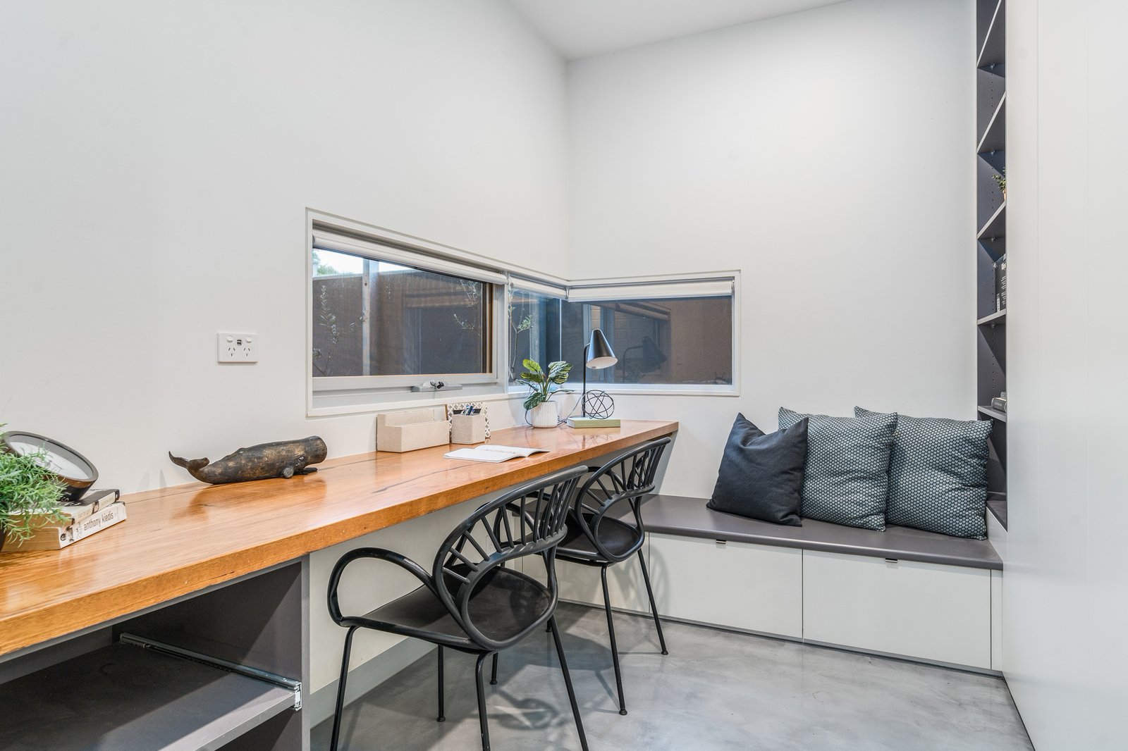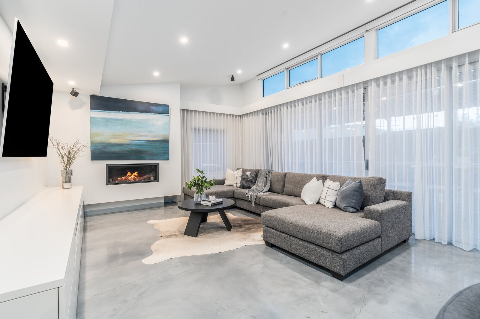 Sleek in style, the impressive façade presents a textural blend of contemporary finishes. Stepping inside, polished concrete floors, high ceilings, and a recycled-timber feature wall introduce the sophisticated aesthetic within. Designed to optimise natural light and create a seamless indoor-outdoor flow, the open plan living area features vaulted ceilings, highlight windows, and large glass stacker doors creating an effortless connection with the north facing outdoor entertaining. The stunning kitchen features high end appliances including a Falcon dual fuel oven and cooktop, fully integrated Miele fridge, freezer and dishwasher, 100mm waterfall stone benchtops, linear pendant lighting, and a large butler’s pantry with second sink and additional preparation space, perfectly designed for those who love to entertain. A gas log fire creates a warm and inviting ambience, with custom joinery offering both style and function. A dedicated study off the living area provides the perfect space to work from home, with a built-in desk, storage and shelving.