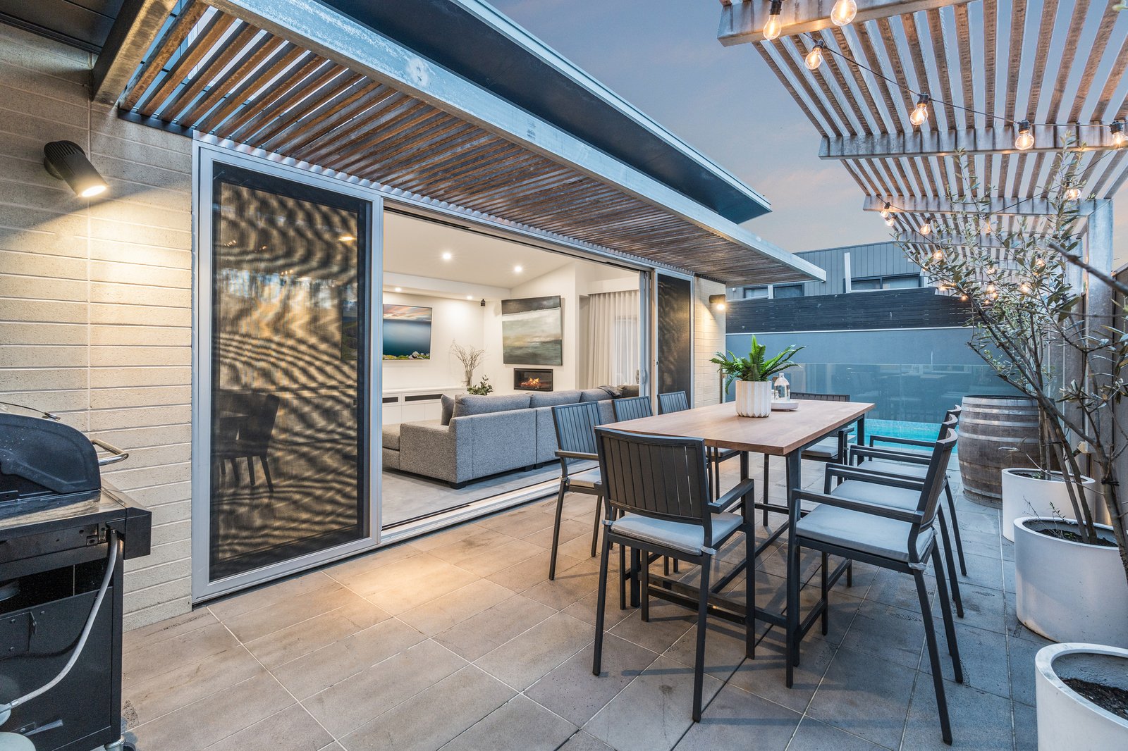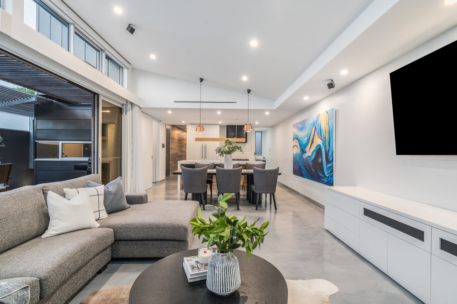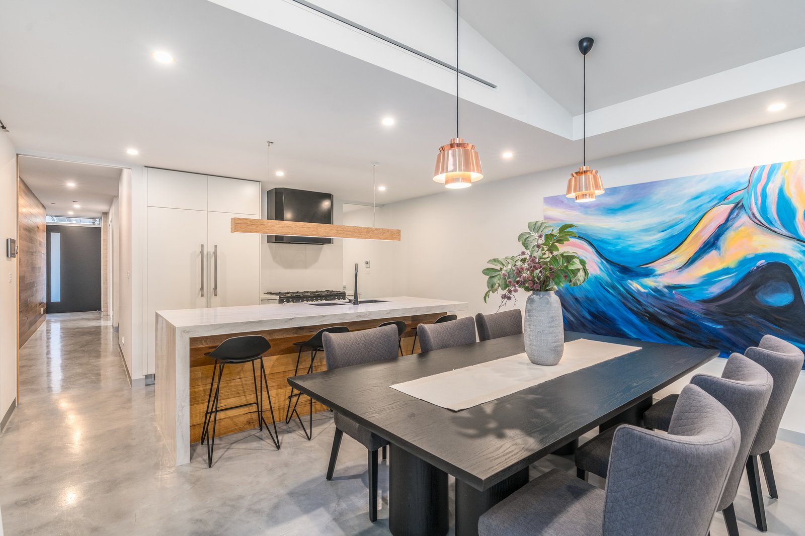 Sleek in style, the impressive façade presents a textural blend of contemporary finishes. Stepping inside, polished concrete floors, high ceilings, and a recycled-timber feature wall introduce the sophisticated aesthetic within. Designed to optimise natural light and create a seamless indoor-outdoor flow, the open plan living area features vaulted ceilings, highlight windows, and large glass stacker doors creating an effortless connection with the north facing outdoor entertaining. The stunning kitchen features high end appliances including a Falcon dual fuel oven and cooktop, fully integrated Miele fridge, freezer and dishwasher, 100mm waterfall stone benchtops, linear pendant lighting, and a large butler’s pantry with second sink and additional preparation space, perfectly designed for those who love to entertain. A gas log fire creates a warm and inviting ambience, with custom joinery offering both style and function. A dedicated study off the living area provides the perfect space to work from home, with a built-in desk, storage and shelving.