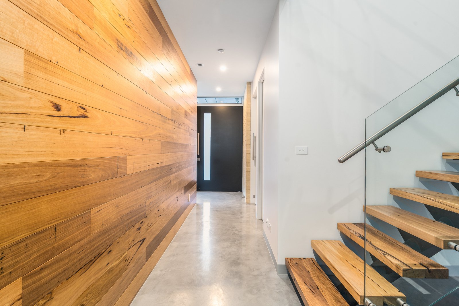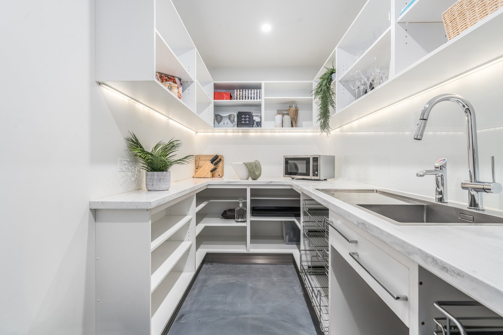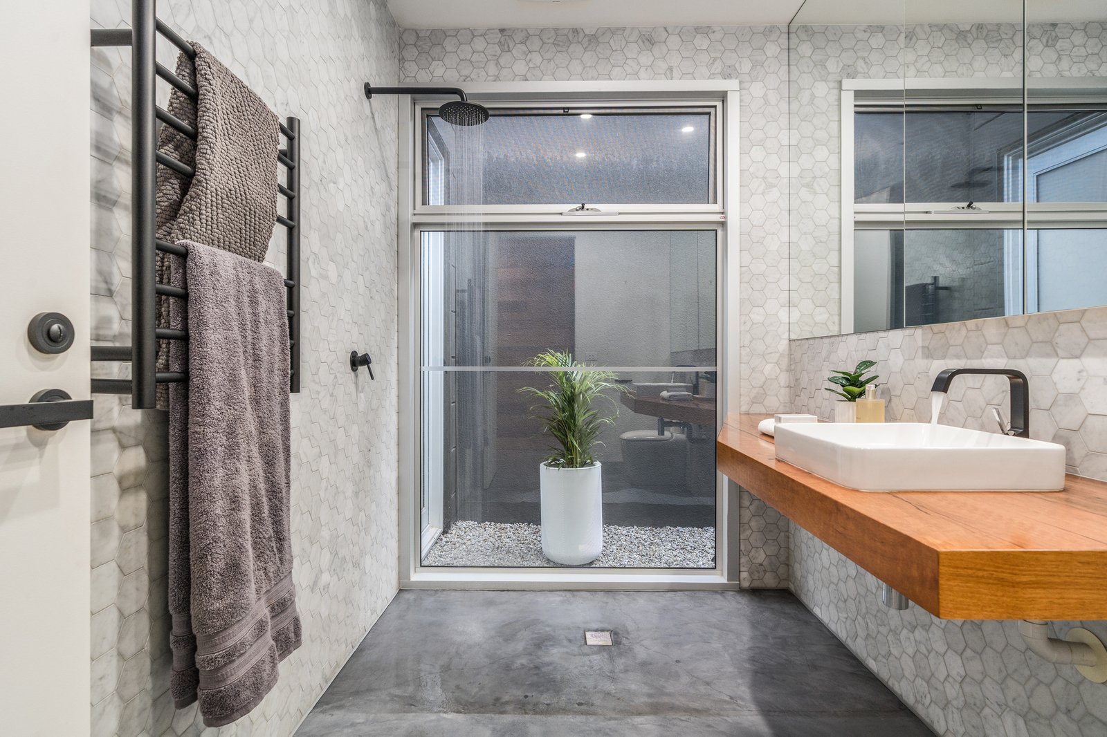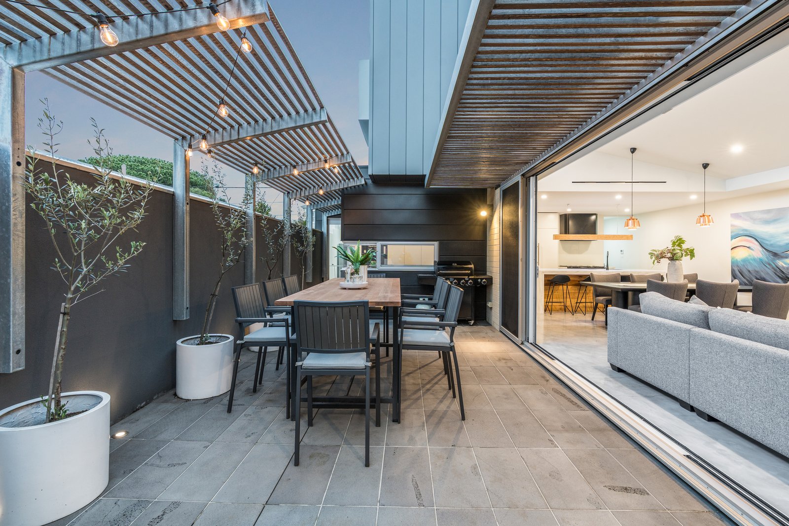 Sleek in style, the impressive façade presents a textural blend of contemporary finishes. Stepping inside, polished concrete floors, high ceilings, and a recycled-timber feature wall introduce the sophisticated aesthetic within. Designed to optimise natural light and create a seamless indoor-outdoor flow, the open plan living area features vaulted ceilings, highlight windows, and large glass stacker doors creating an effortless connection with the north facing outdoor entertaining. The stunning kitchen features high end appliances including a Falcon dual fuel oven and cooktop, fully integrated Miele fridge, freezer and dishwasher, 100mm waterfall stone benchtops, linear pendant lighting, and a large butler’s pantry with second sink and additional preparation space, perfectly designed for those who love to entertain. A gas log fire creates a warm and inviting ambience, with custom joinery offering both style and function. A dedicated study off the living area provides the perfect space to work from home, with a built-in desk, storage and shelving.