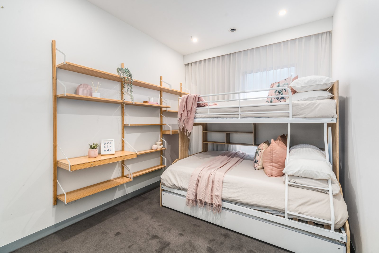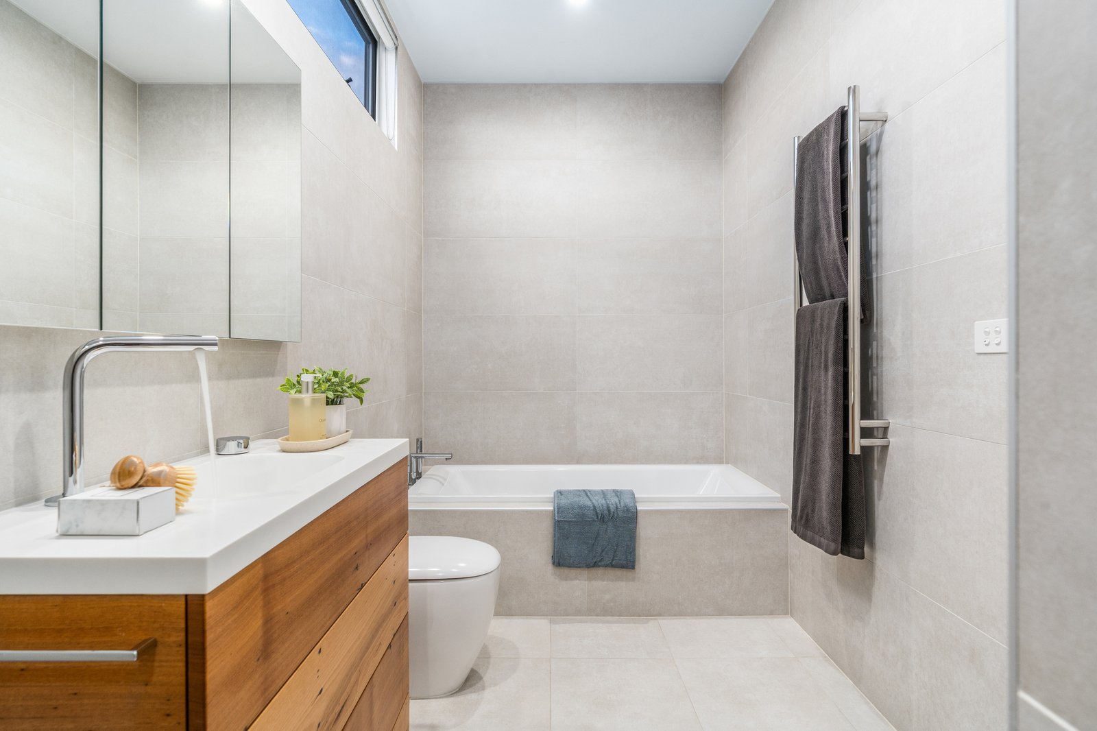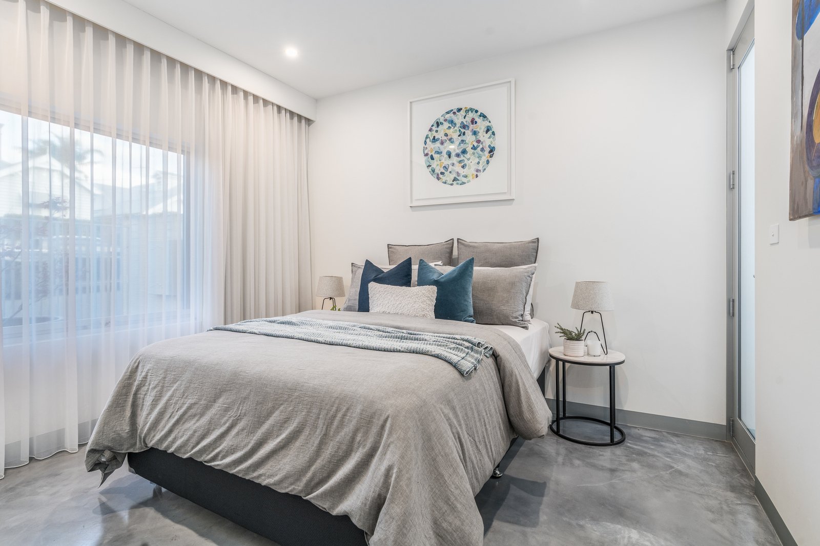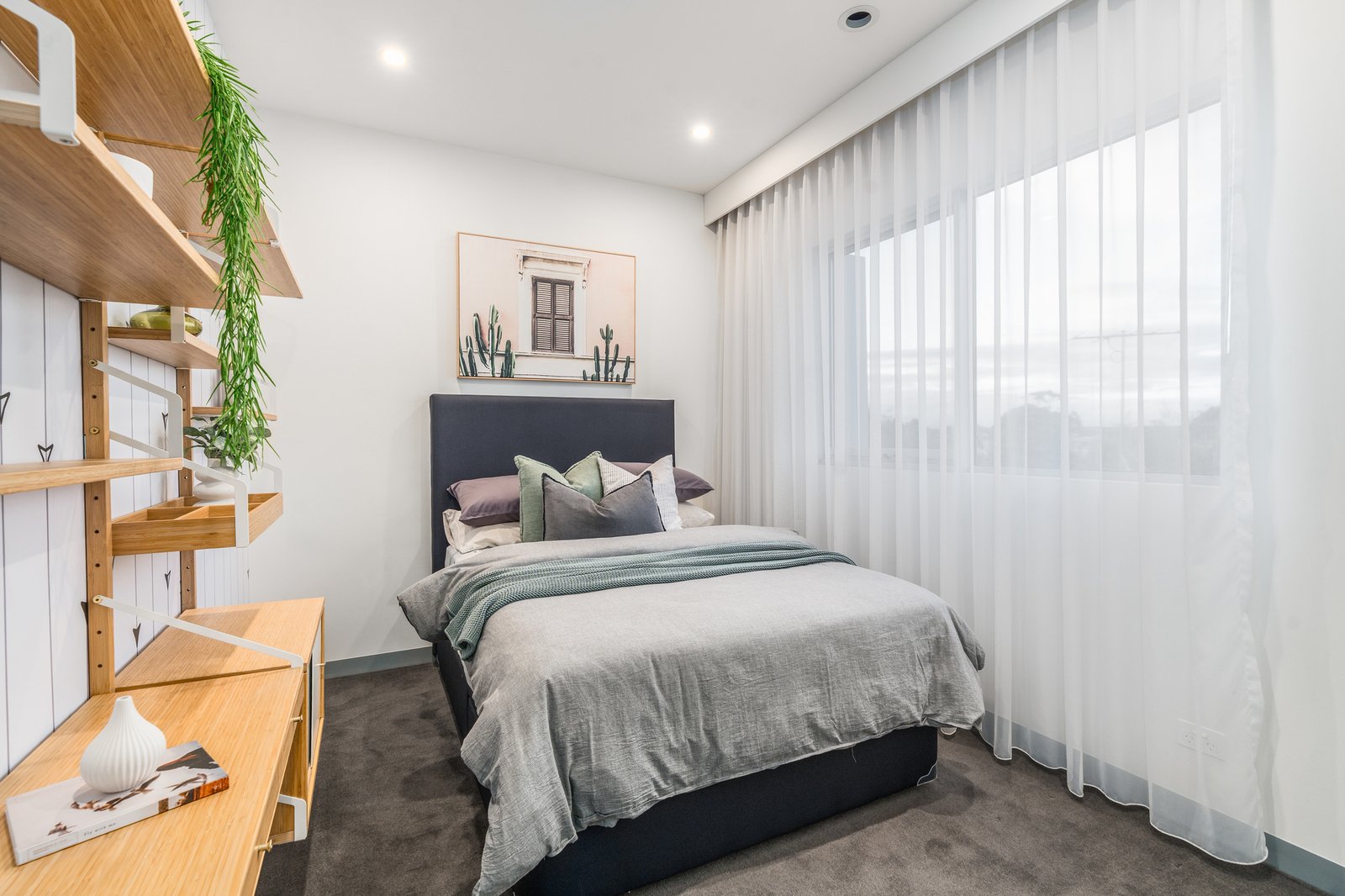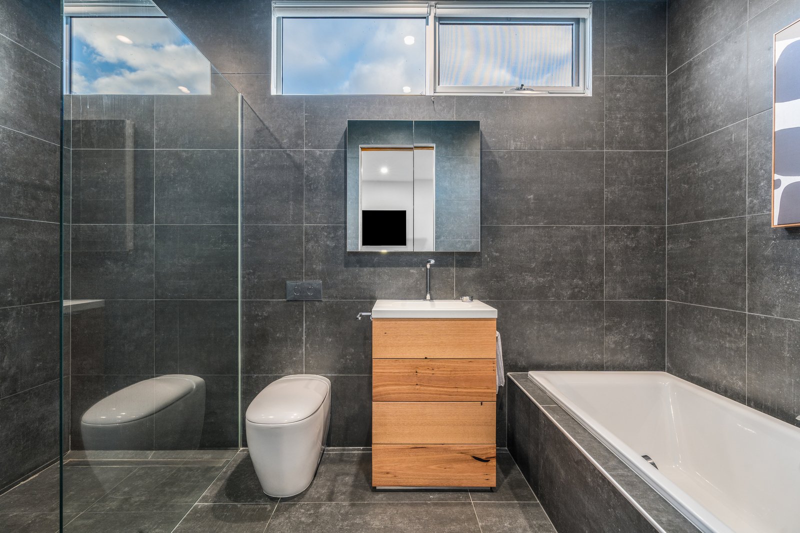 The luxurious main bedroom is positioned upstairs, featuring an architectural corner window with a scenic elevated vista, walk-in robes, and a tastefully appointed ensuite finished in floor to ceiling tiles, with a bath, frameless walk-in shower, and modern timber vanity. Two further bedrooms on this level include built-in robes, serviced by a second bathroom in keeping with the home’s high-quality finishes. The fourth bedroom is privately zoned on the ground floor, accompanied by a chic third bathroom, ideal for a teenager’s retreat or guest room.