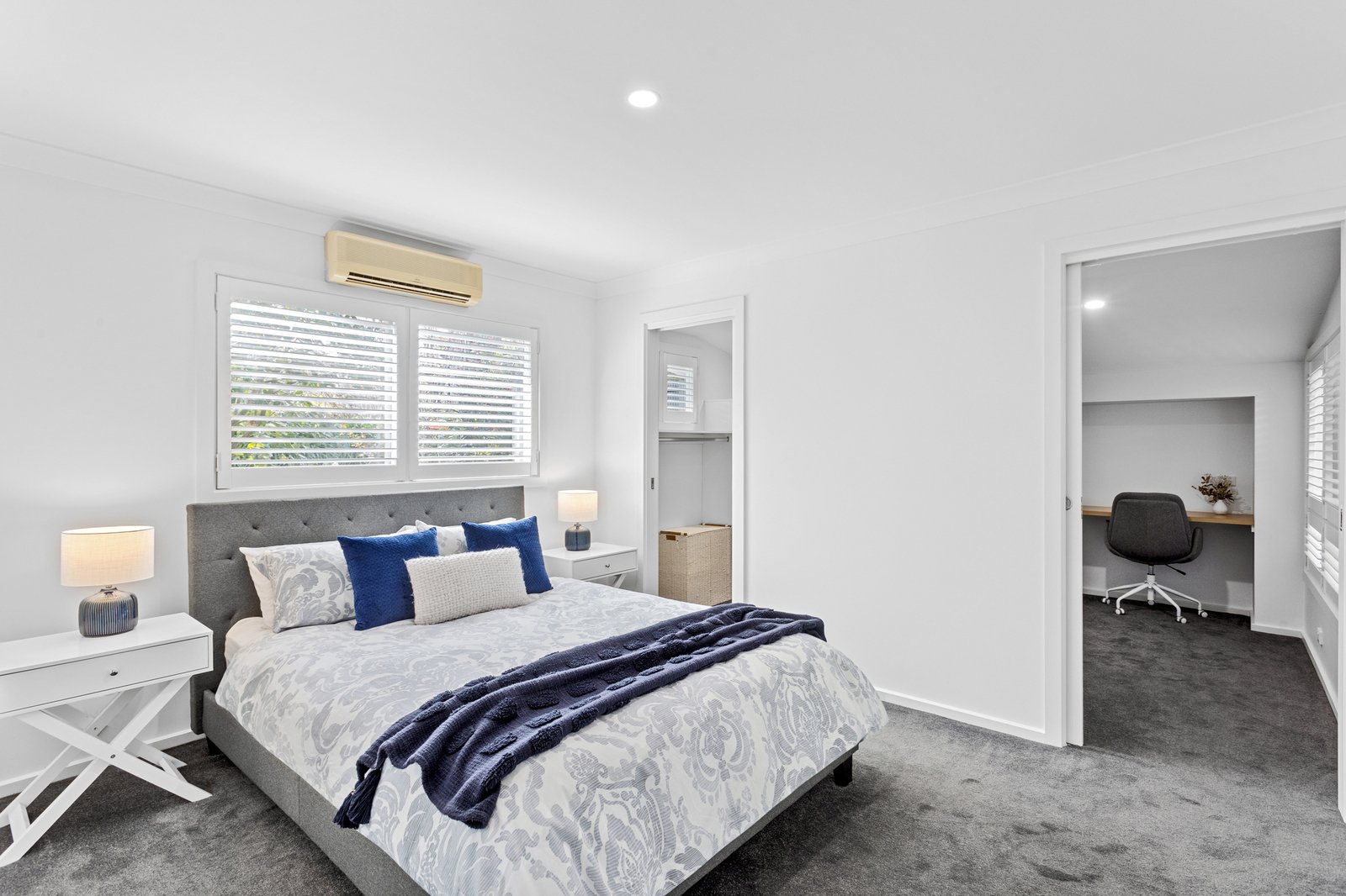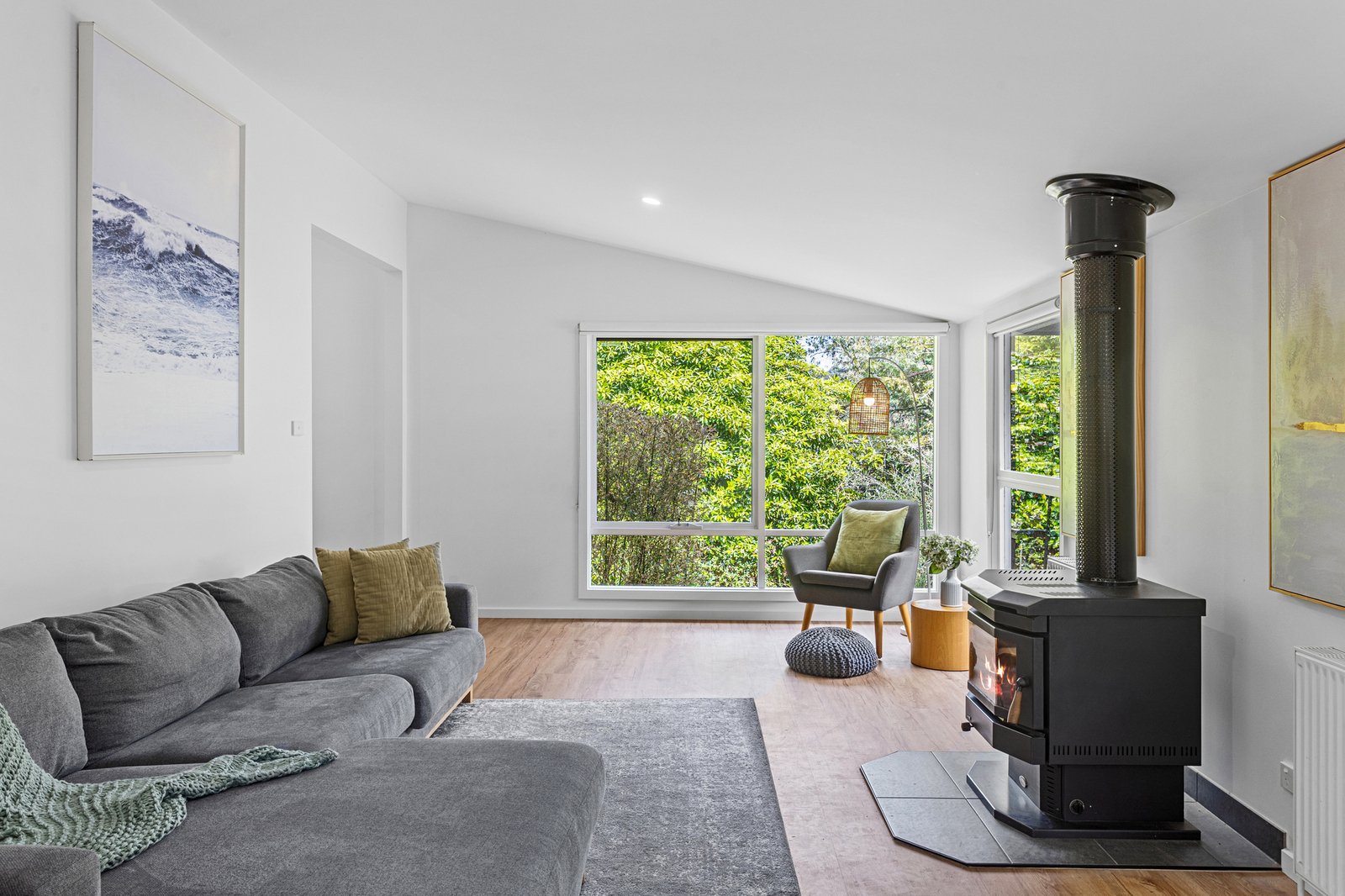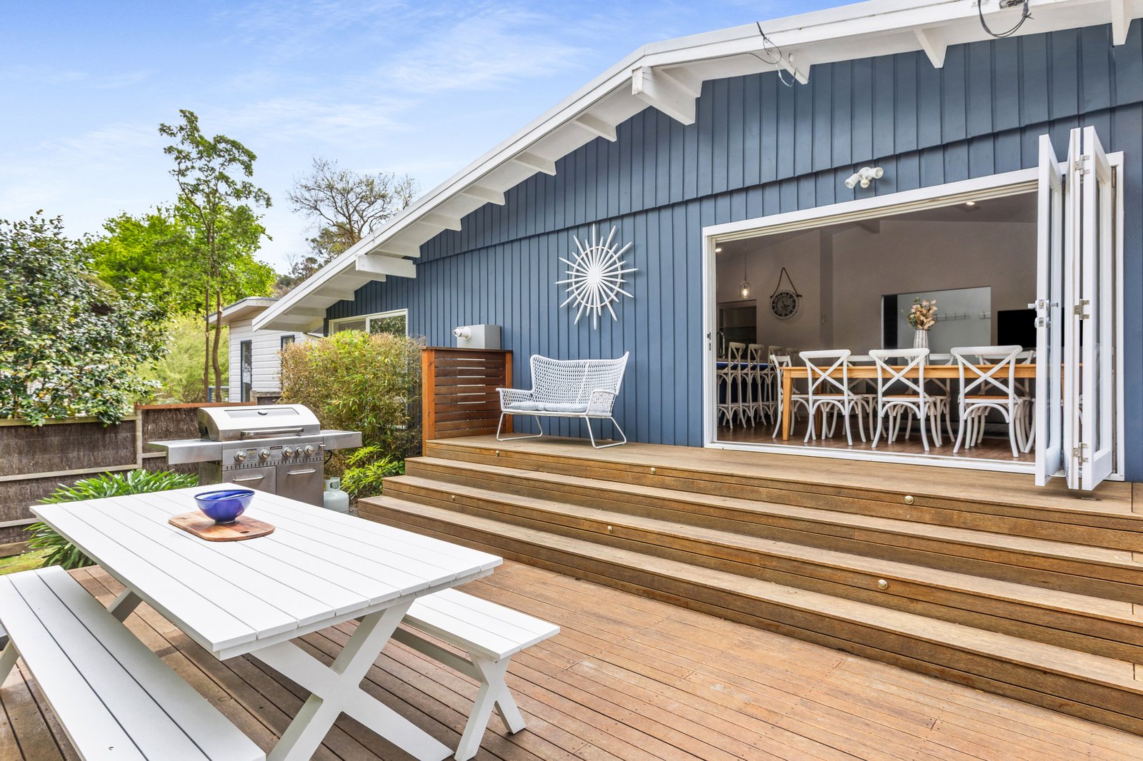 Beyond a charming front deck, the floor plan unfolds with a skylit hallway featuring keyless entry/mudroom, leading through to the living room that evokes ambience with a slow-combustion wood heater and access to the covered rear patio. Accents of deep blue and crisp white echo the seaside setting, offering a stylish aesthetic throughout, evident within the gourmet kitchen, which is oriented to keep you close to the activity, from entertaining and meal prep to simply enjoying the private garden outlook. Pairing sleek stone detail with premium appliances and a walk-in pantry, it is the ultimate domain for avid hosts, flowing directly outdoors through bi-fold doors for open-air dining or ambient evenings surrounded by lush, established greenery under a stunning Golden Elm. Four bedrooms are well-zoned and perfectly positioned to capture leafy aspects, with the main bedroom comprising a large walk-in robe, en-suite, and a dedicated study. Two of the three additional bedrooms feature built-in robes and share the central luxe bathroom, which features a bath.