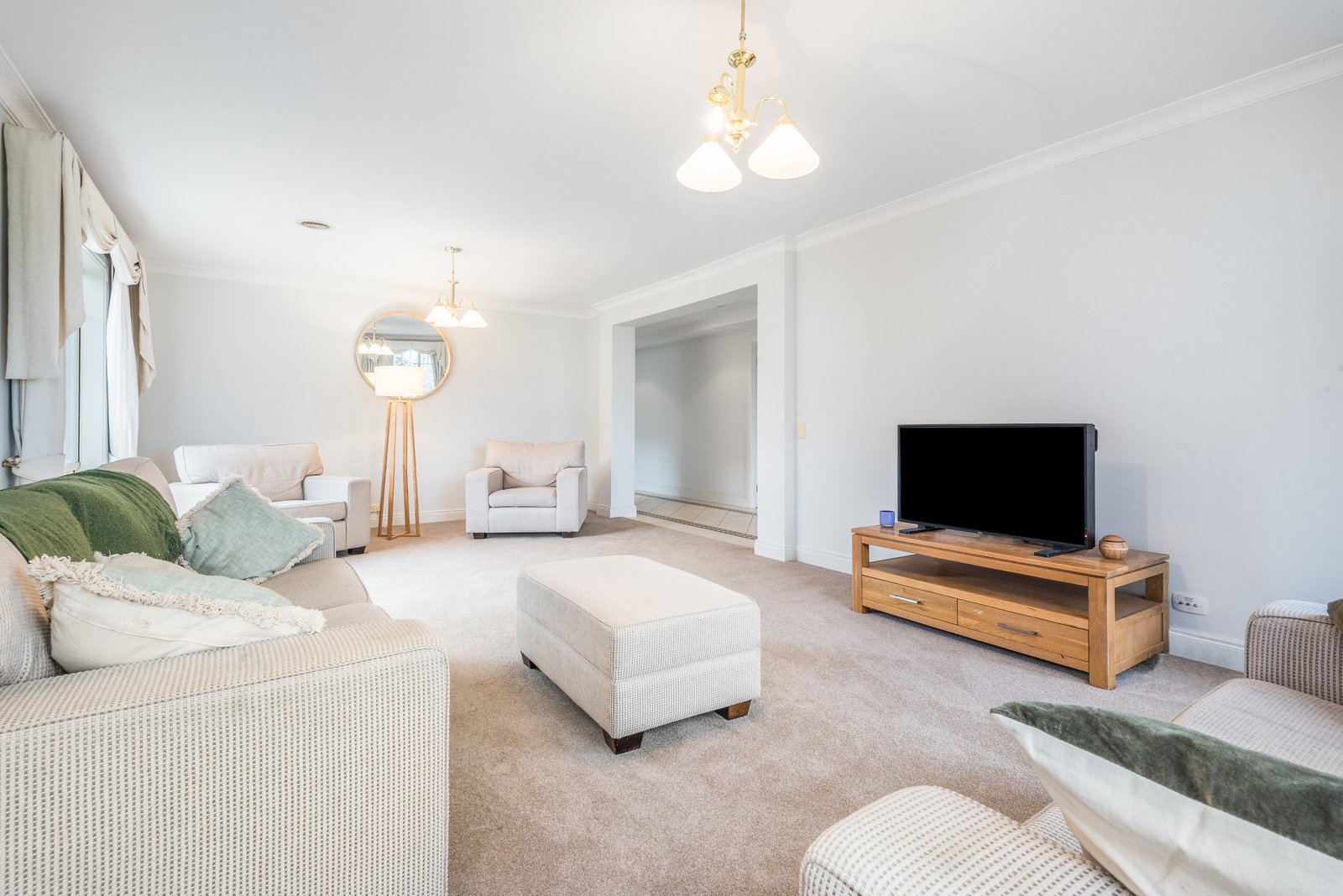 The luxurious main bedroom is positioned at the front of the home, featuring dual walk-in robes and a tastefully updated ensuite presented in modern finishes with mirror cabinets. Three further bedrooms are zoned in a separate wing, all generous in size with built-in robes, serviced by a contemporary main bathroom and separate wc. A fifth room provides a versatile space with built-in storage, suitable for a home office or fifth bedroom.