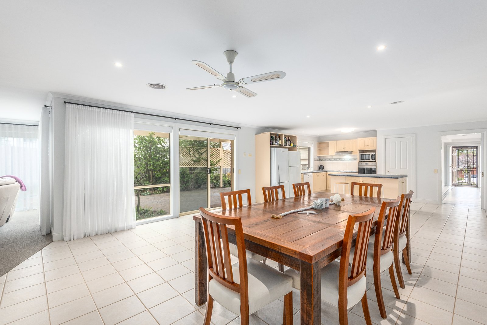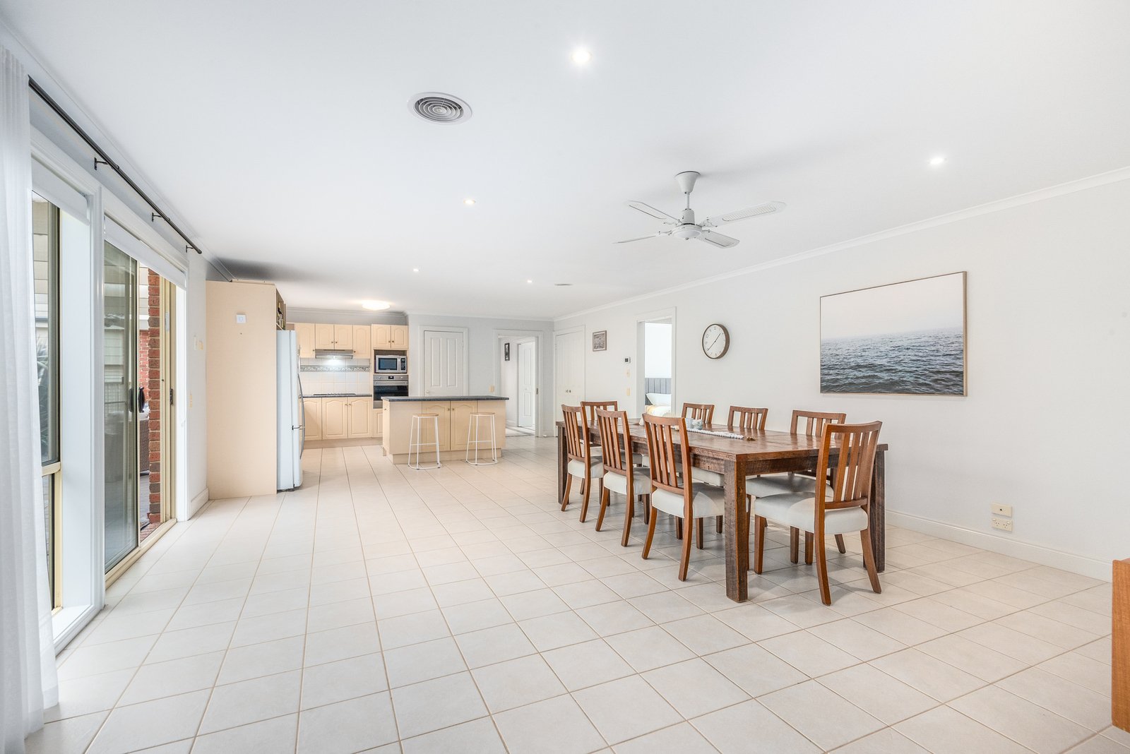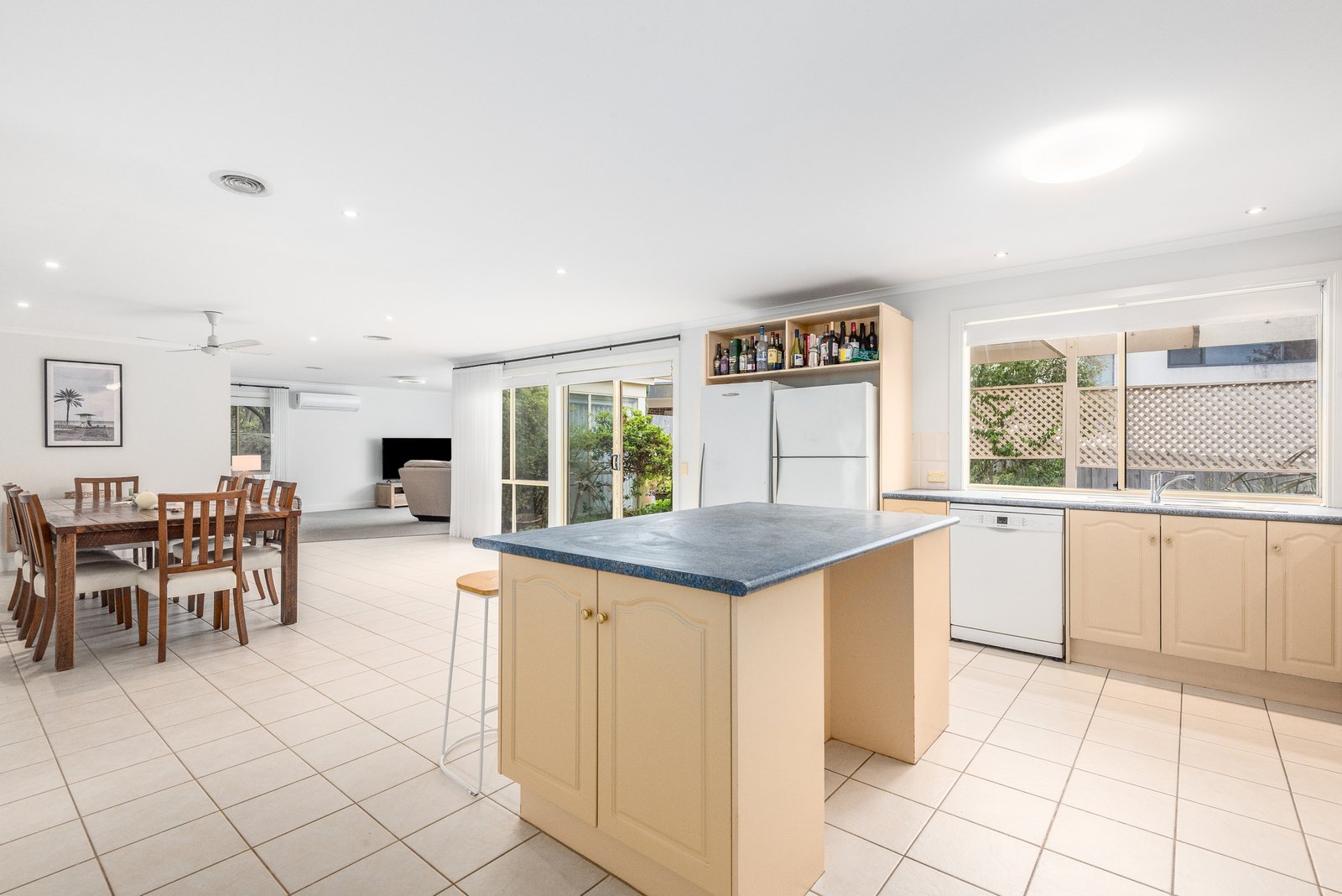 Nestled behind a picket fence and established gardens, the home is timeless in appeal. Inside, a wide entry hall showcases recessed ceilings, downlights, and elegant floor tiles, introducing the classic theme of the interiors. A spacious formal lounge off the entry features a beautiful bay window with a picturesque vista, pendant lighting, and light neural interiors, offering a sophisticated space to retreat. To the rear, an expansive open plan kitchen, dining and living area wraps around the north facing pergola, designed for light-filled everyday living and effortless indoor-outdoor entertaining. The well-appointed kitchen is equipped with quality appliances including 600mm wall oven, 900mm gas cooktop, dishwasher, a central island, ample bench space and generous storage provisions.