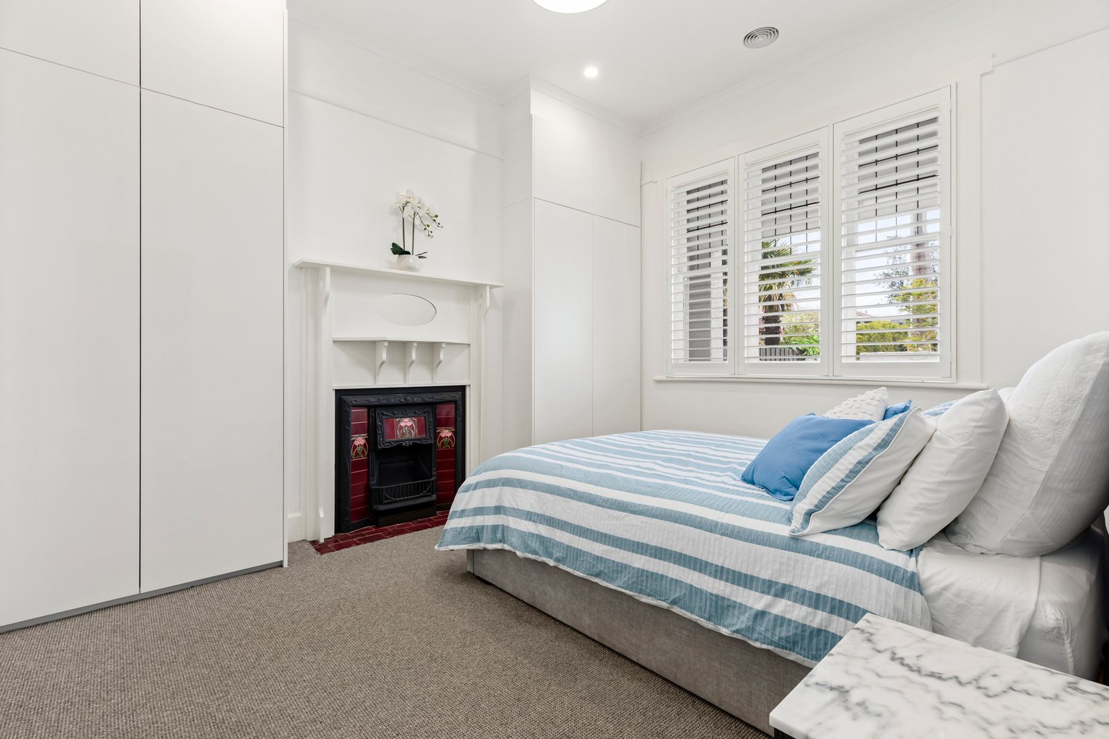 Hidden behind a secure street entry, the original verandah opens to three inviting bedrooms, all with excellent BIRs/storage, the main with the added appeal of a traditional OFP and leadlight windows. A skylit central living domain enjoys built-in bar/storage and a second OFP before a family sized open plan kitchen equipped with stone benchtops, quality appliances and extensive storage overlooks adjoining dining with outlooks over the garden. Here, a wall of sliding stacker doors dissolves the boundary between inside and paved alfresco areas whose built-in BBQ and auto louvre roof allow any weather entertaining. Further highlights include a sleek, fully tiled bathroom with soaker bath, independent shower and storage, concealed laundry facilities, zoned ducted heating/cooling, ceiling fans, high ceilings throughout, satin polished timber floors, multiple skylights, plantation shutters, keyless entry, video intercom security, alarm, garden shed, front and secure rear off-street parking.