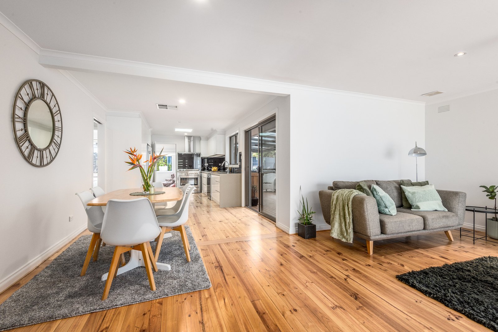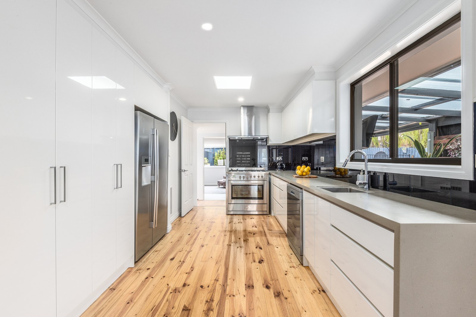 Set behind established gardens, the façade is presented in a modern blend of rendered and timber finishes. Stepping inside, a wide entry hall leads into the open plan heart of the home, showcasing beautiful polished timber floors and fresh white interiors, creating an inviting atmosphere throughout. The living area flows seamlessly through to the dining space and updated kitchen, featuring waterfall stone benchtops, sleek contemporary cabinetry, generous storage, and new appliances including a 900mm oven and cooktop, rangehood and dishwasher. Glass sliders connect the kitchen with the alfresco, catering for effortless indoor-outdoor entertaining.