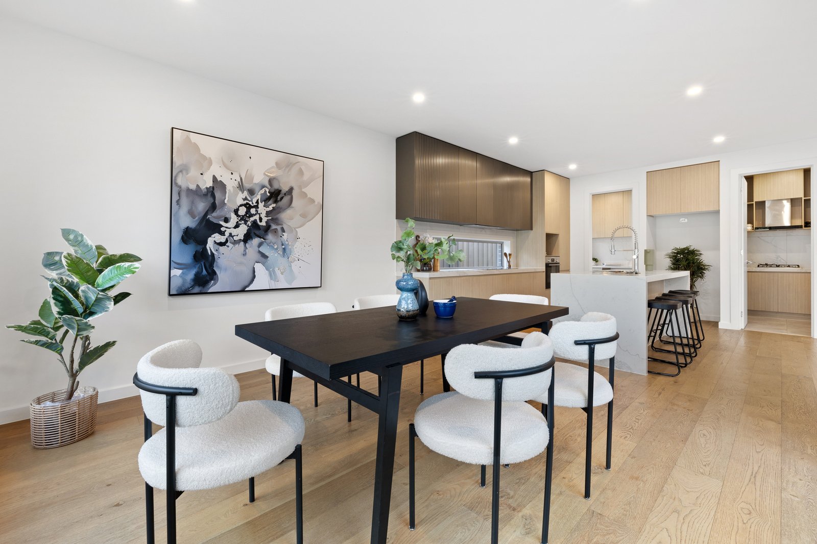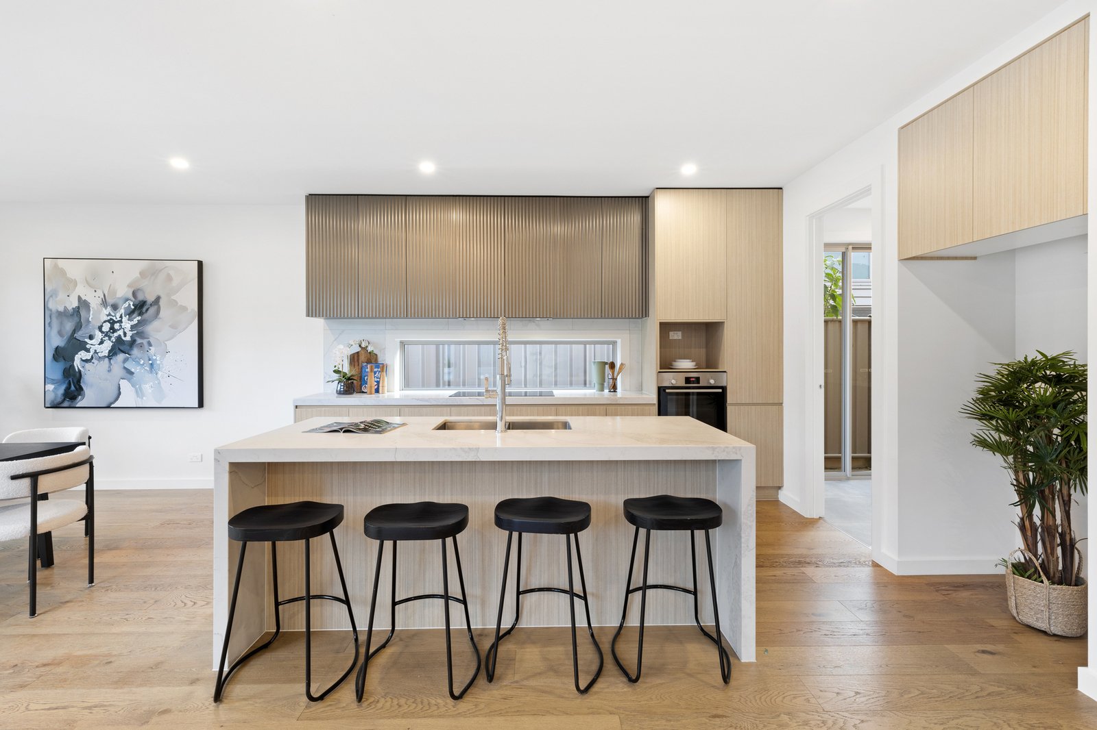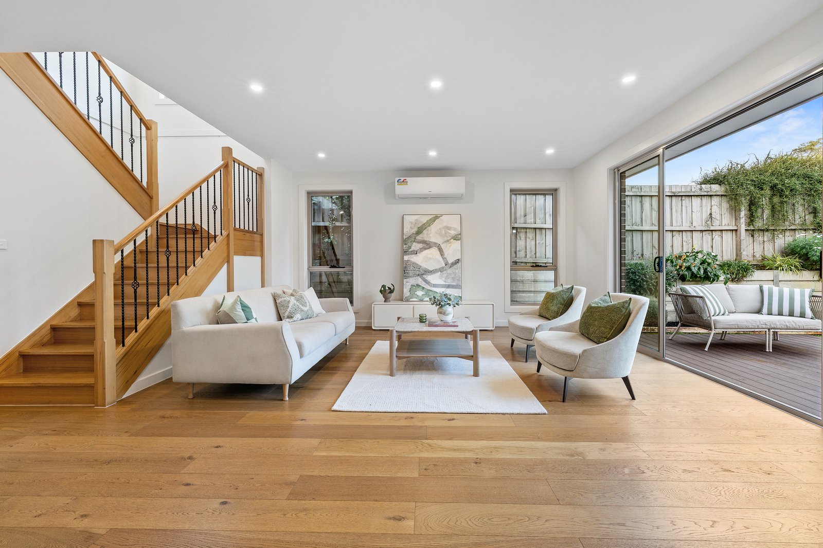 Step inside to discover a refined interior where high-end fixtures and abundant natural light create an atmosphere of sophisticated comfort. The stunning kitchen serves as the heart of the home, featuring a practical gas-powered butler's pantry and flowing seamlessly into the open-plan living and dining area. This inviting space opens effortlessly through sliding doors to a private decked courtyard—perfect for entertaining or quiet relaxation.