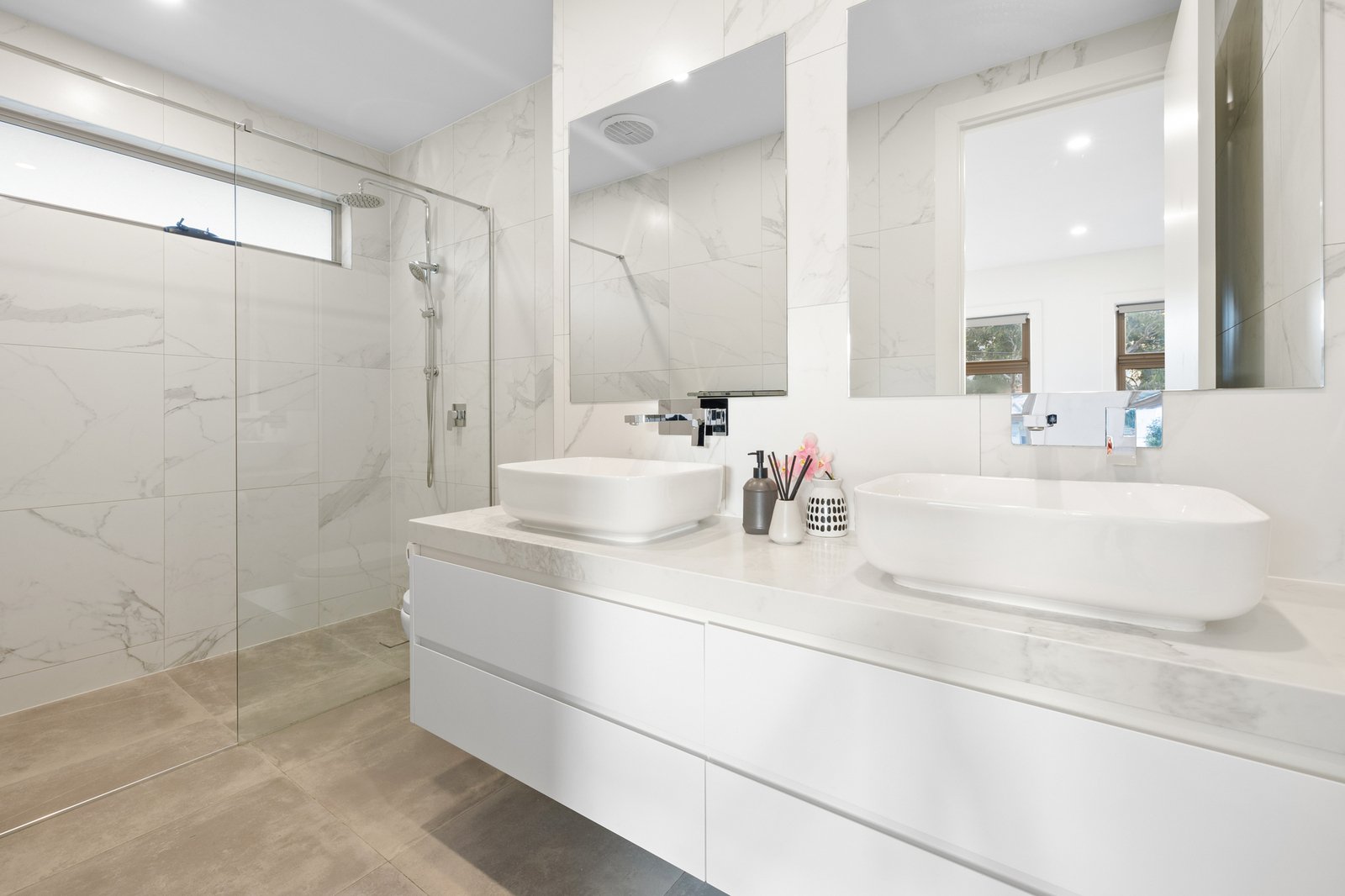 The home offers generous and flexible accommodation with master bedrooms on both levels, each featuring walk-in robes and elegant en-suite access. Upstairs, two additional bedrooms, both with built-in robes, provide comfortable space for multi-generational living or guests.