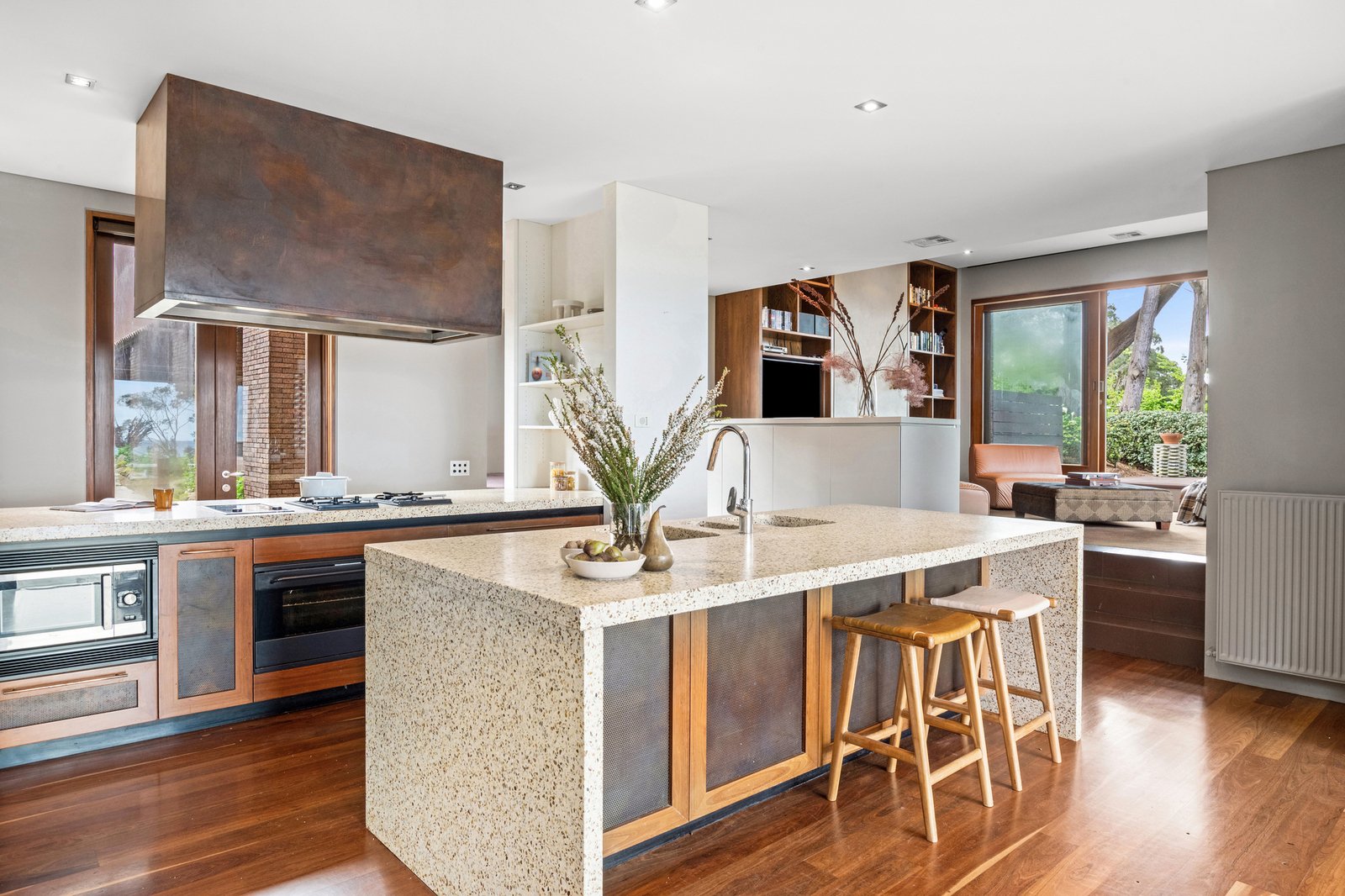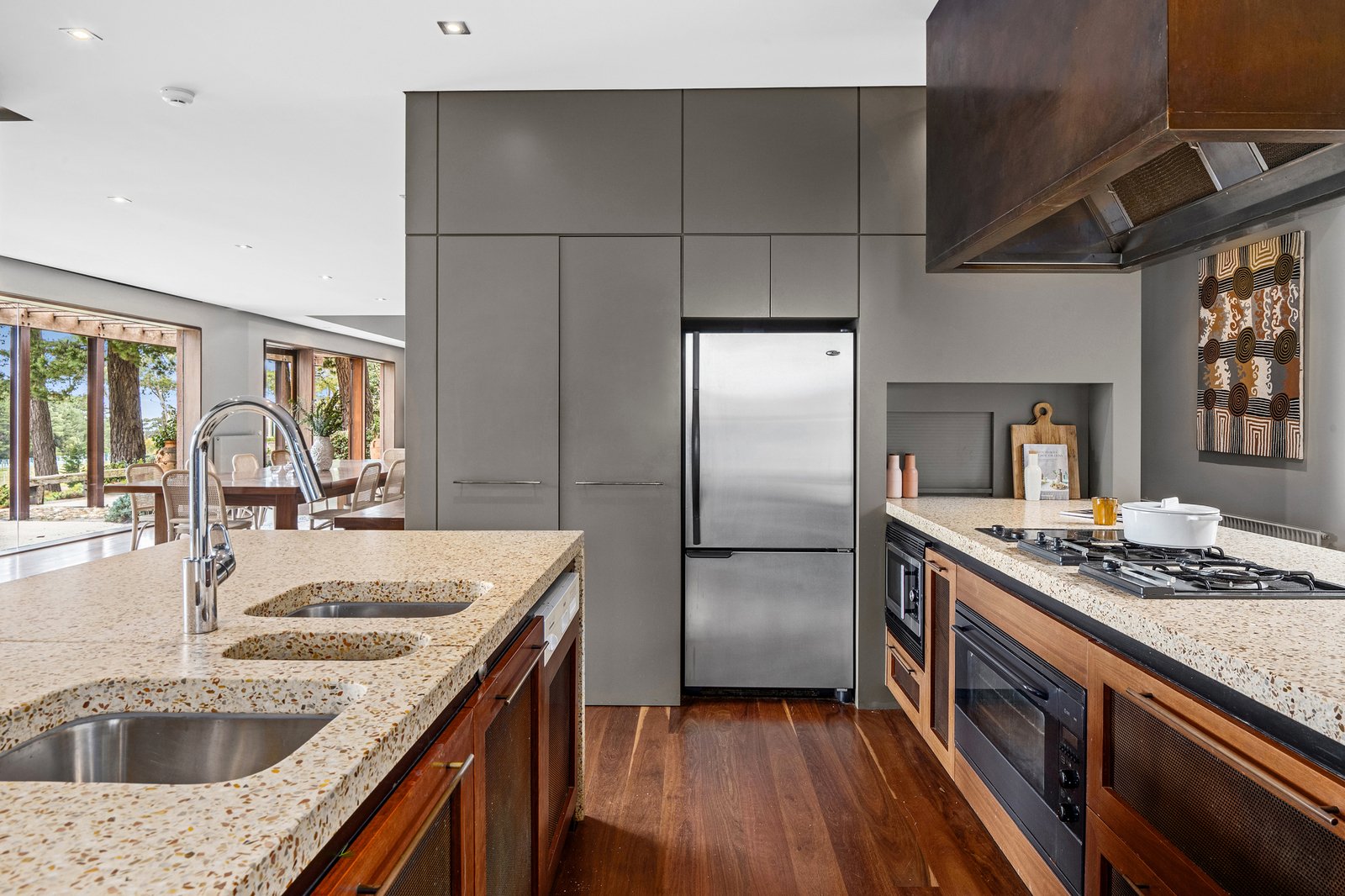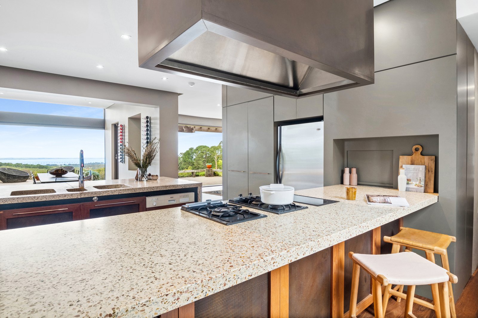 Draped in warm terrazzo and appointed with ILVE cooking appliances, the kitchen continues the impeccable approach to functional design with an integrated dishwasher and abundant preparation and storage space. A skylight channels daylight through the dining area, as retractable glass doors extend to the broad deck, encouraging entertaining outdoors amid transcendently calm scenery, with a second living and dining area nearby.