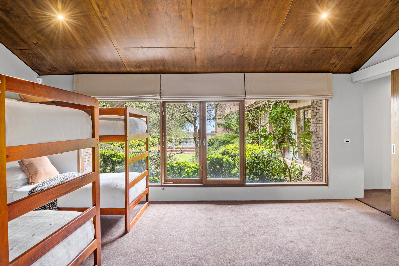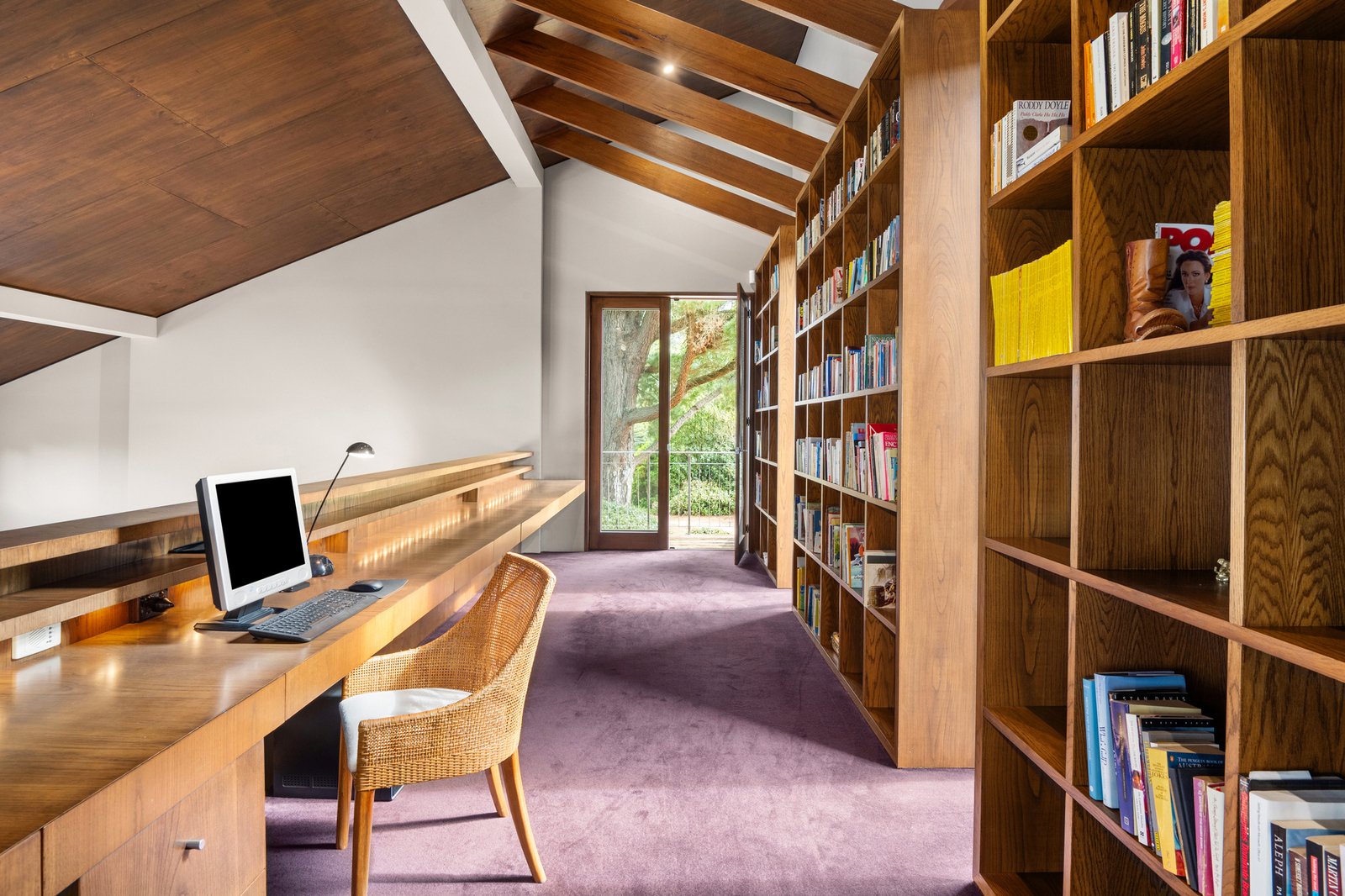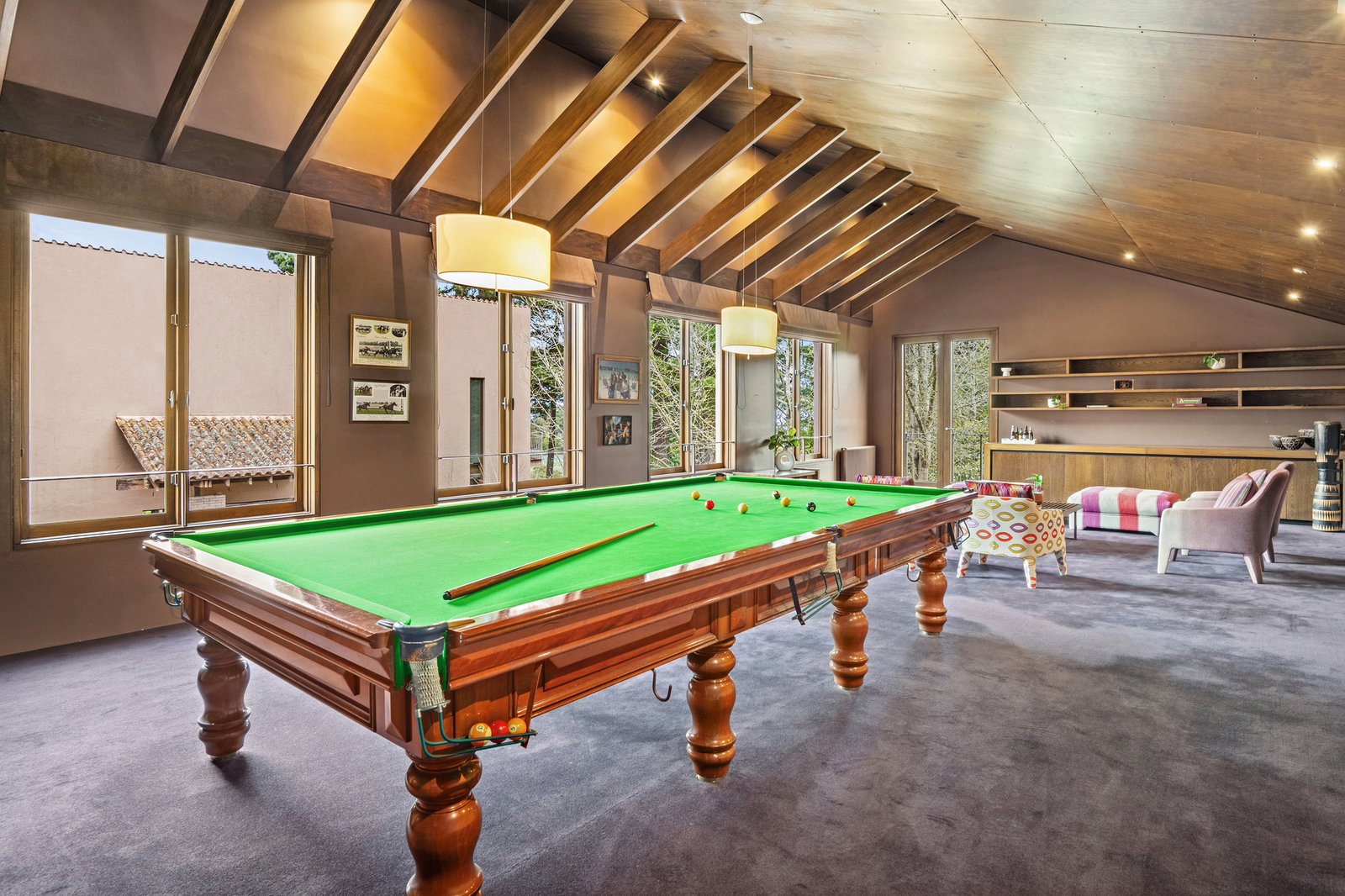 Stairs ascend to the primary retreat, a private realm complete with a library, integrated desk and eastern balcony. A walk-through robe and twin-vanity ensuite enhance the indulgence, while a further flight rises to the tower, a lofty vantage uniting a trilogy of water views including the outdoor spa, dam and ocean. Along the hallway, four additional robed bedrooms and two bathrooms enjoy leafy garden outlooks, while an upper billiards room offers a more relaxed area for play or quiet retreat.