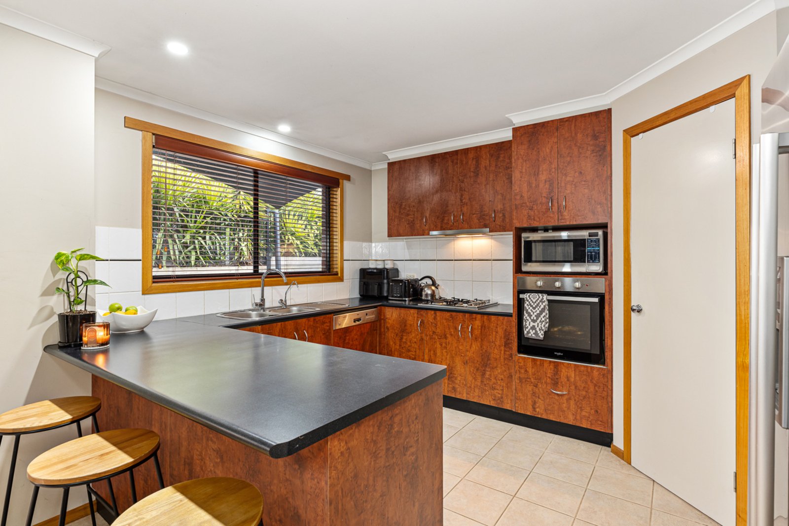 complemented by a split system and ceiling fan. The well-appointed kitchen offers a gas cooktop, electric