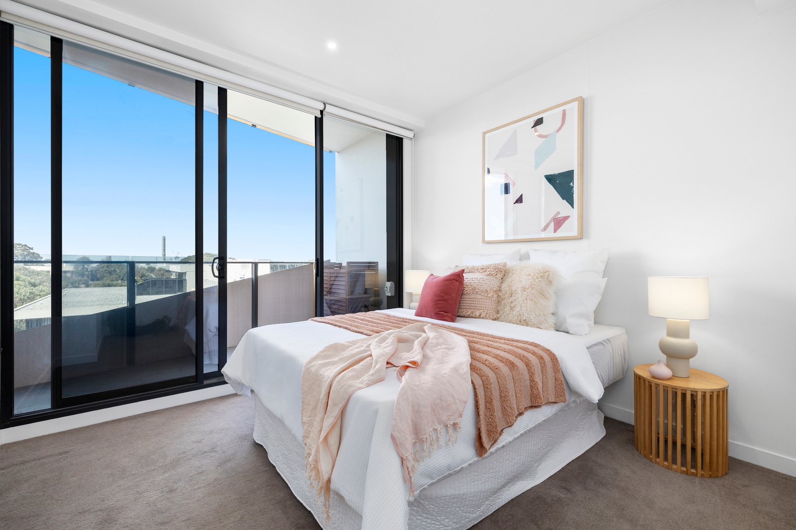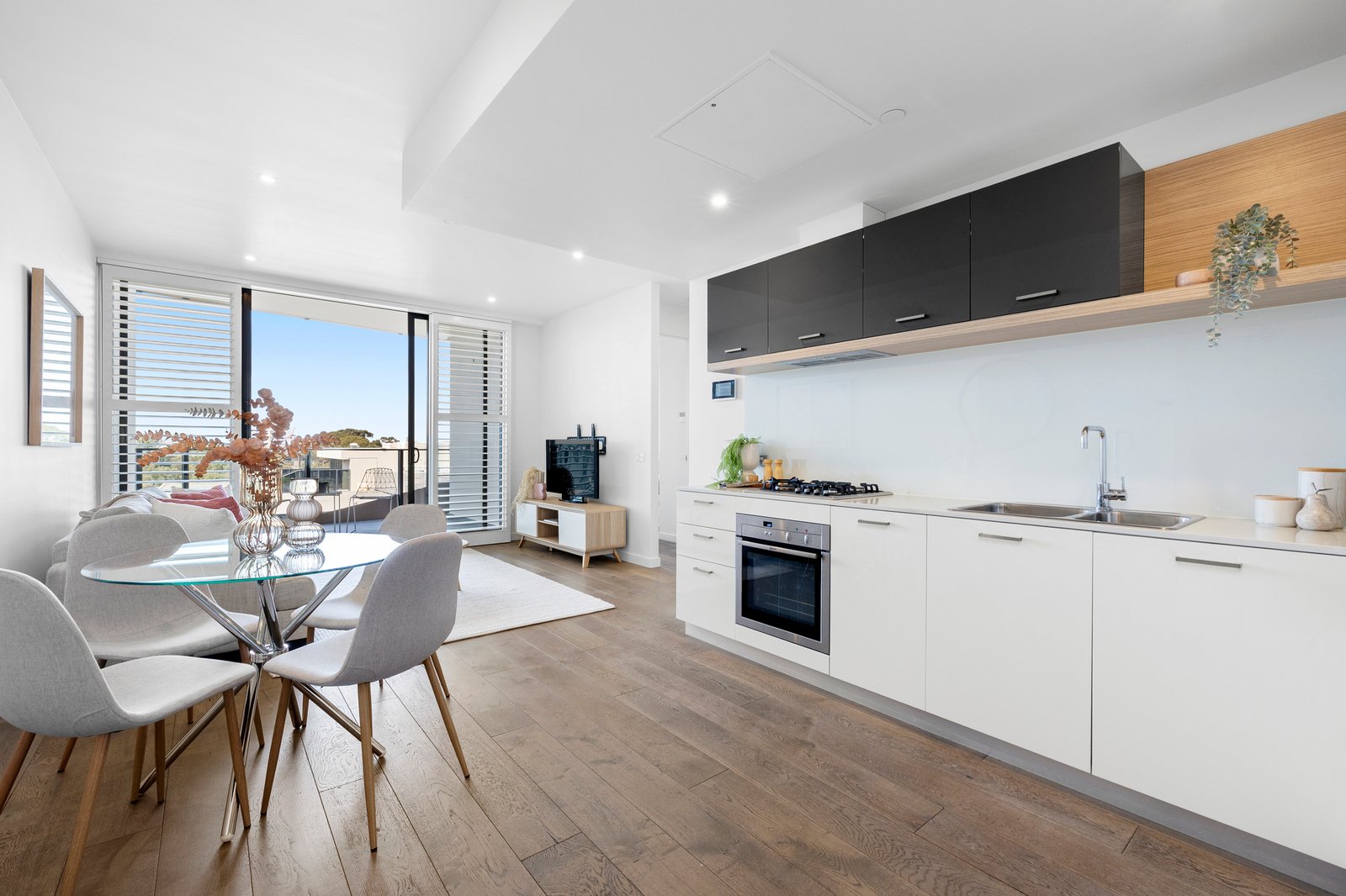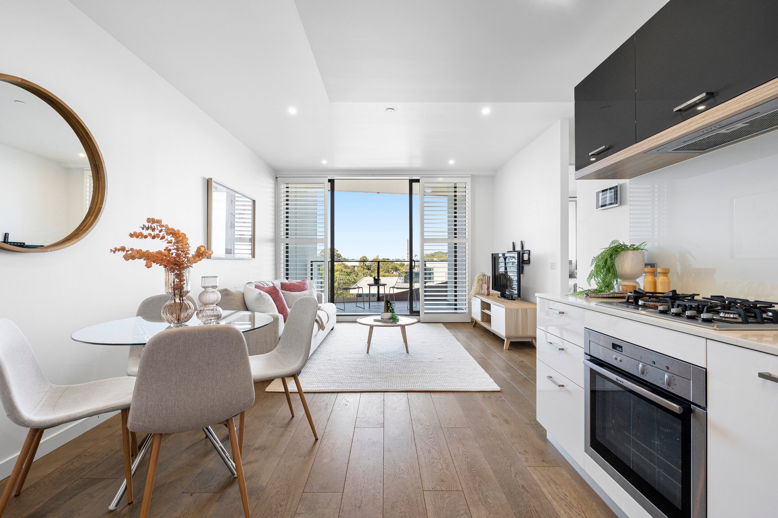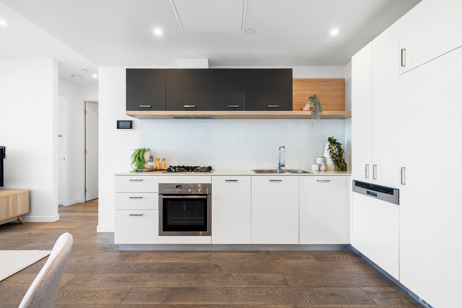Perfectly positioned at the rear of the complex, the apartment captures beautiful parkland views and an abundance of natural light. The gourmet Caesarstone kitchen features Neff appliances, an integrated fridge-freezer, soft-closing cabinetry, and elegant stone benchtops.