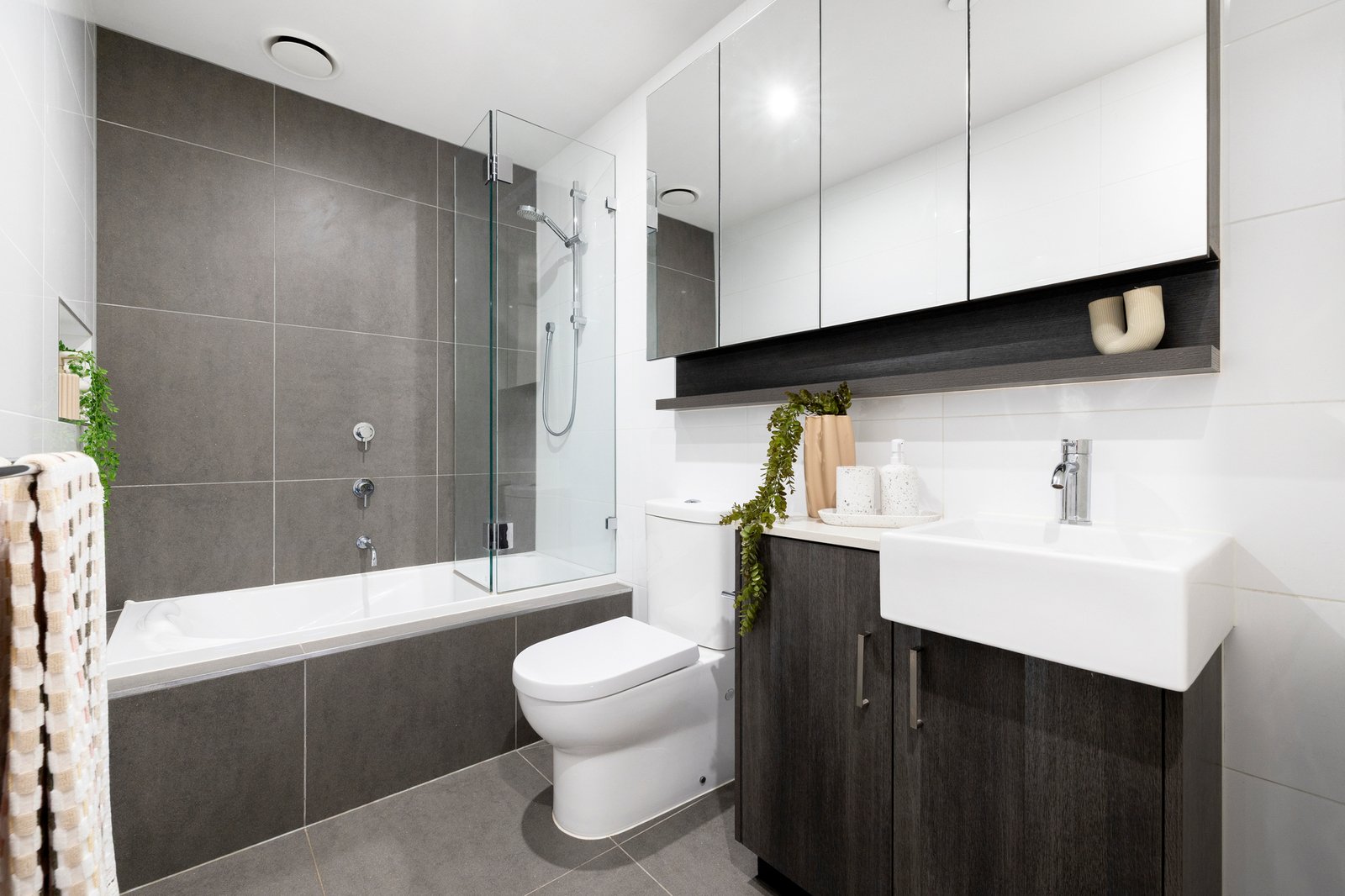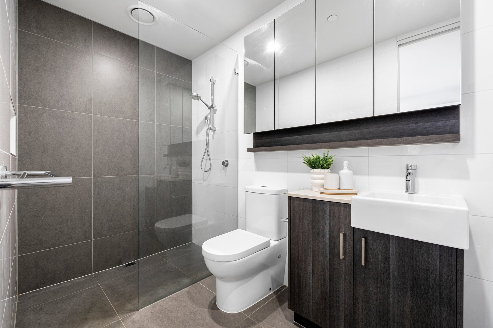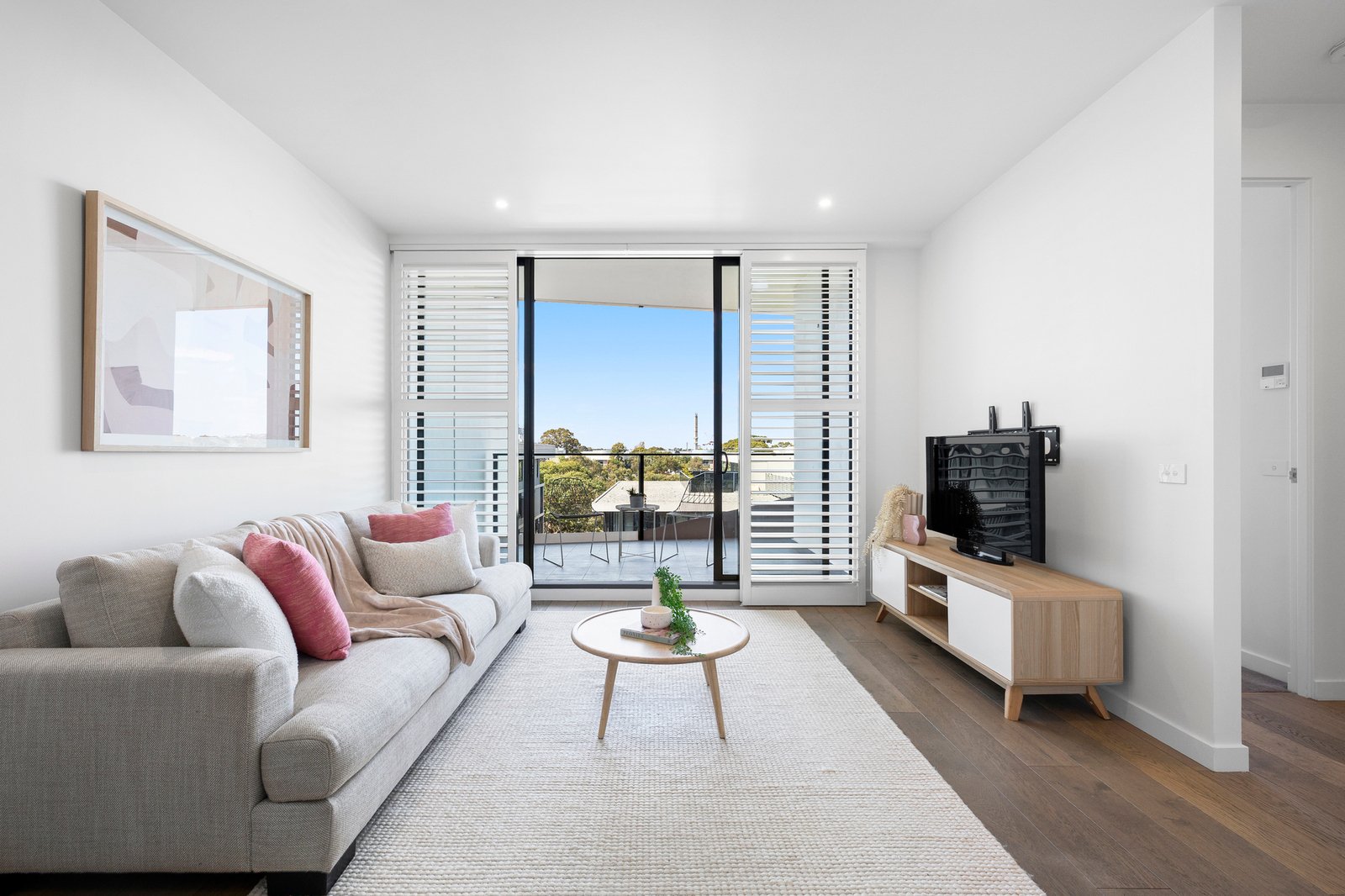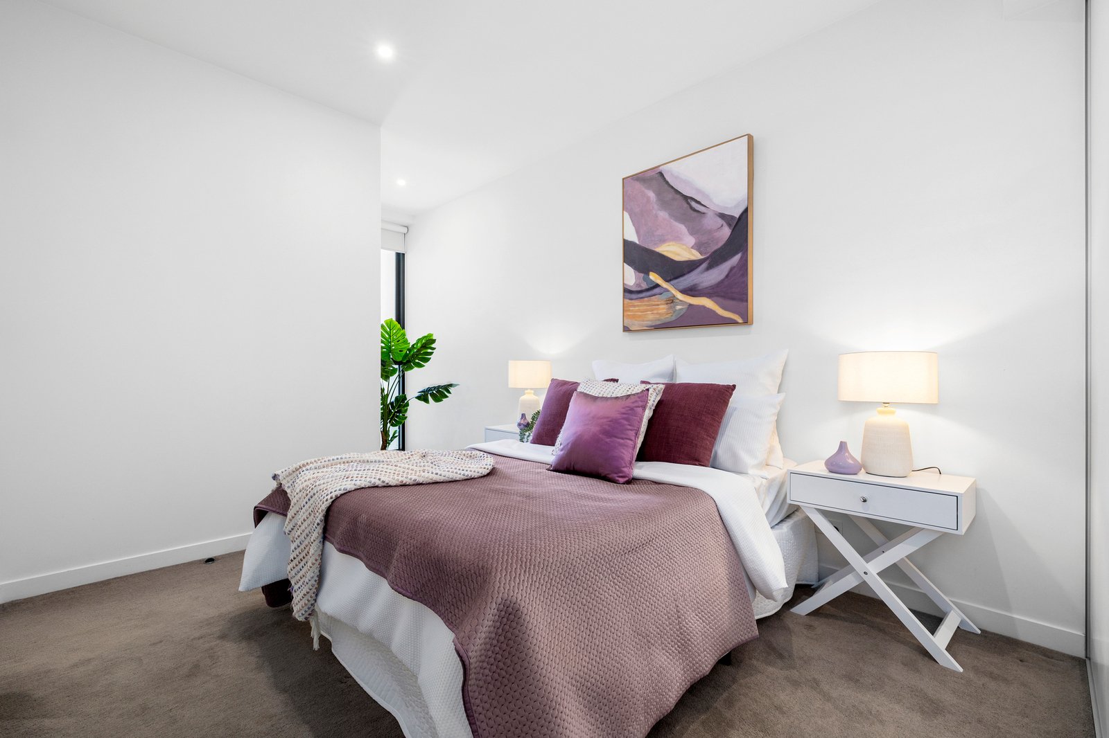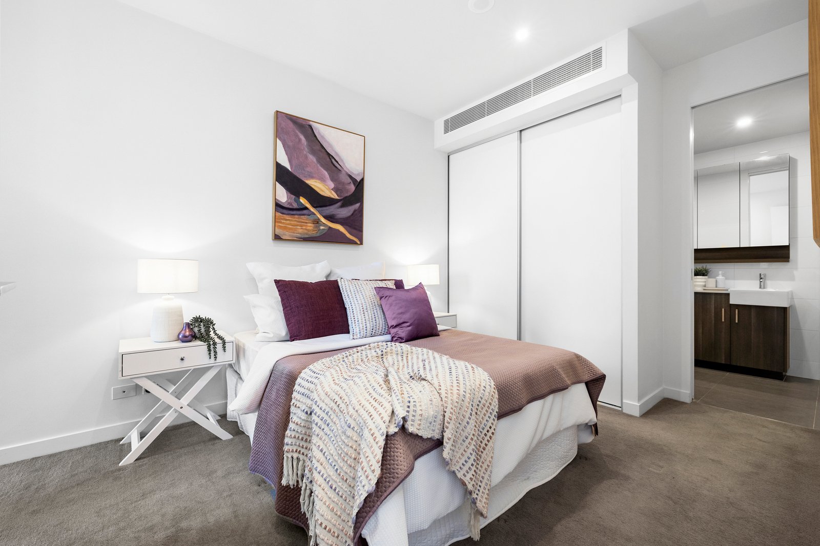 Perfectly positioned at the rear of the complex, the apartment captures beautiful parkland views and an abundance of natural light. The gourmet Caesarstone kitchen features Neff appliances, an integrated fridge-freezer, soft-closing cabinetry, and elegant stone benchtops.