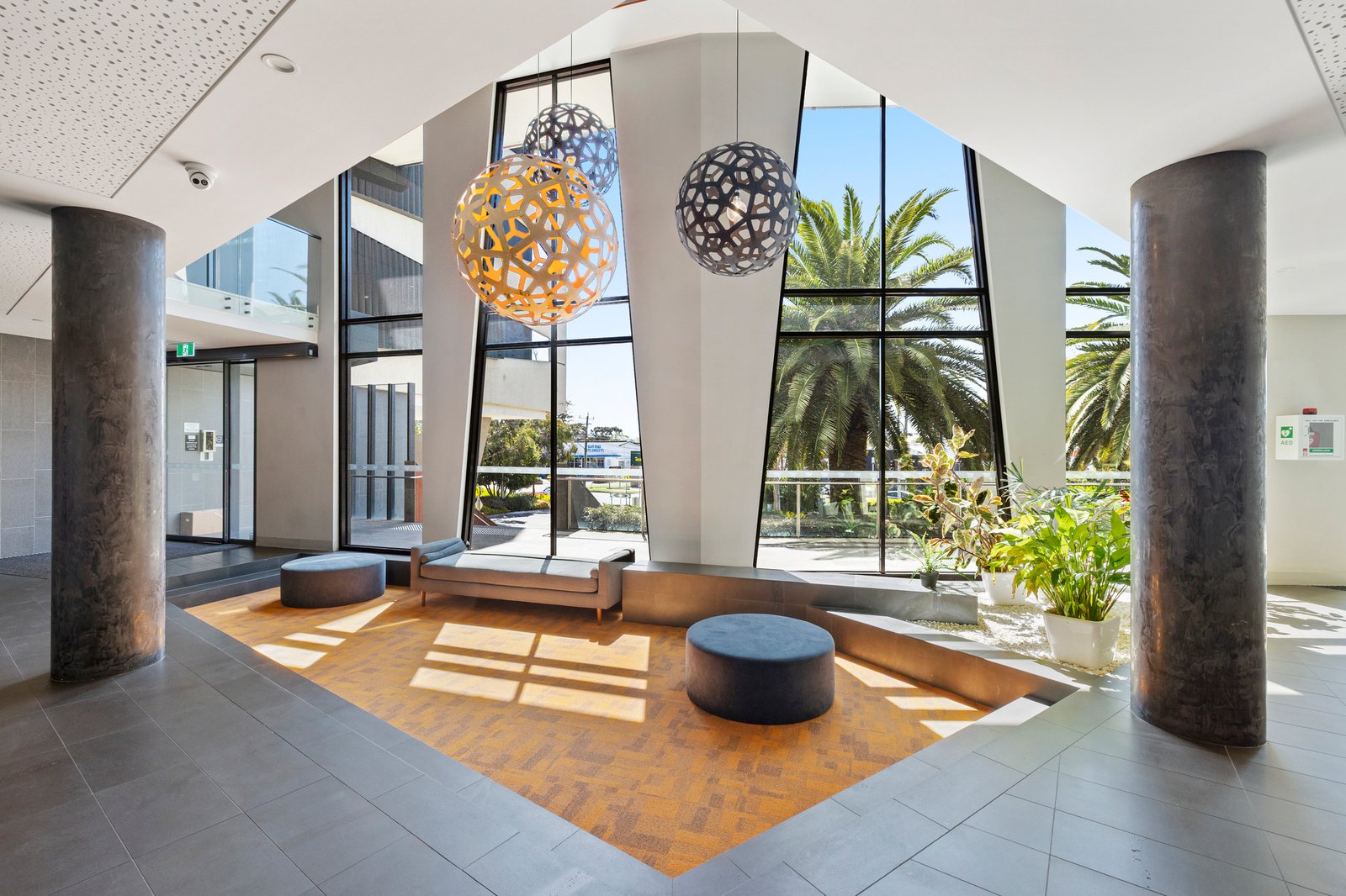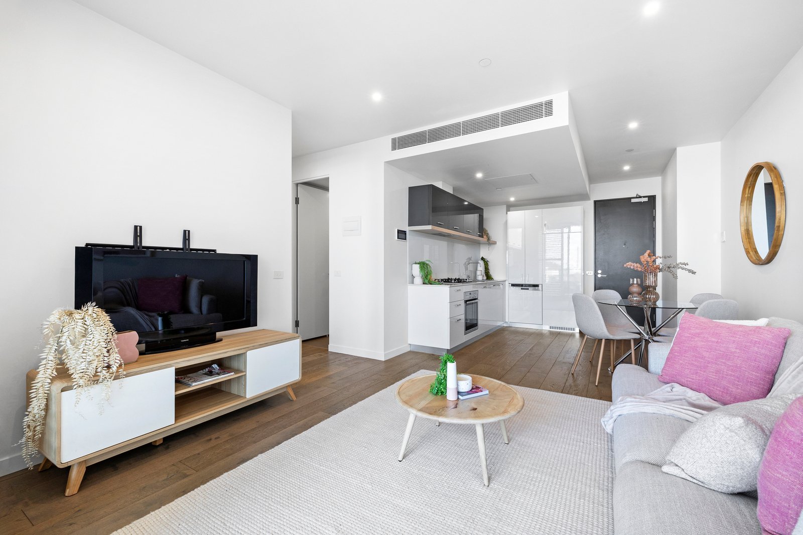 The open-plan living and dining area is enhanced by European Oak flooring and full-height double-glazed windows that open to a private balcony — ideal for relaxing or entertaining. Both double bedrooms include built-in robes, with the master enjoying ensuite access. The second bedroom also connects to the balcony, while the sleek main bathroom offers a bath and concealed laundry facilities.