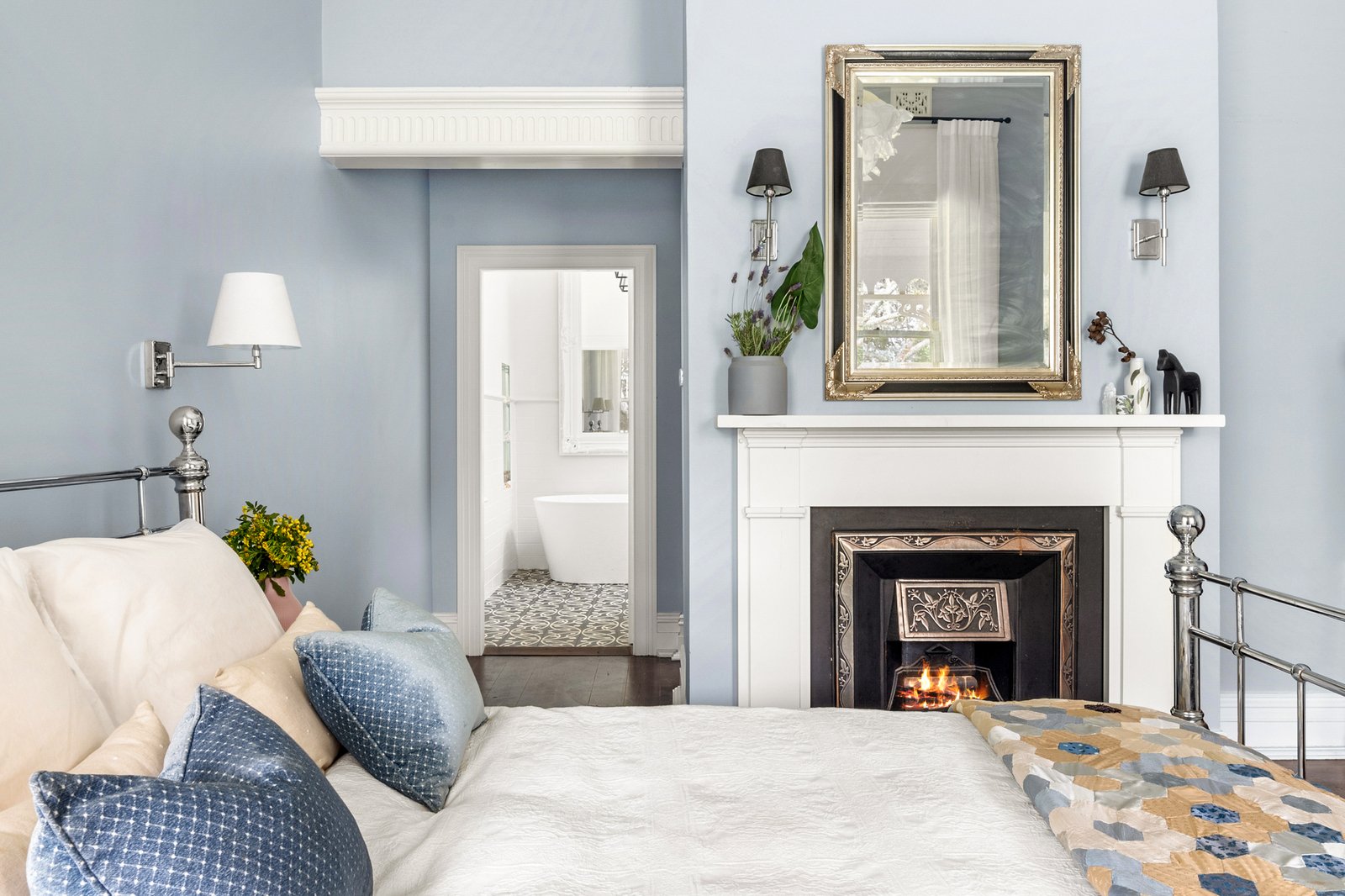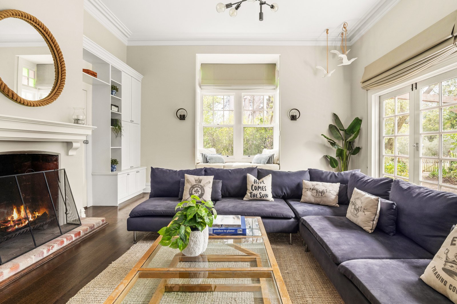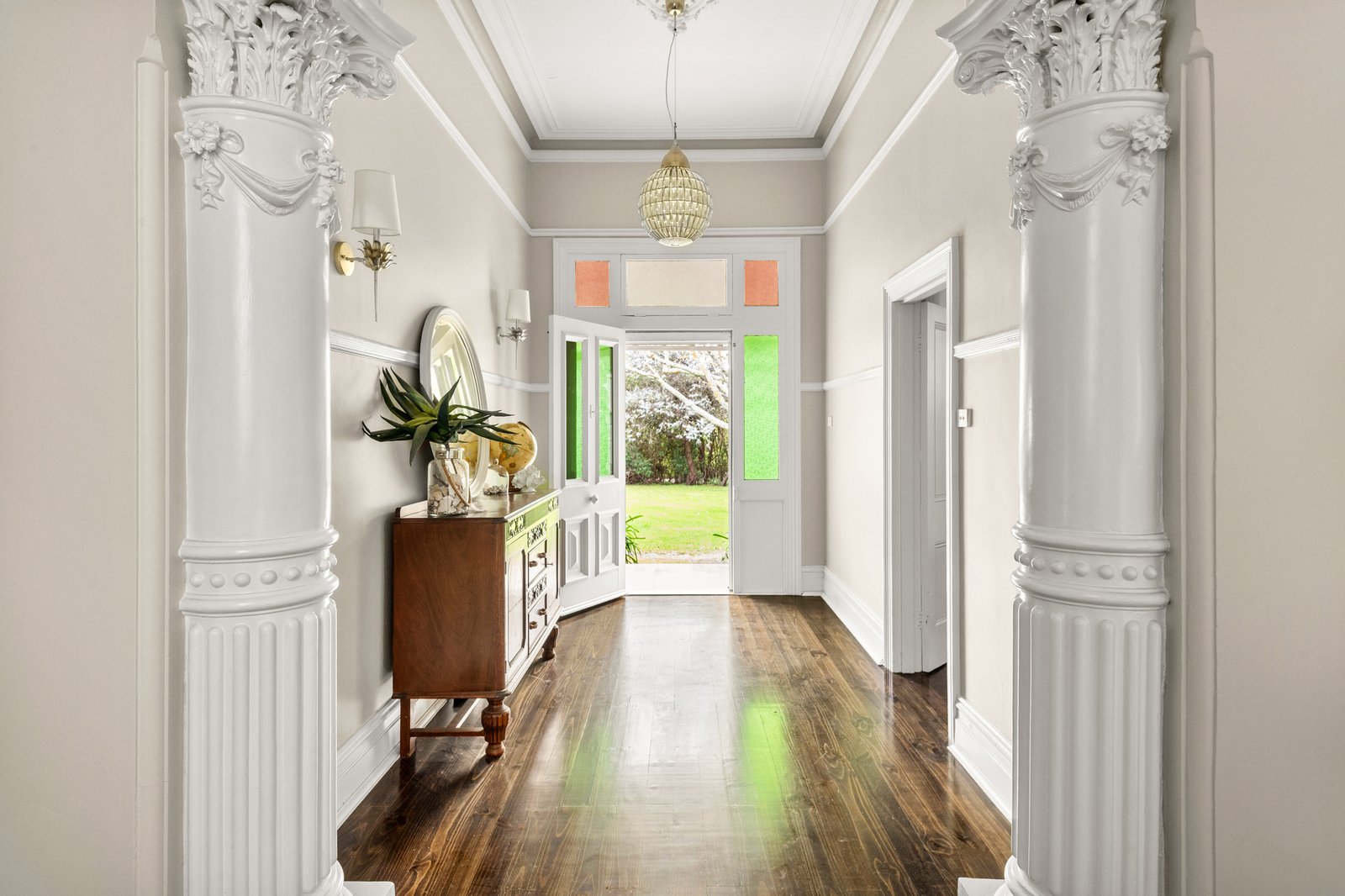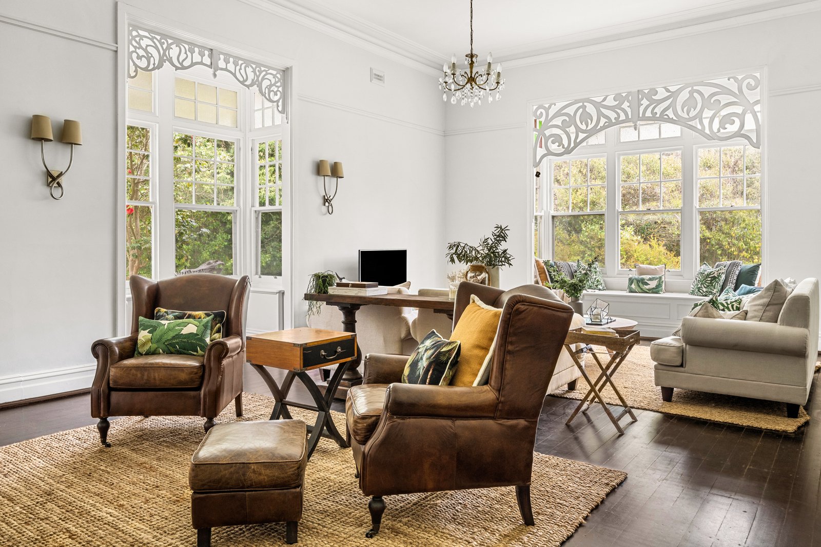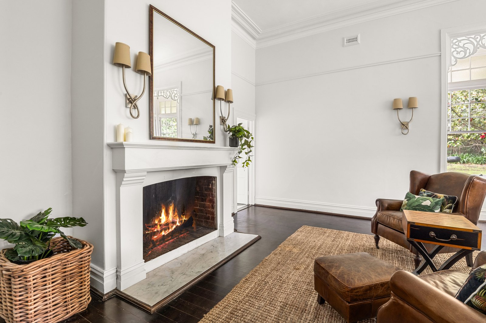 Period details include soaring ceilings adorned by ornate plaster roses and chandeliers, leadlight features, and a Corinthian archway that carries the artistry of a bygone era into the present with ease. Two fireside living areas extend gracefully to the verandah, the more formal of the pair softened by a wide sash window seat framed by elegant fretwork while the second adopts a casual air complemented by French doors opening to a wisteria-draped pergola and outdoor fireplace.