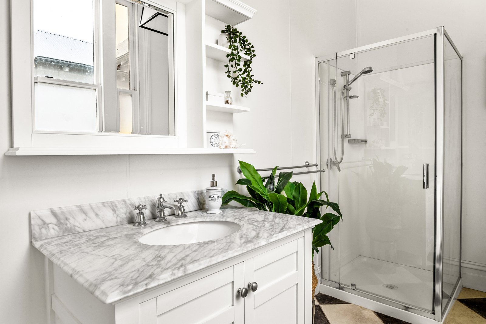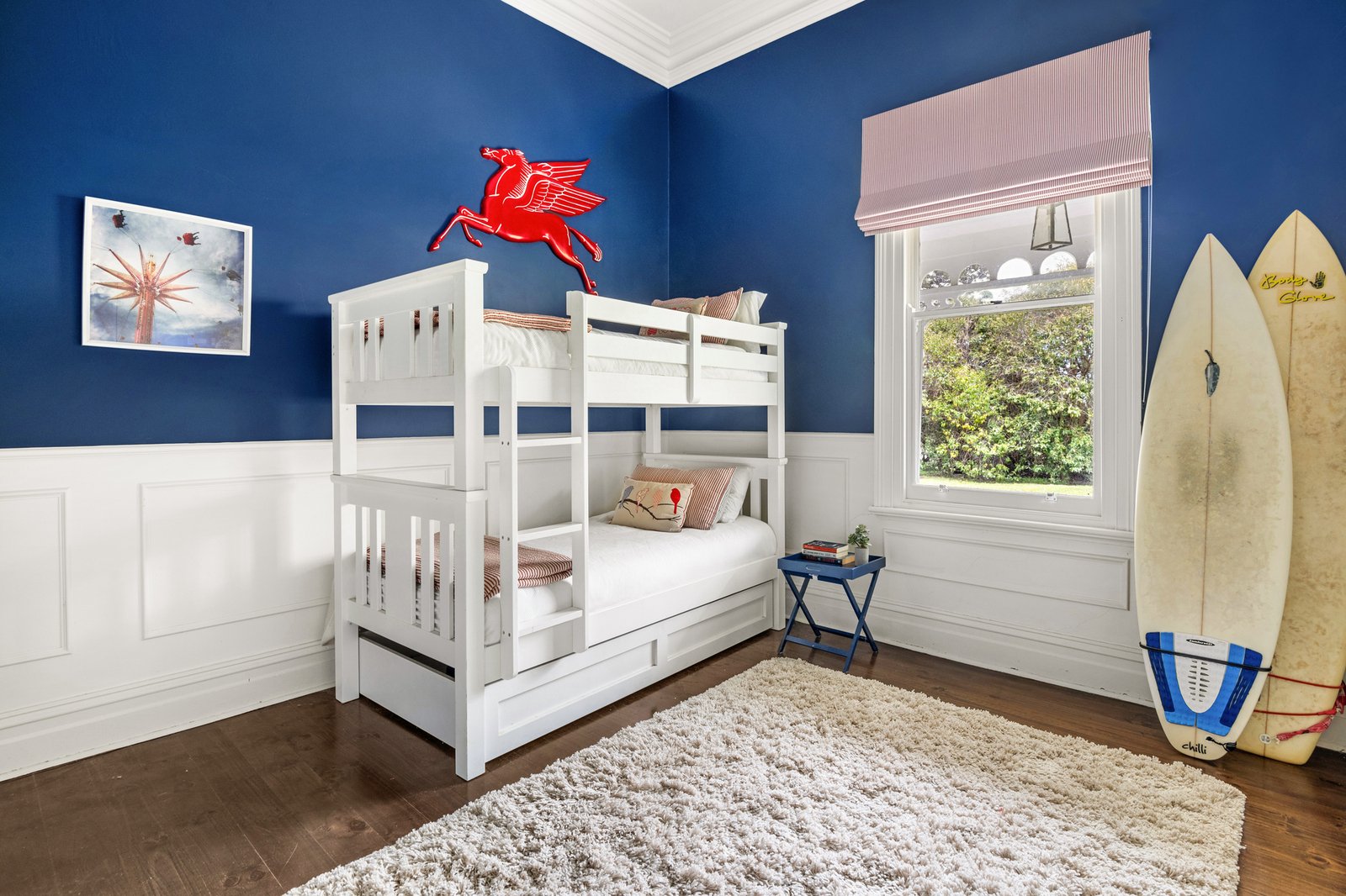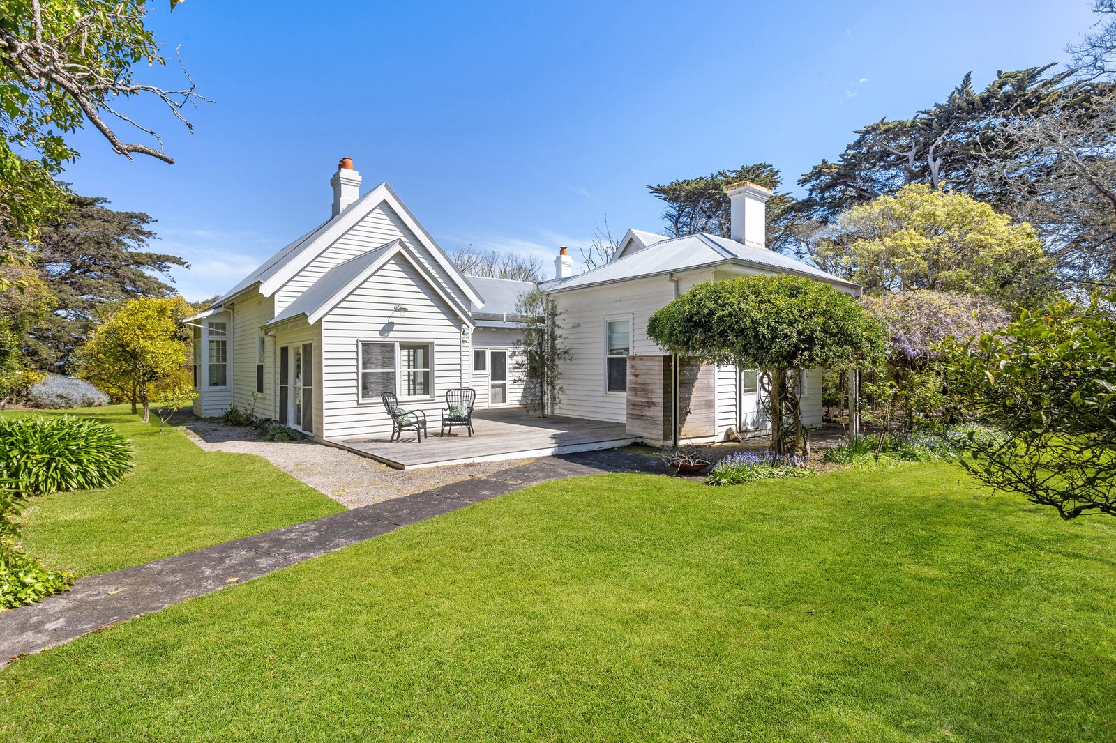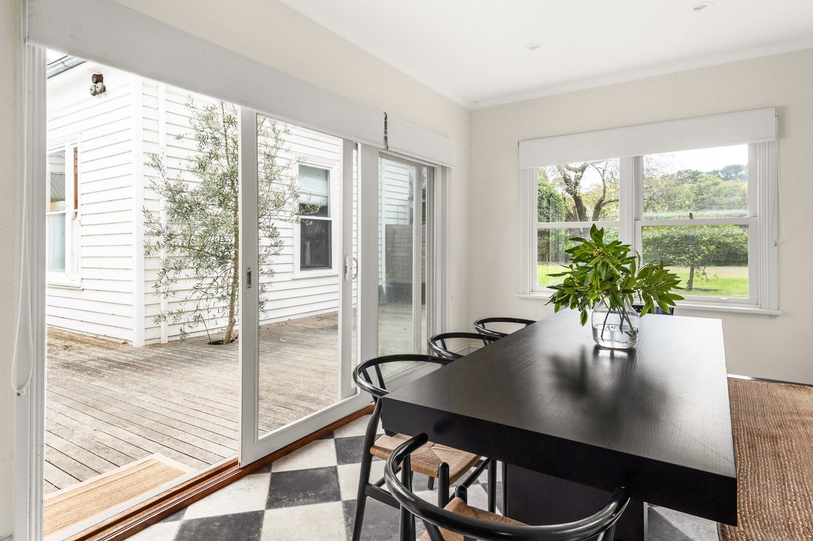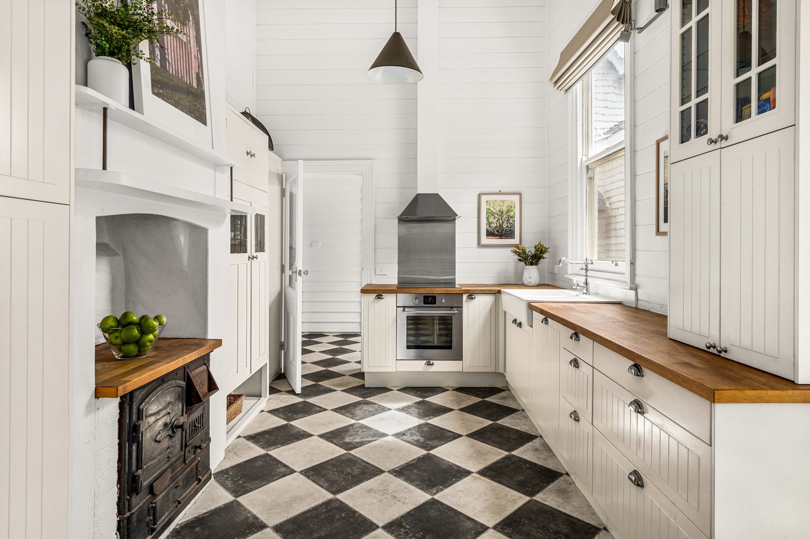 Tastefully reimagined, the farmhouse-inspired kitchen breathes fresh life into timber benchtops and a butler’s sink, complemented by an original cast-iron stove preserved within panelled walls and checkerboard flooring, and adjoining a dining room that extends seamlessly onto a broad sun-filled deck for outdoor entertaining.