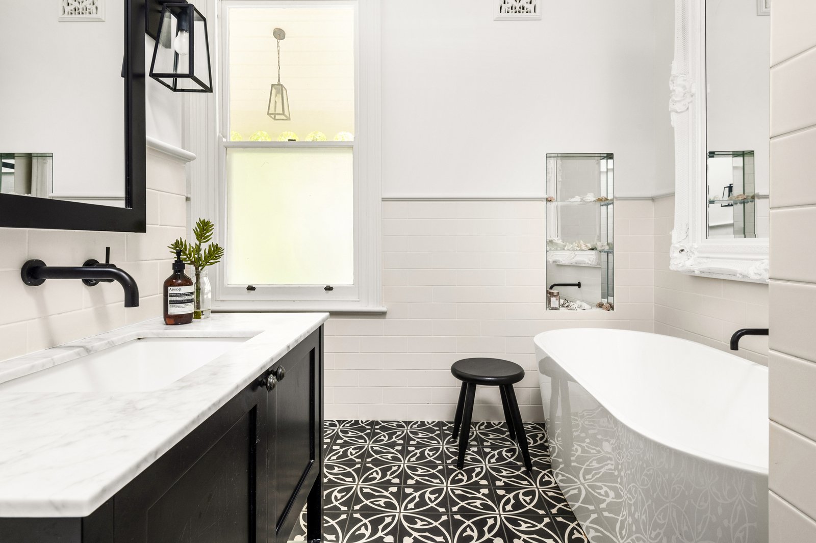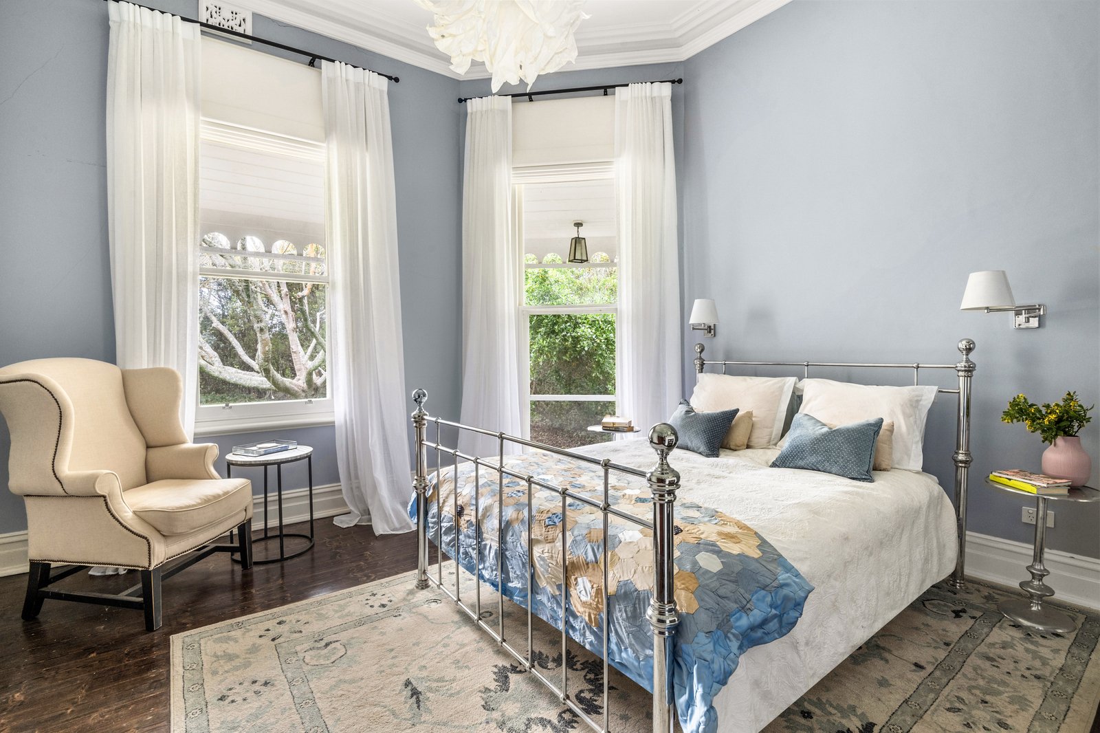 Richly stained hardwood floors ground the three spacious bedrooms, including a luxurious primary suite with a statement ruffle pendant, walk-in robe and ensuite with a freestanding bath.