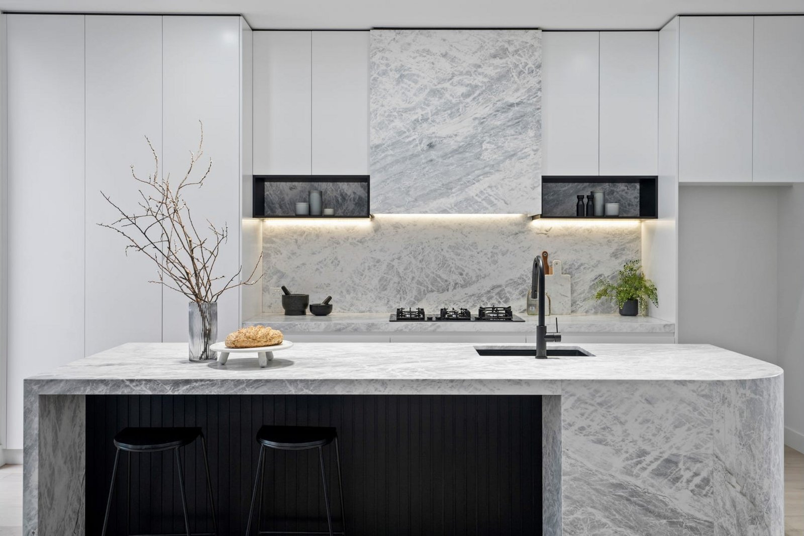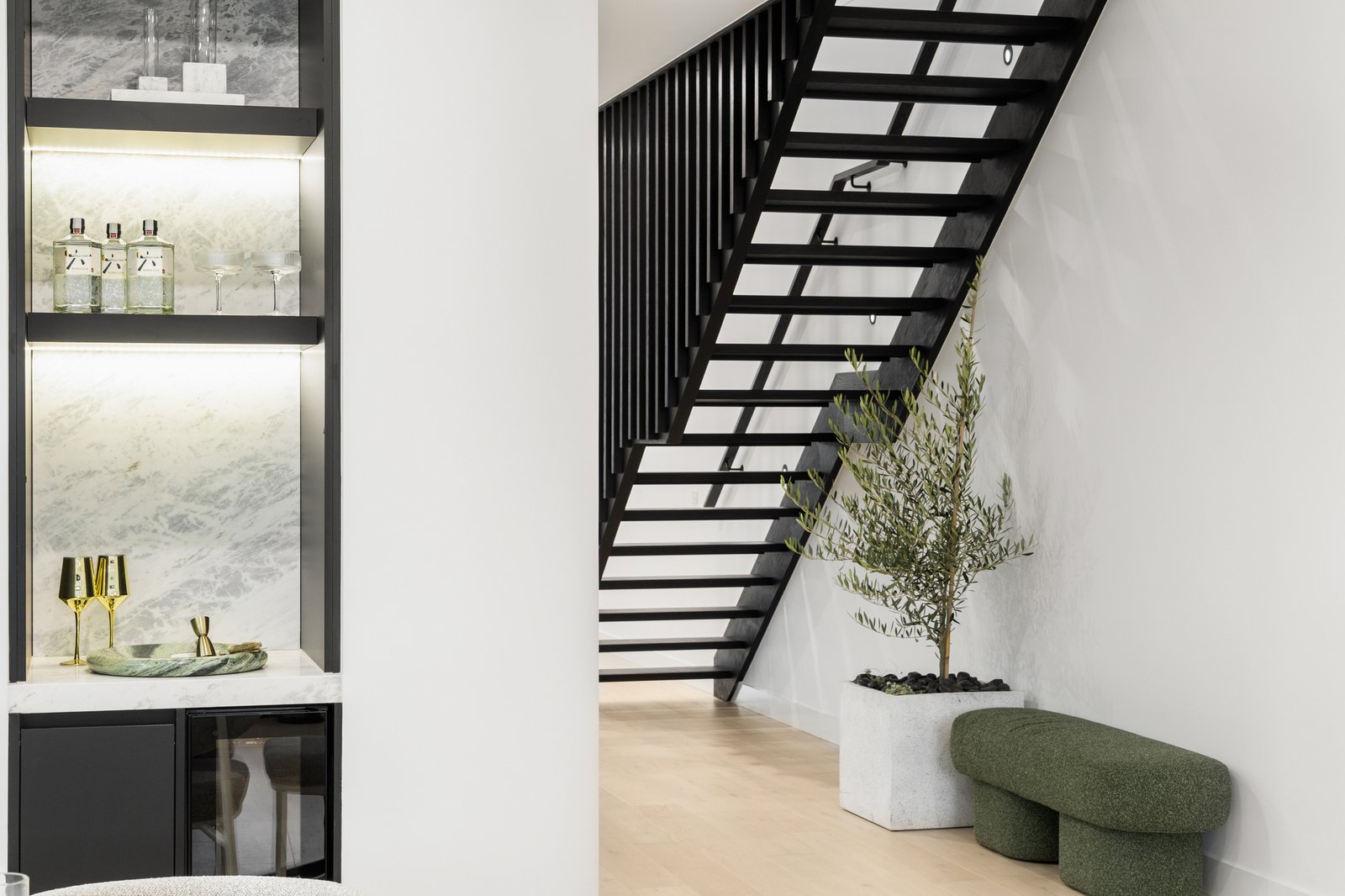 Elegant design details abound, from sweeping curved walls and full-height double-glazed windows to striking marble surfaces and white-washed French oak floors. Soaring 3m ceilings and strategically placed skylights bathe the interiors in natural light, enhancing the sense of openness and calm.