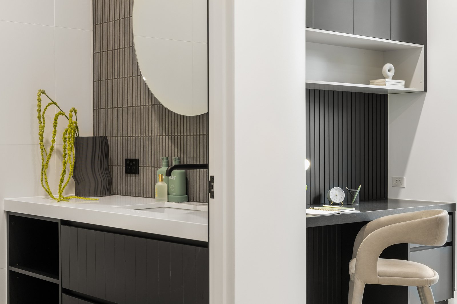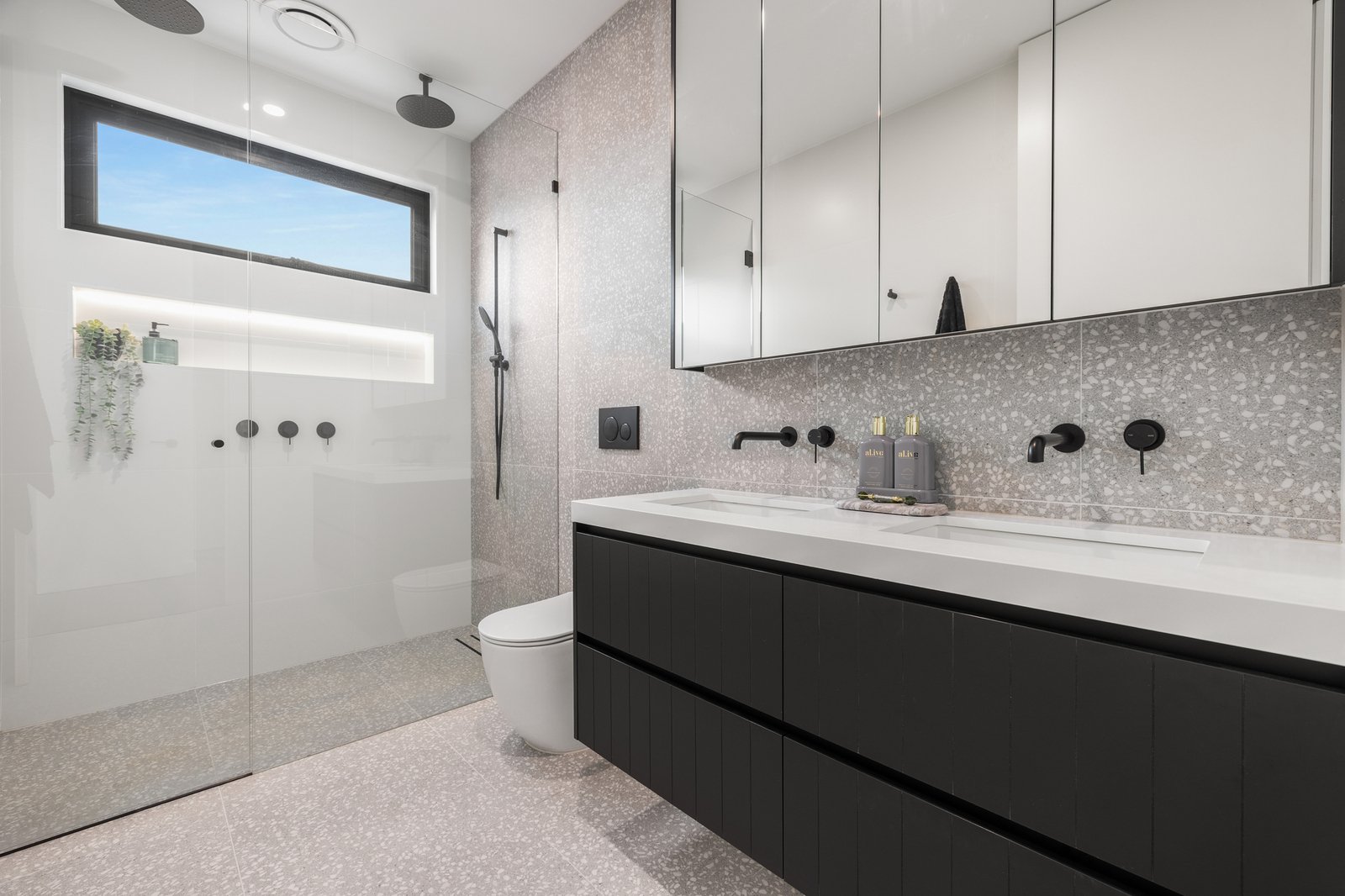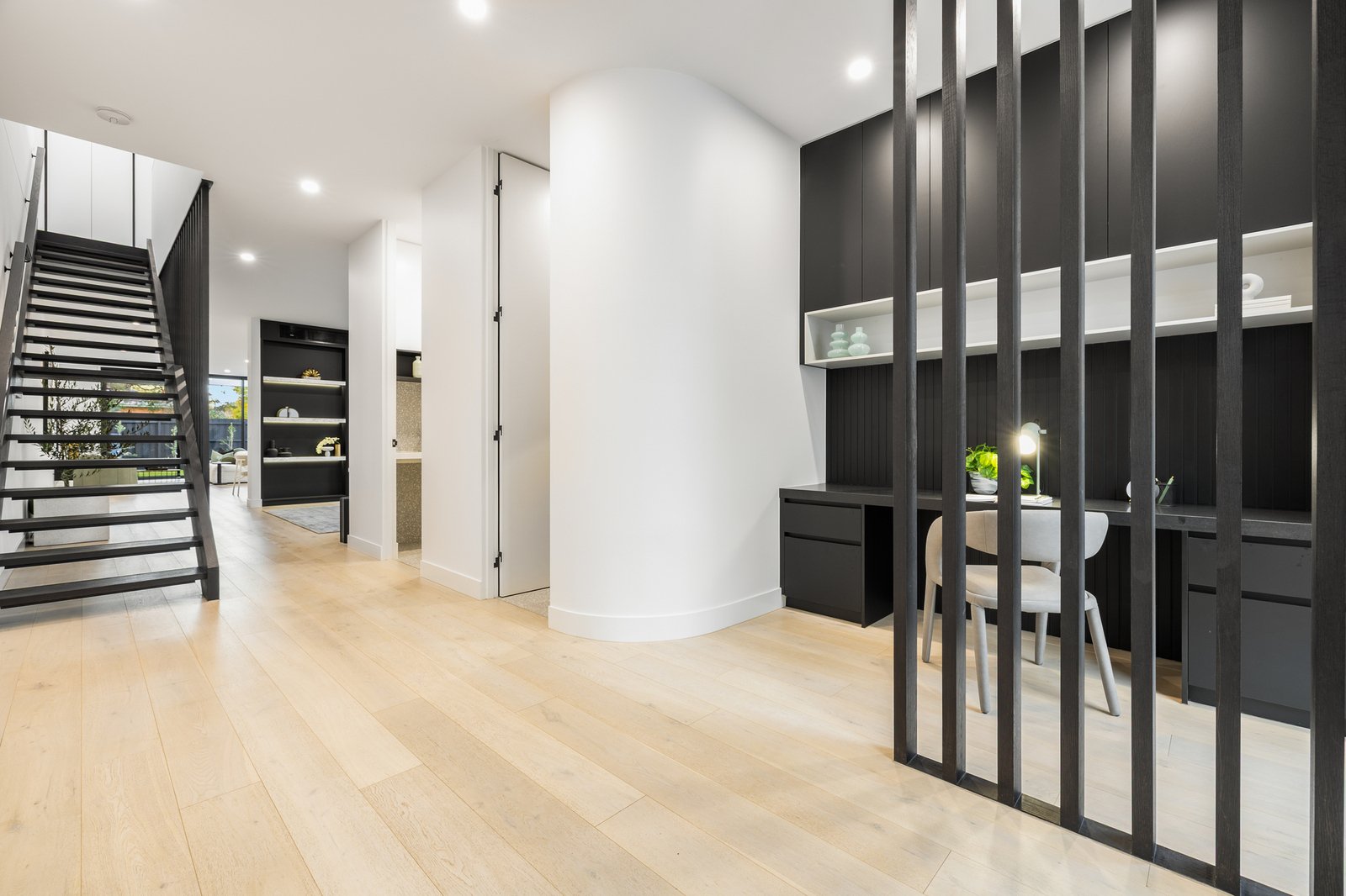 Upstairs, a black French oak staircase leads to a spacious retreat, a fitted study nook, and four robed bedrooms – including a luxurious master suite with a fully tiled ensuite featuring a double shower. A beautifully appointed family bathroom completes the upper level.