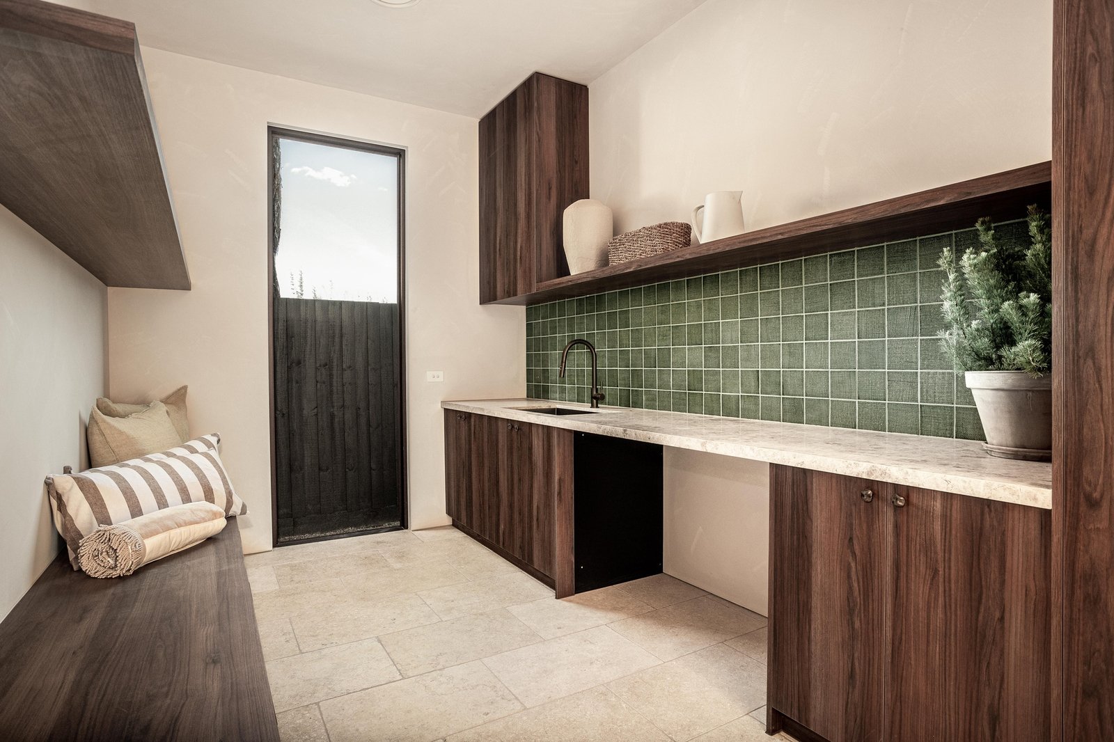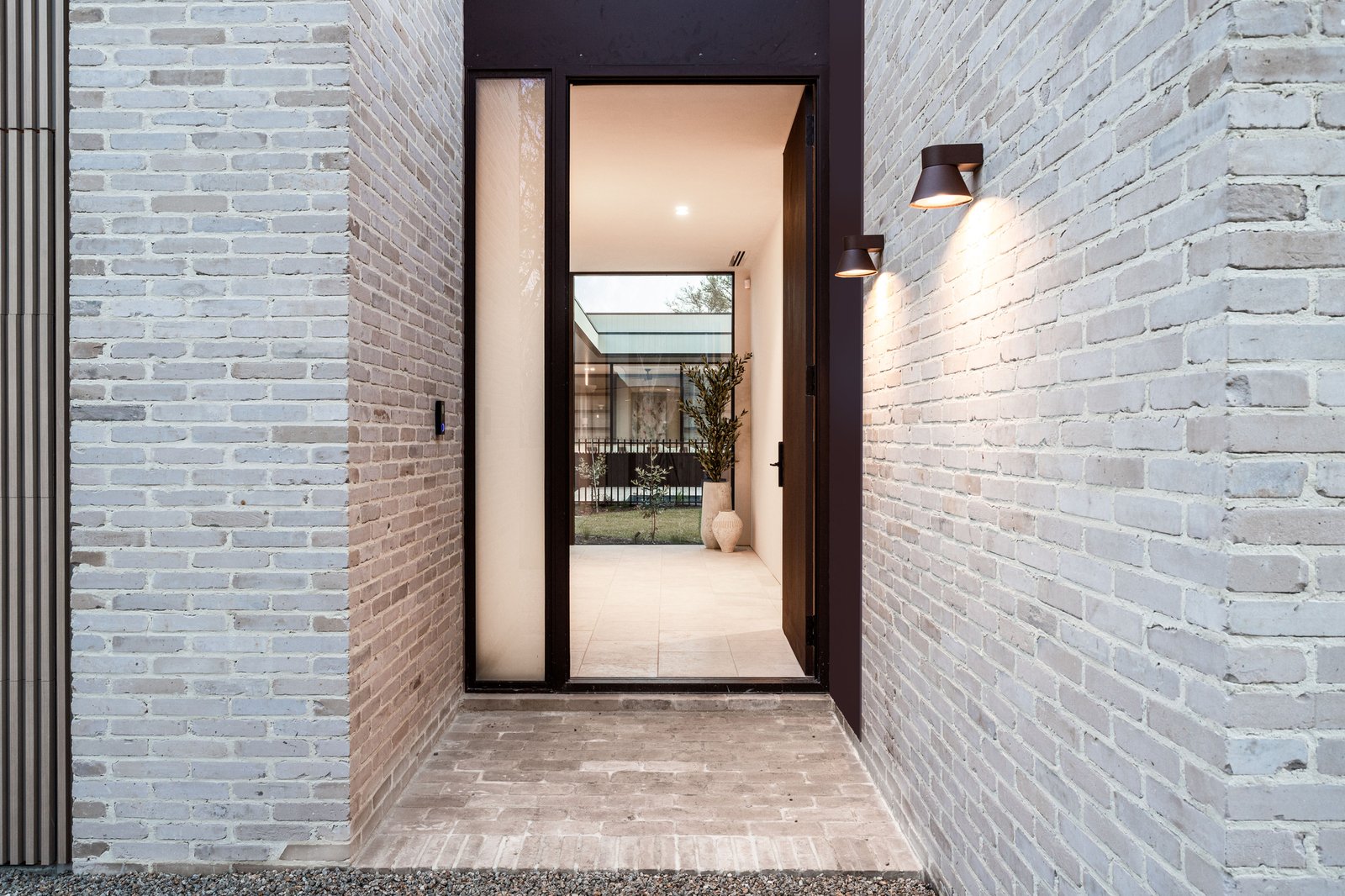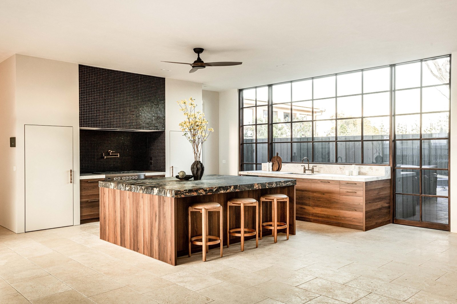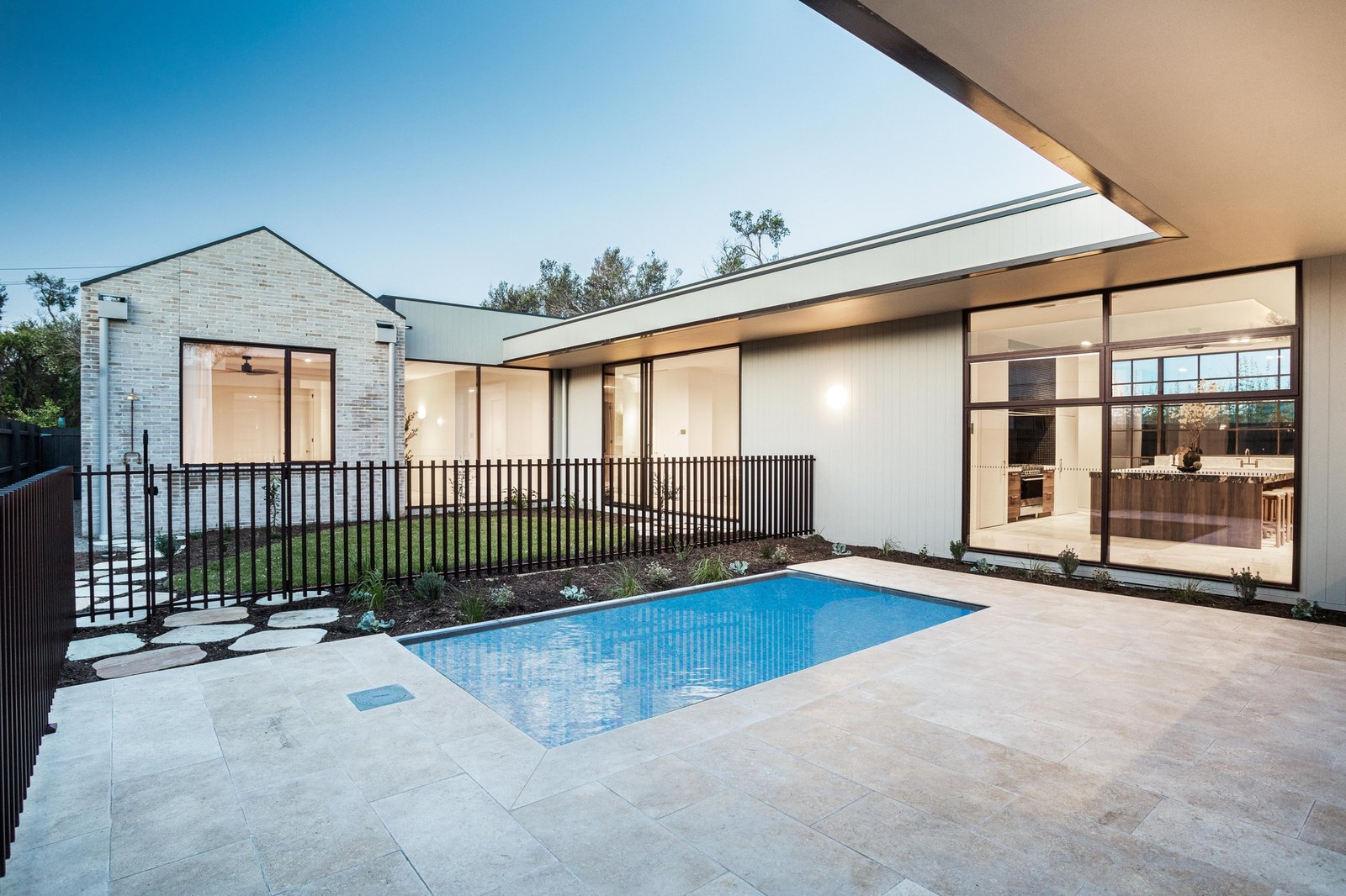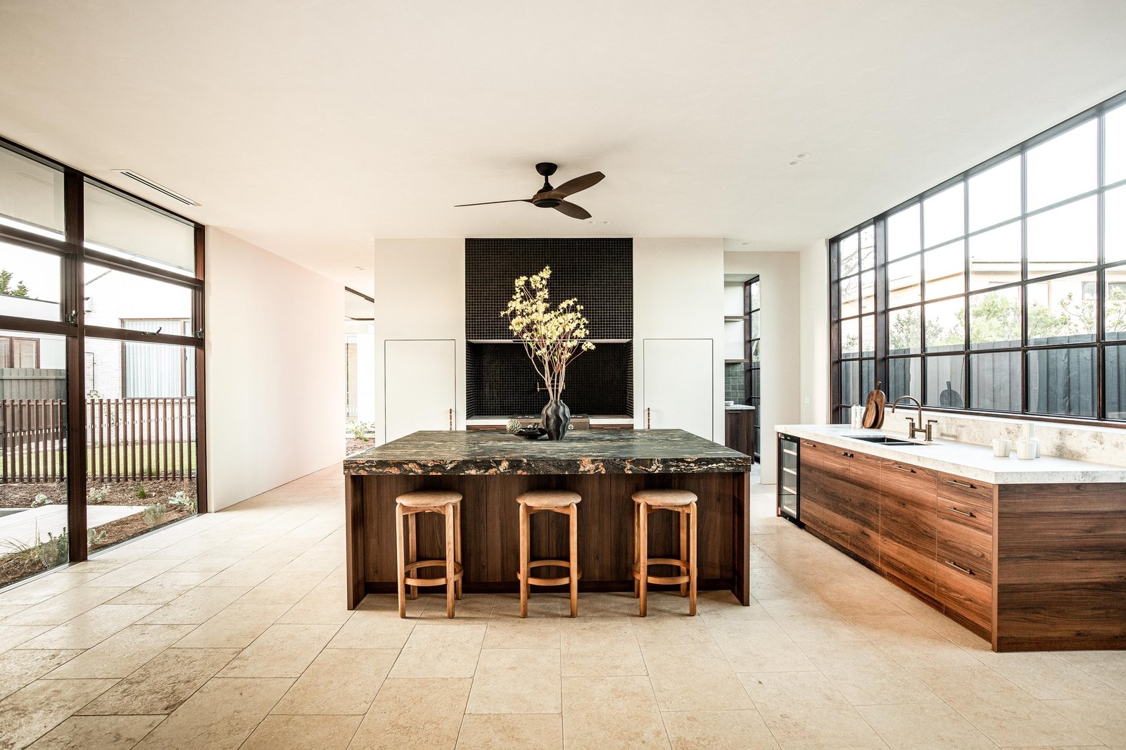 Beyond a striking façade of reclaimed brick, every detail has been executed with tactile precision. Thresholds flow without interruption beneath soaring three-metre ceilings and full-height doors, while underfloor hydronic heating warms the Brick-pattern Egyptian limestone across the main living spaces. Intelligent zoning provides privacy between four bedrooms and three refined bathrooms, including two rear main suites with indulgent en-suites. Turkish marble, natural stone, and limewashed wall and ceiling finishes bring visual continuity through open living and dining areas to a showpiece kitchen, appointed with Cosmic Black Brazilian stone, integrated Miele refrigeration, and premium Fisher & Paykel appliances. Outdoors, the landscaping celebrates the site's established Ti Tree and Moonah, layering in feature lighting, travertine pavers, an outdoor shower, and irrigation around a heated pool with spa jets, as well as a generous dining terrace.