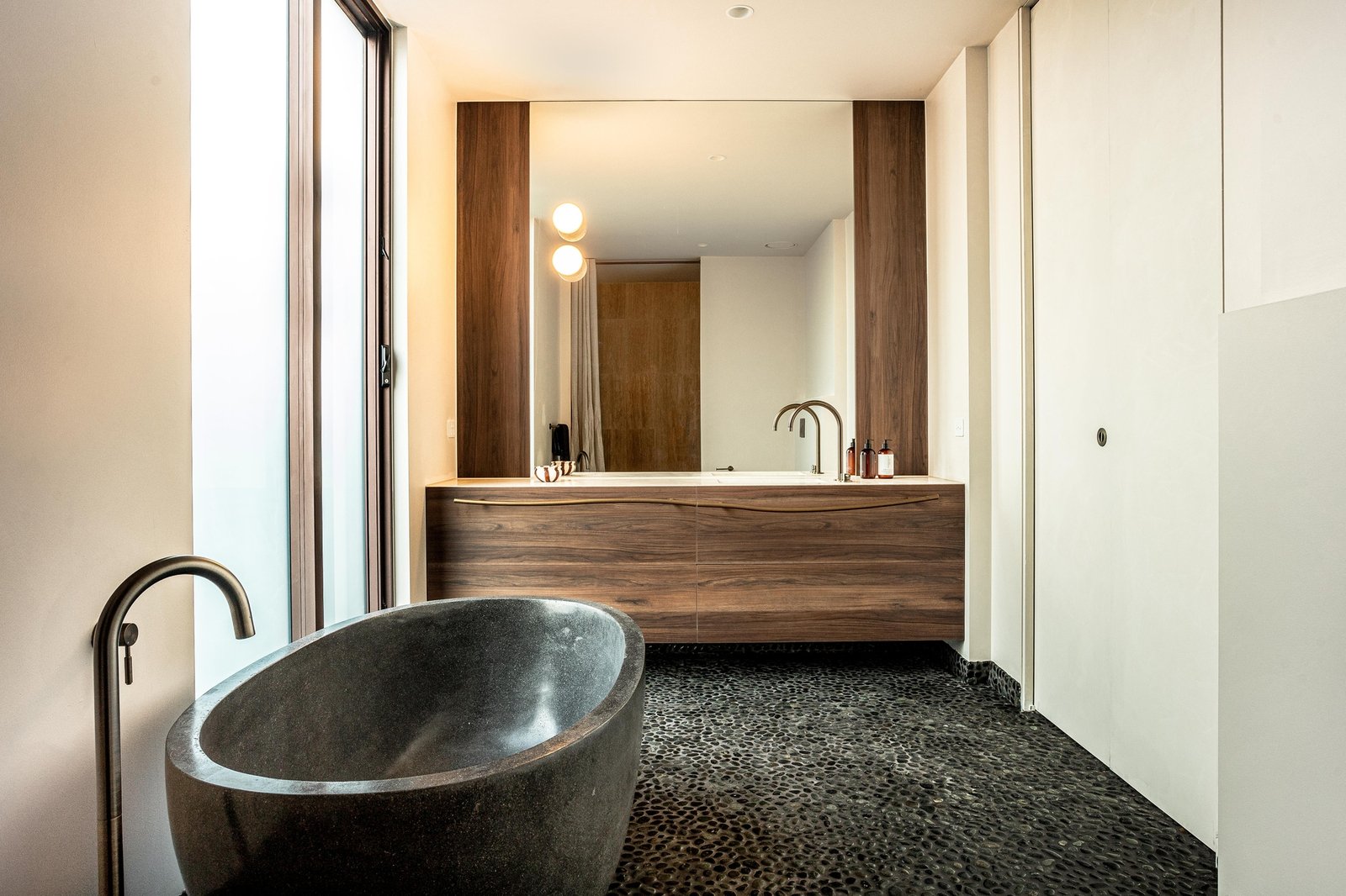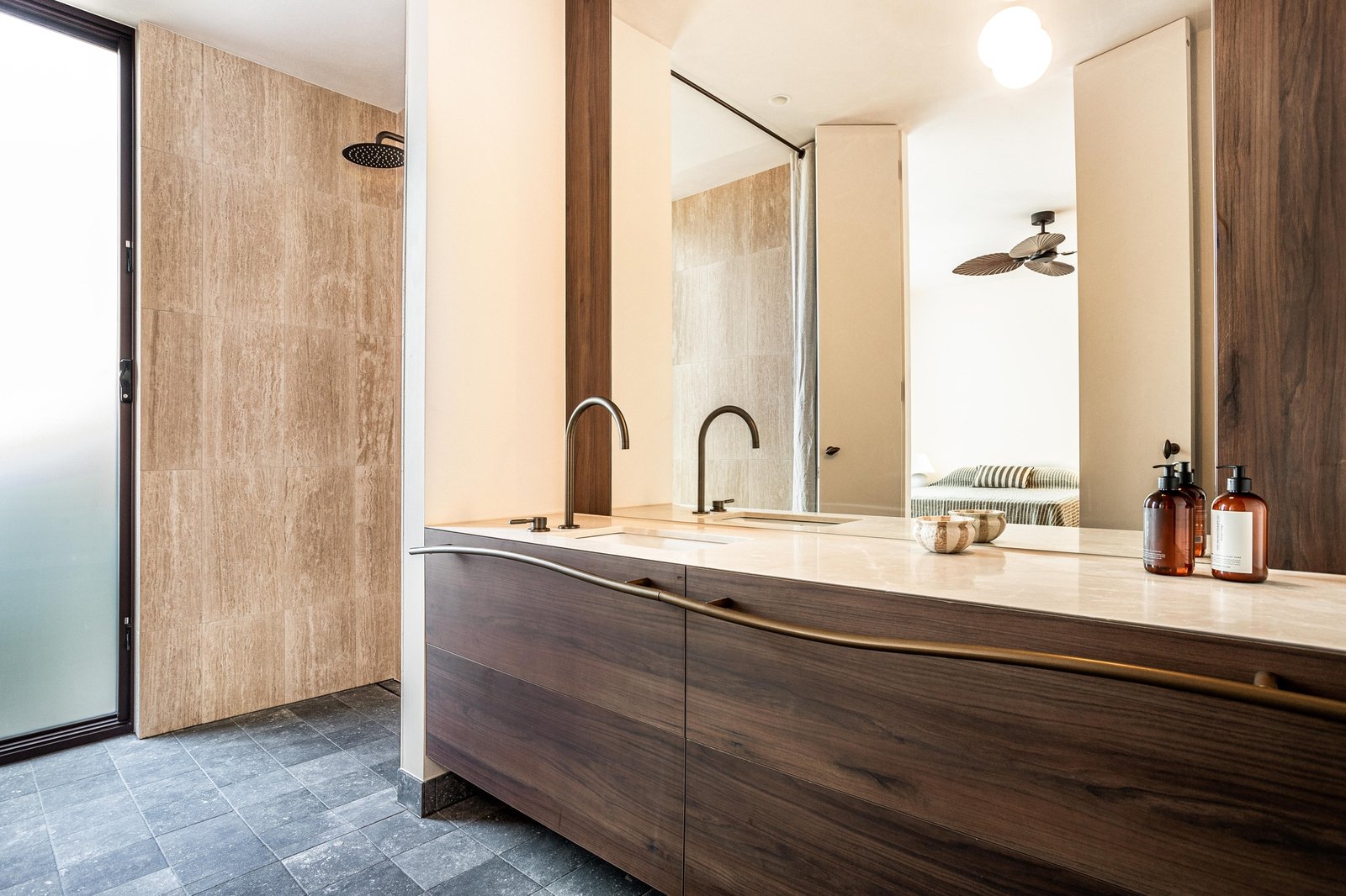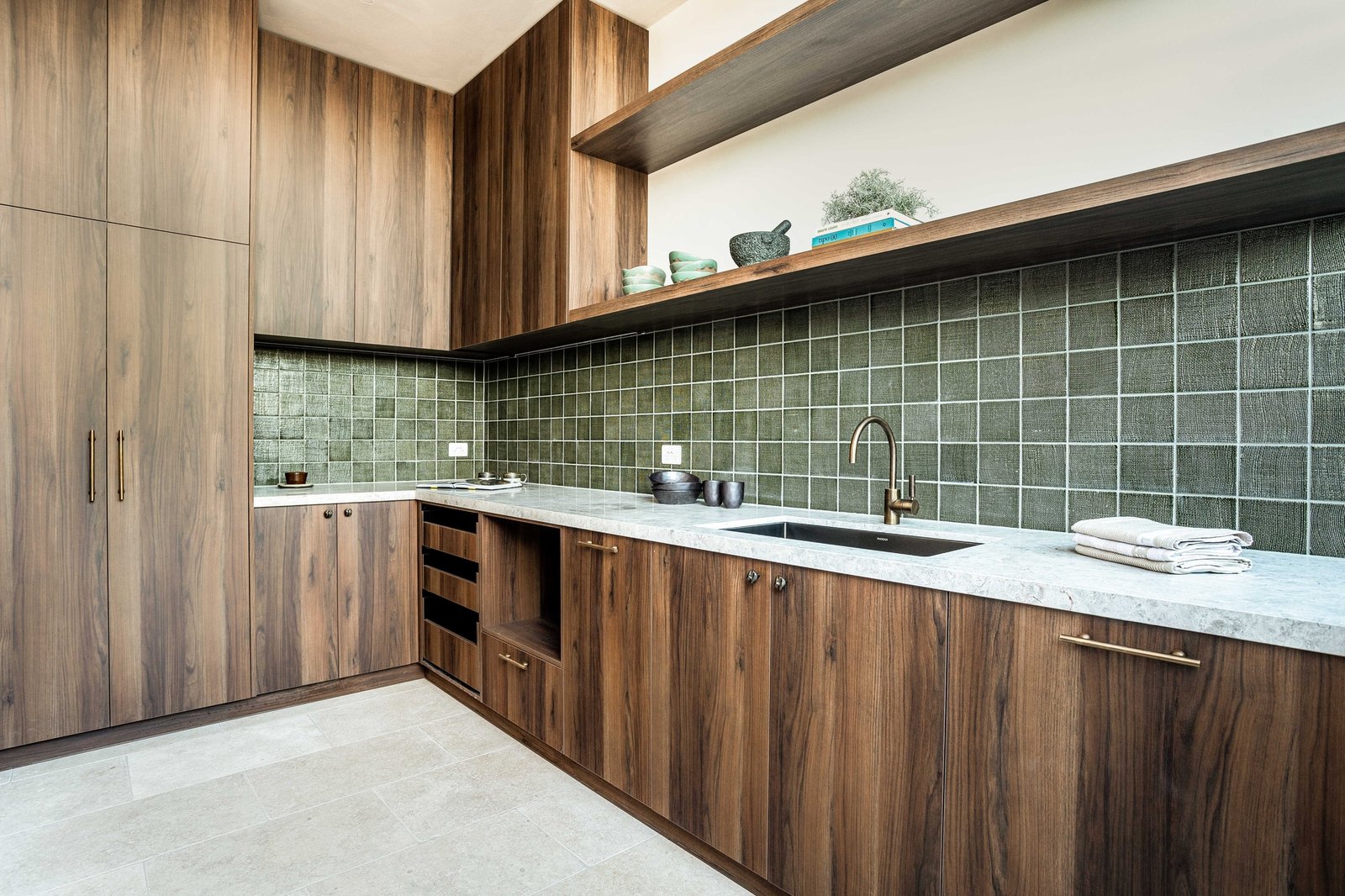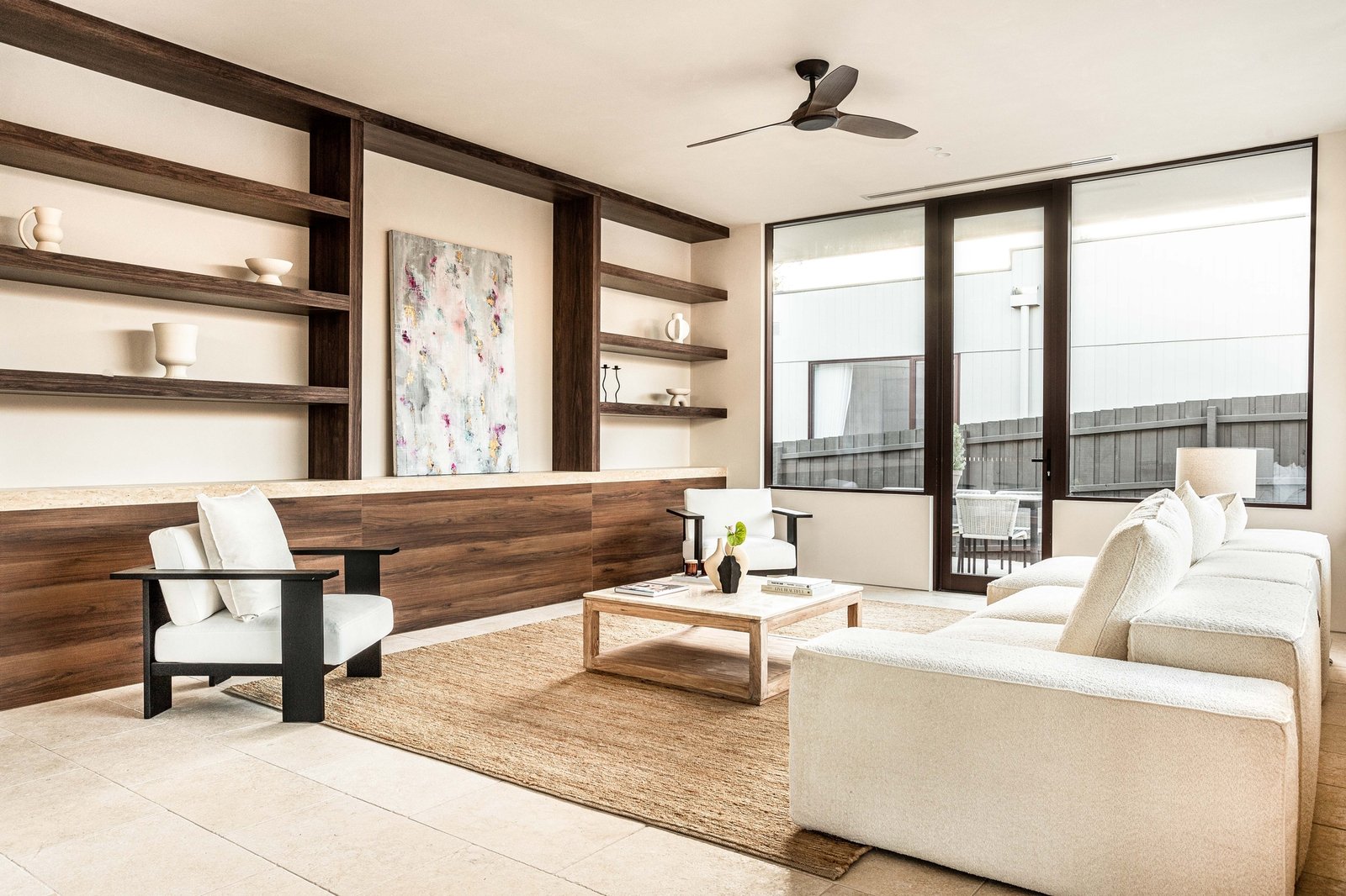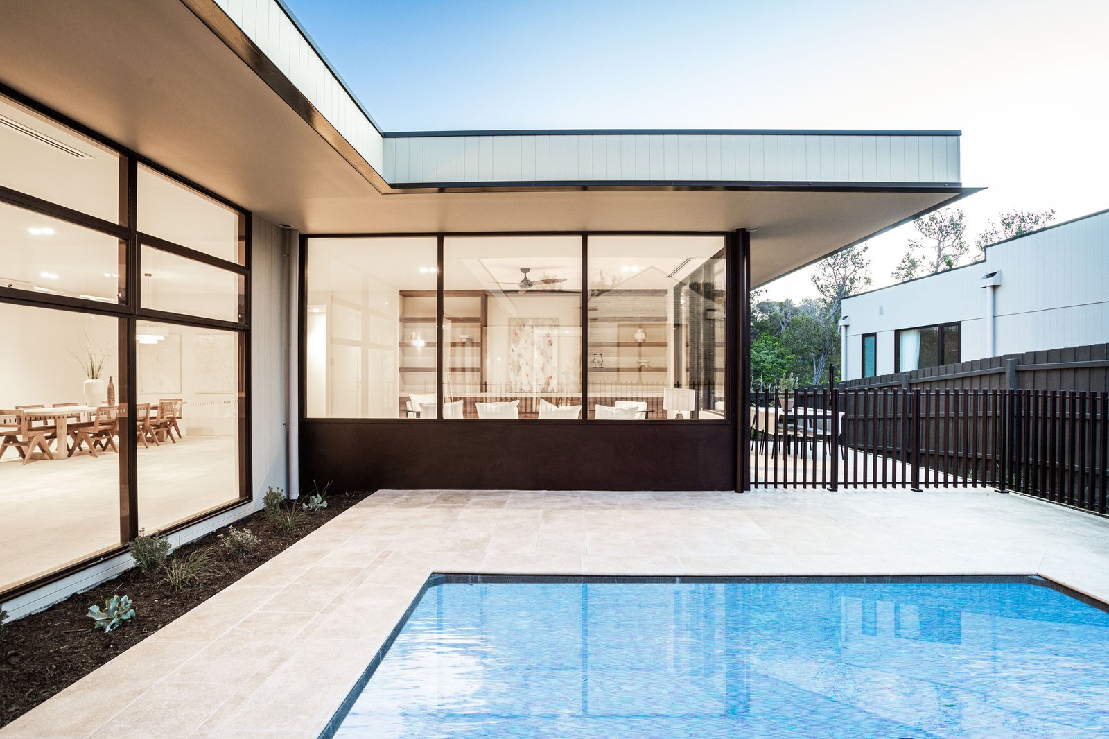 Beyond a striking façade of reclaimed brick, every detail has been executed with tactile precision. Thresholds flow without interruption beneath soaring three-metre ceilings and full-height doors, while underfloor hydronic heating warms the Brick-pattern Egyptian limestone across the main living spaces. Intelligent zoning provides privacy between four bedrooms and three refined bathrooms, including two rear main suites with indulgent en-suites. Turkish marble, natural stone, and limewashed wall and ceiling finishes bring visual continuity through open living and dining areas to a showpiece kitchen, appointed with Cosmic Black Brazilian stone, integrated Miele refrigeration, and premium Fisher & Paykel appliances. Outdoors, the landscaping celebrates the site's established Ti Tree and Moonah, layering in feature lighting, travertine pavers, an outdoor shower, and irrigation around a heated pool with spa jets, as well as a generous dining terrace.