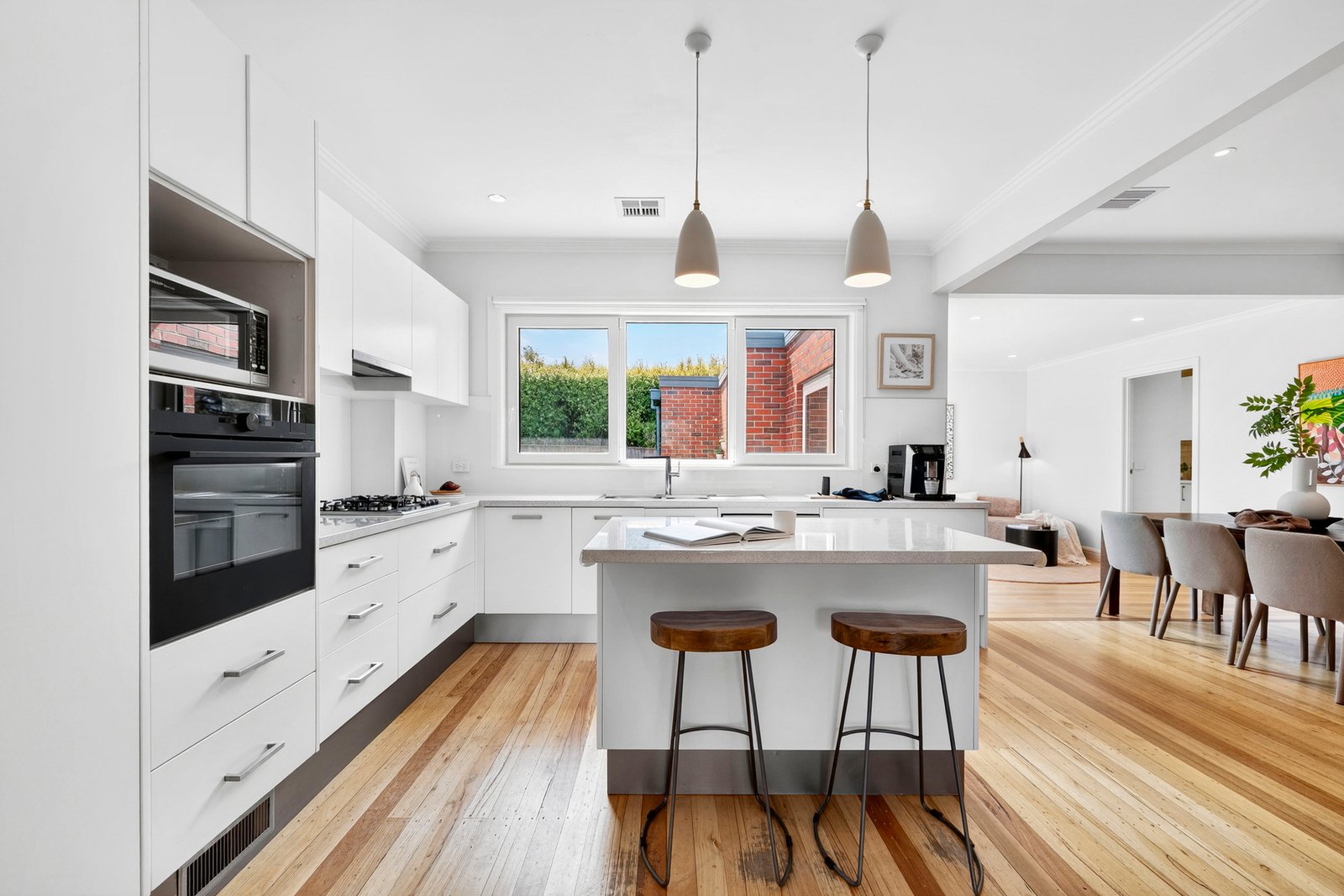 Anchored by a joyfully bright kitchen with a NEFF gas stovetop, AEG steam oven, dishwasher and terrific storage, this home boasts a living room in addition to a lounge room that flows onto the bluestone paved alfresco dining. Supported by a separate laundry and a guest powder room.