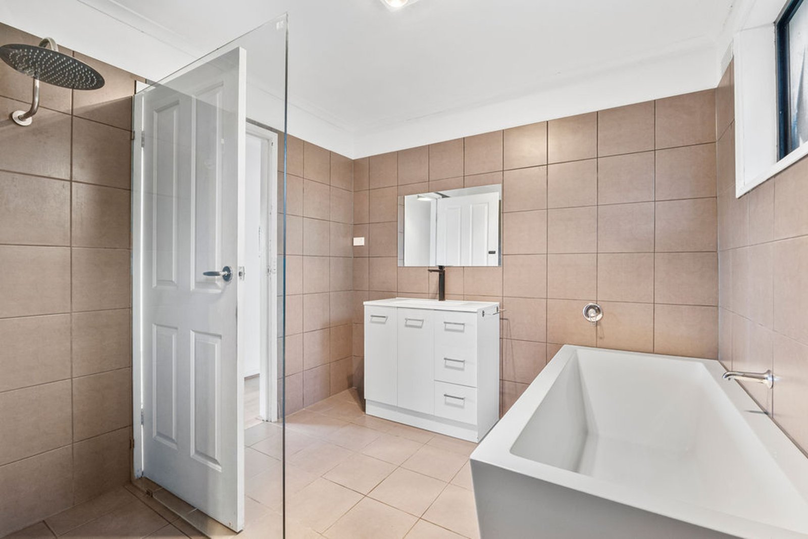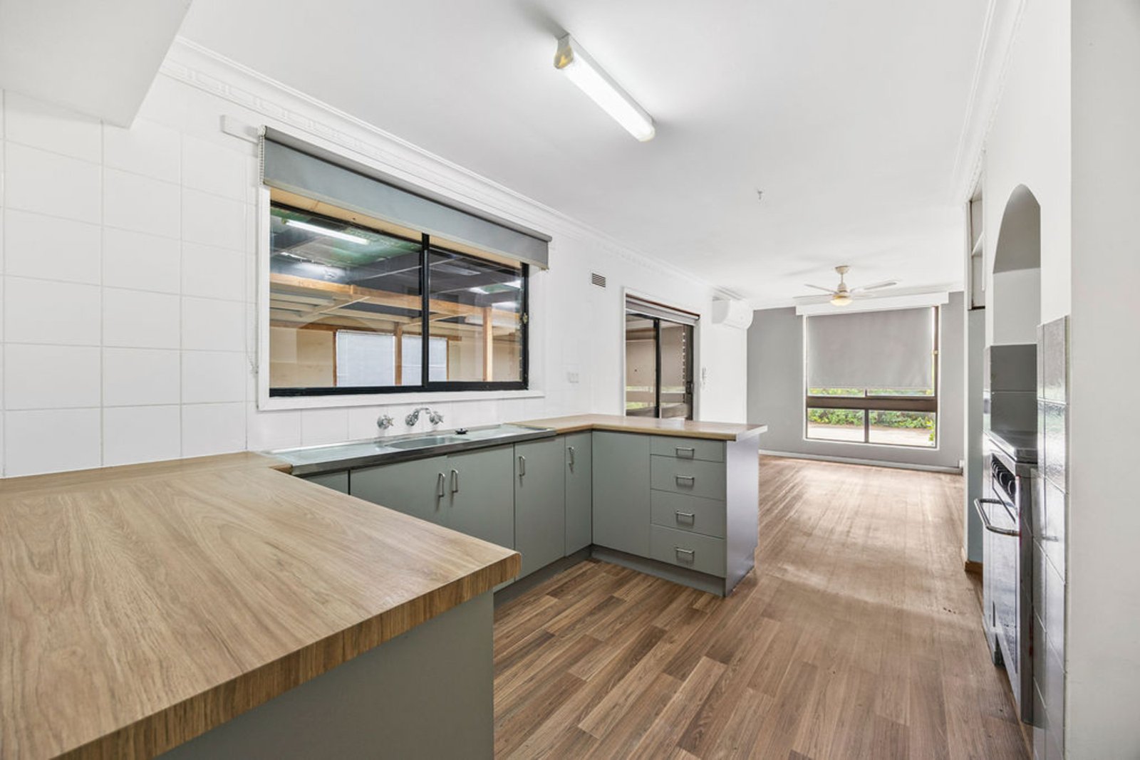 Inside, the home features three bedrooms, each with built-in robes and ceiling fans. The living room is warm and inviting with a wood fire and fan, creating a cosy space for the cooler months. The updated kitchen impresses with its stylish wood-like benchtops, 600mm oven, and modern finishes, while the renovated bathroom includes a bath, shower, single vanity, and sleek tiles from floor to ceiling.