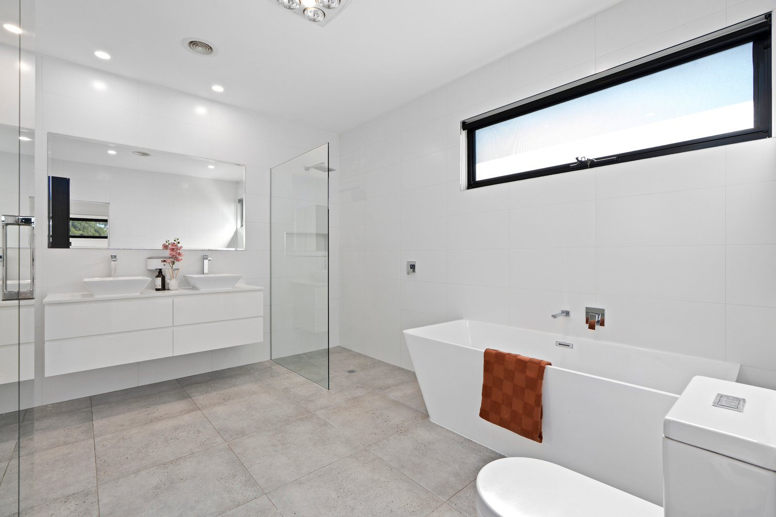 -Family-sized bathroom with frameless shower & floor-to-ceiling tiles