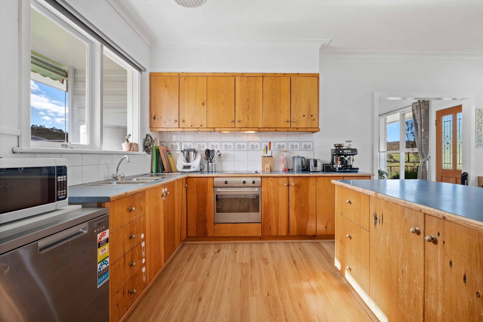 The Kitchen dining and living room are the perfect place for family and friends to come together. The kitchen includes a dishwasher electric oven and cooktop and timber cabinetry. Two split systems, a wood heater and ceiling fans ensure comfort year-round, complemented by a 22-panel (5.9kW) solar system with dual inverters and mains power.